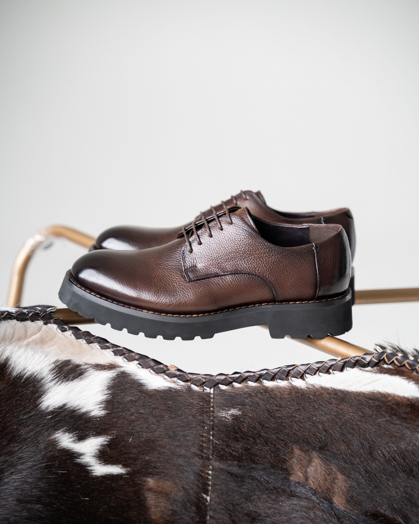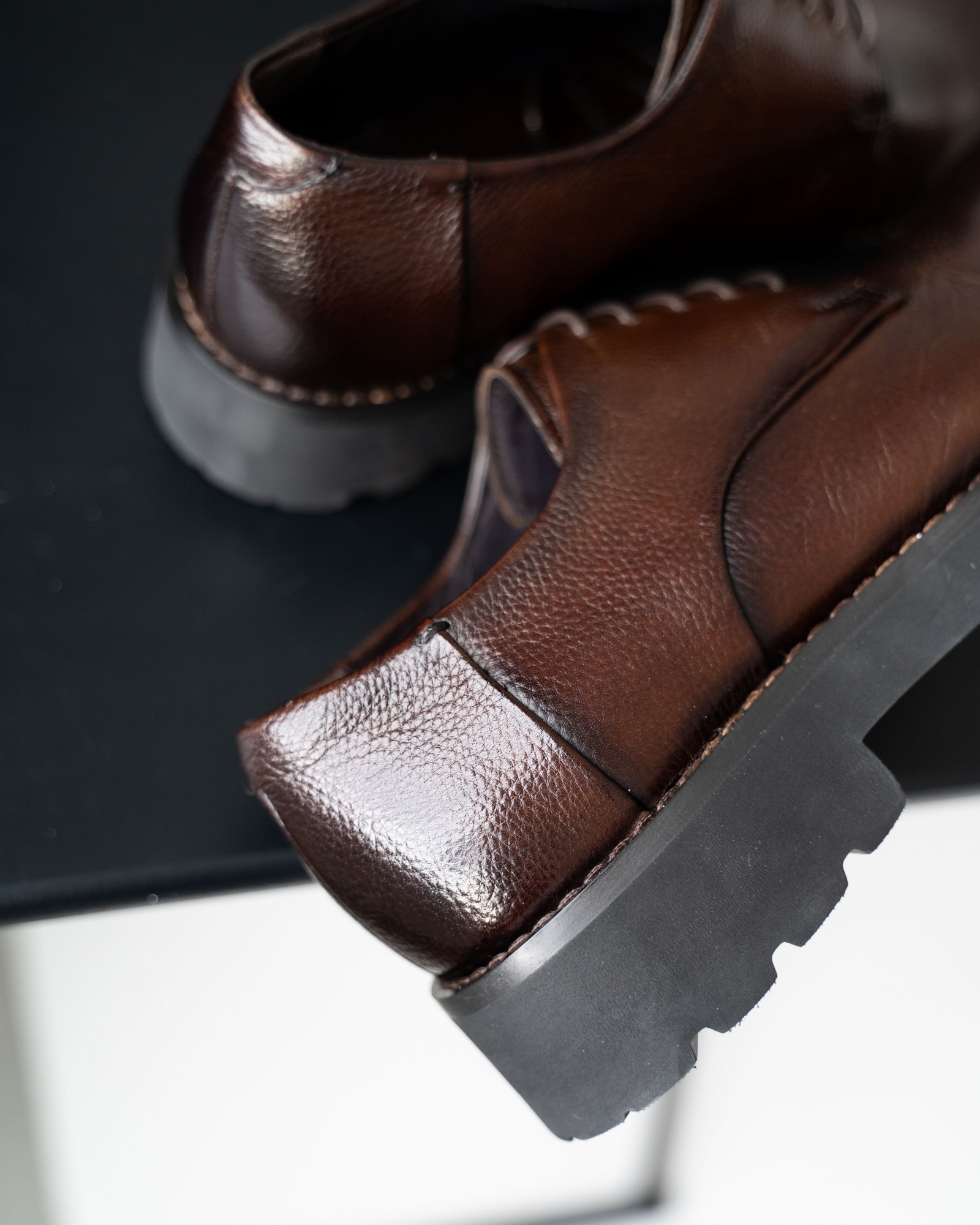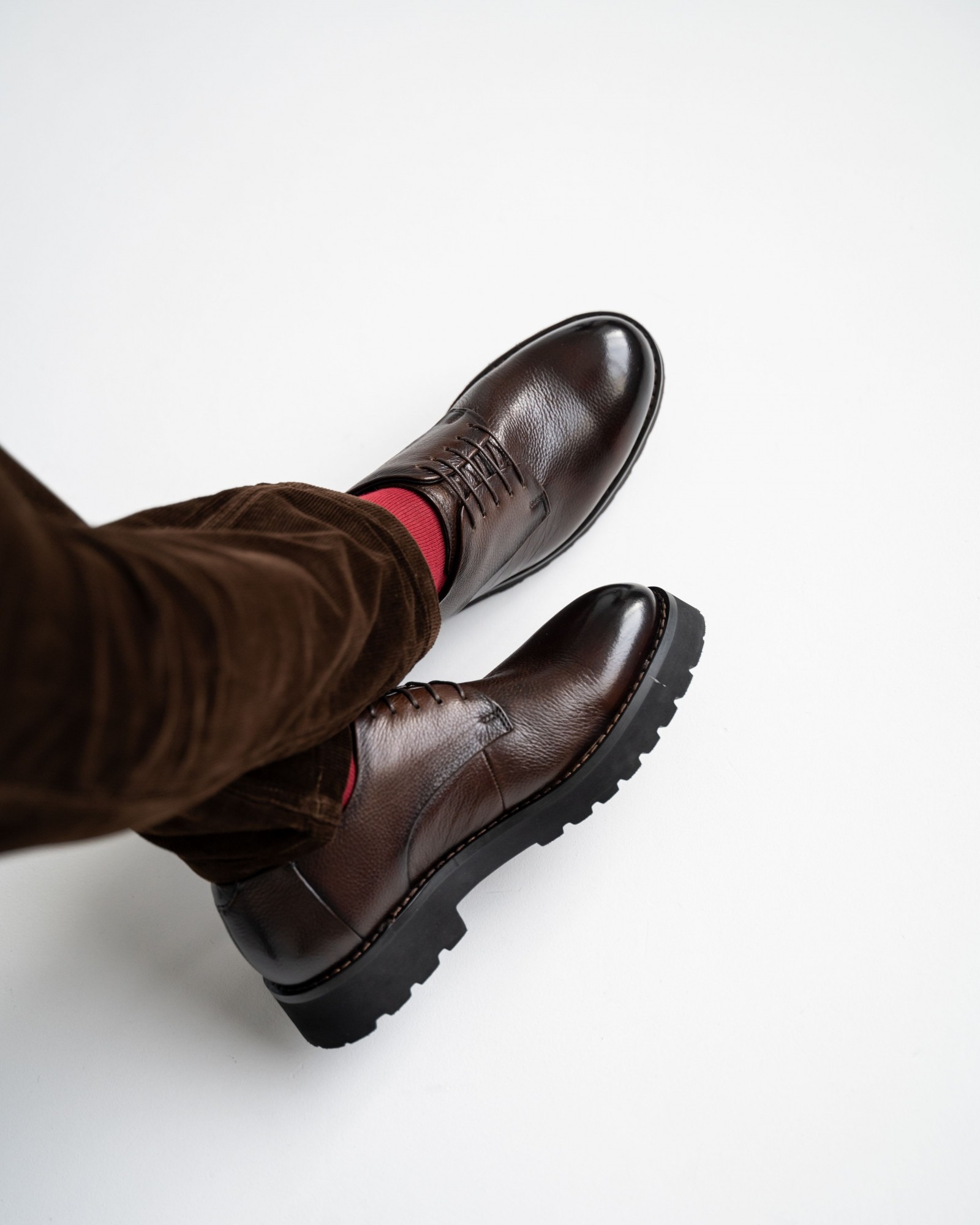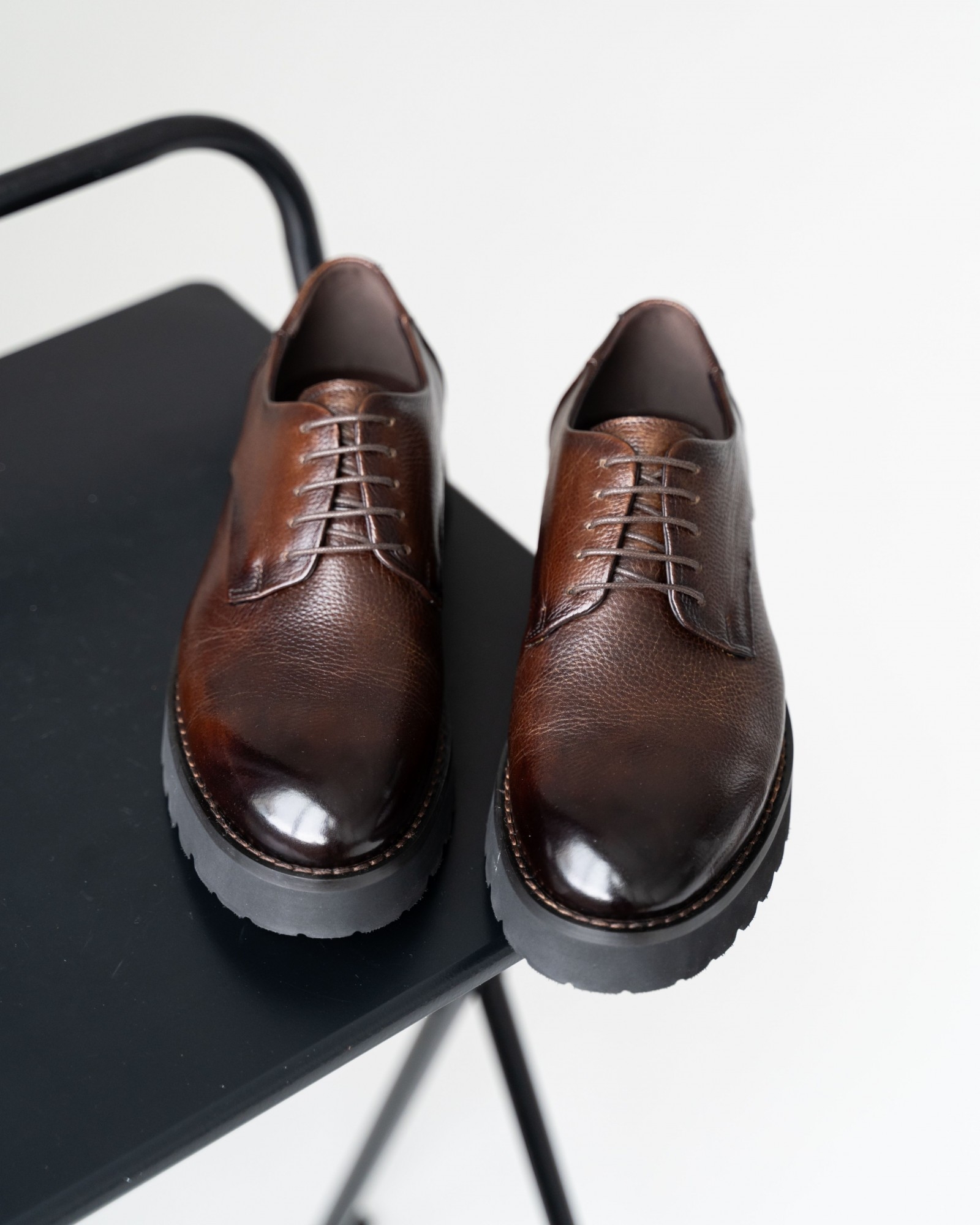 1. **Выразительный характер:** коричневая кожа с лёгким блеском и фактурной поверхностью подчёркивает силу формы и придаёт обуви уверенный, мужской акцент.