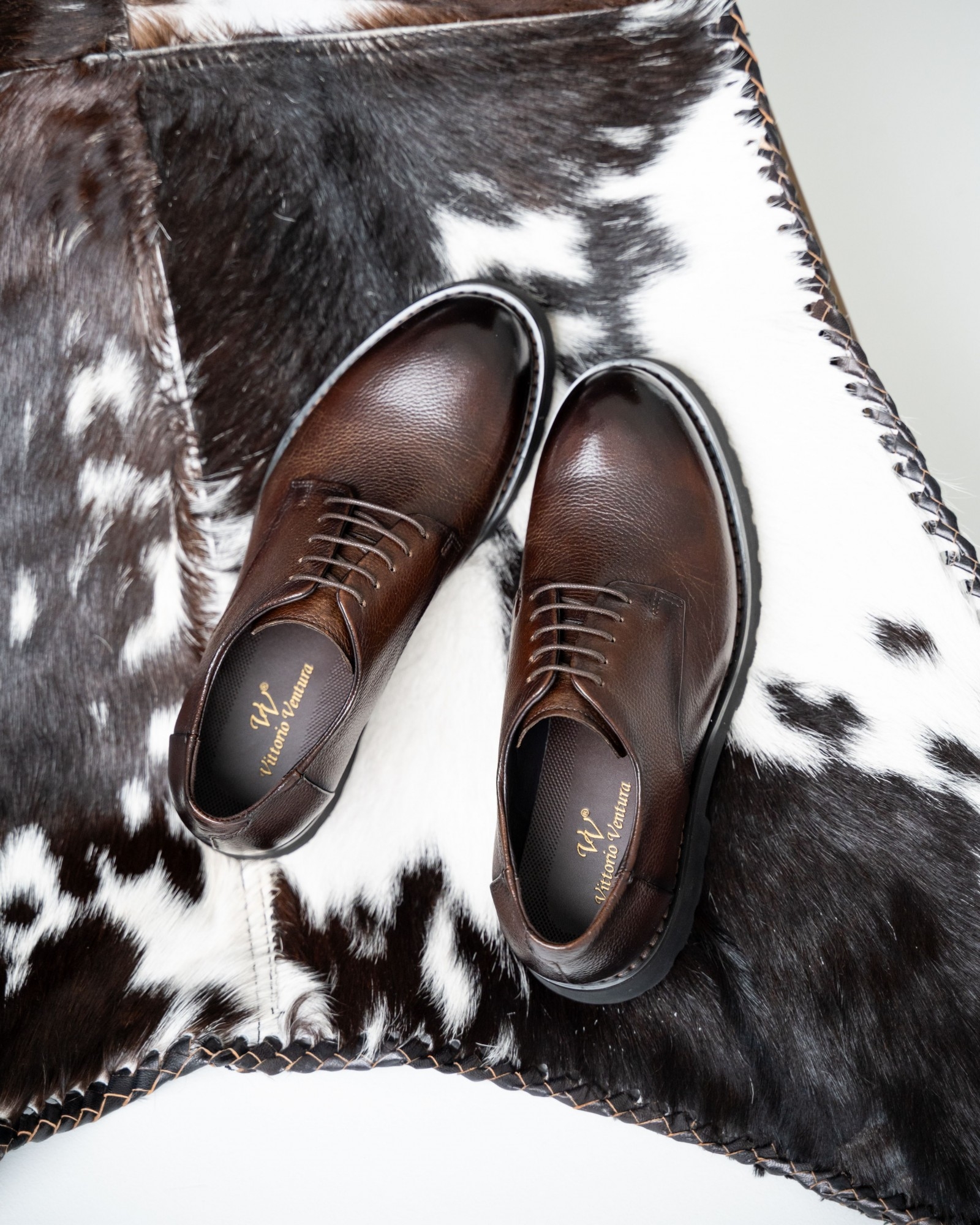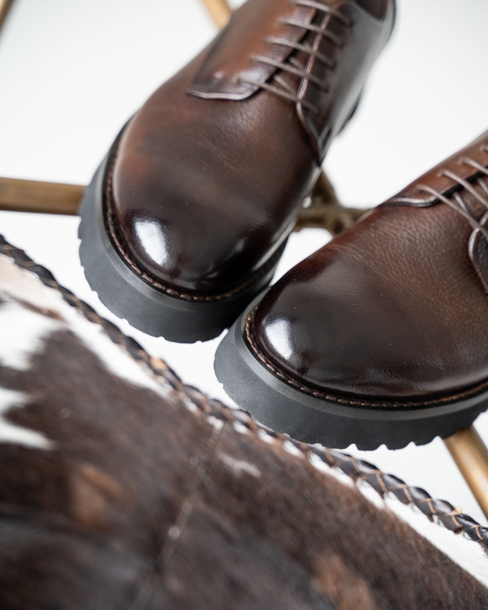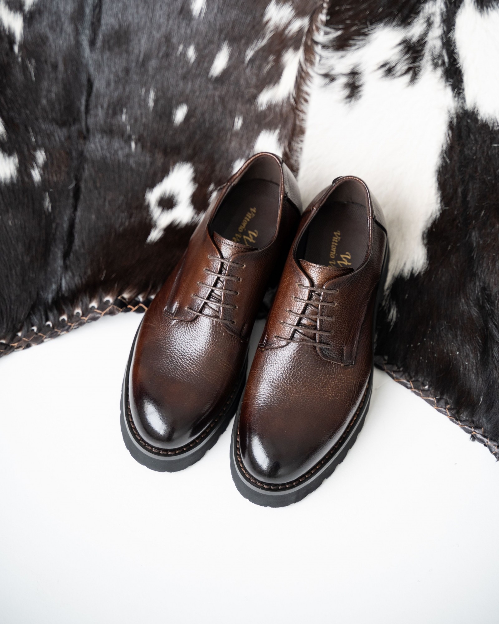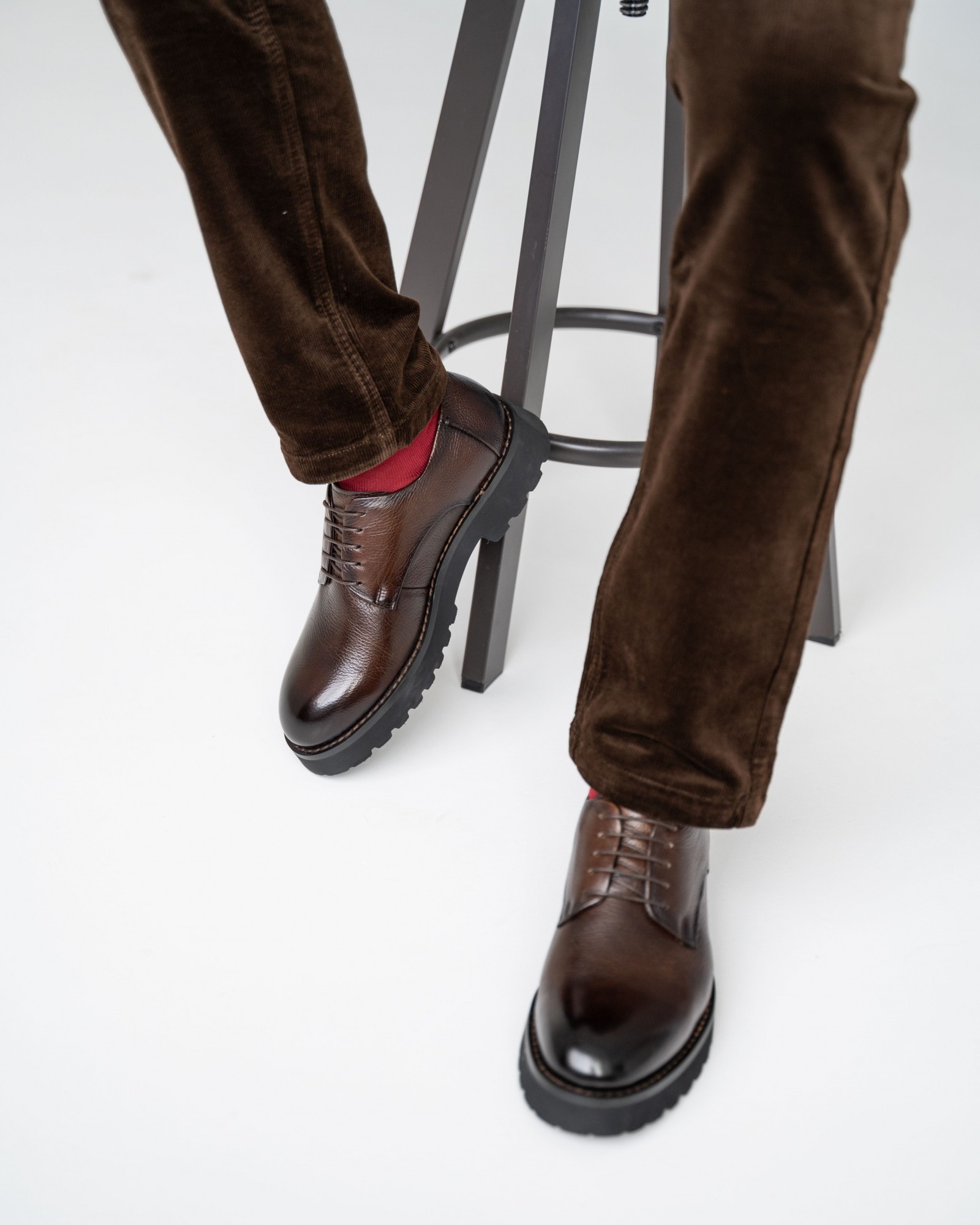 1. **Выразительный характер:** коричневая кожа с лёгким блеском и фактурной поверхностью подчёркивает силу формы и придаёт обуви уверенный, мужской акцент.