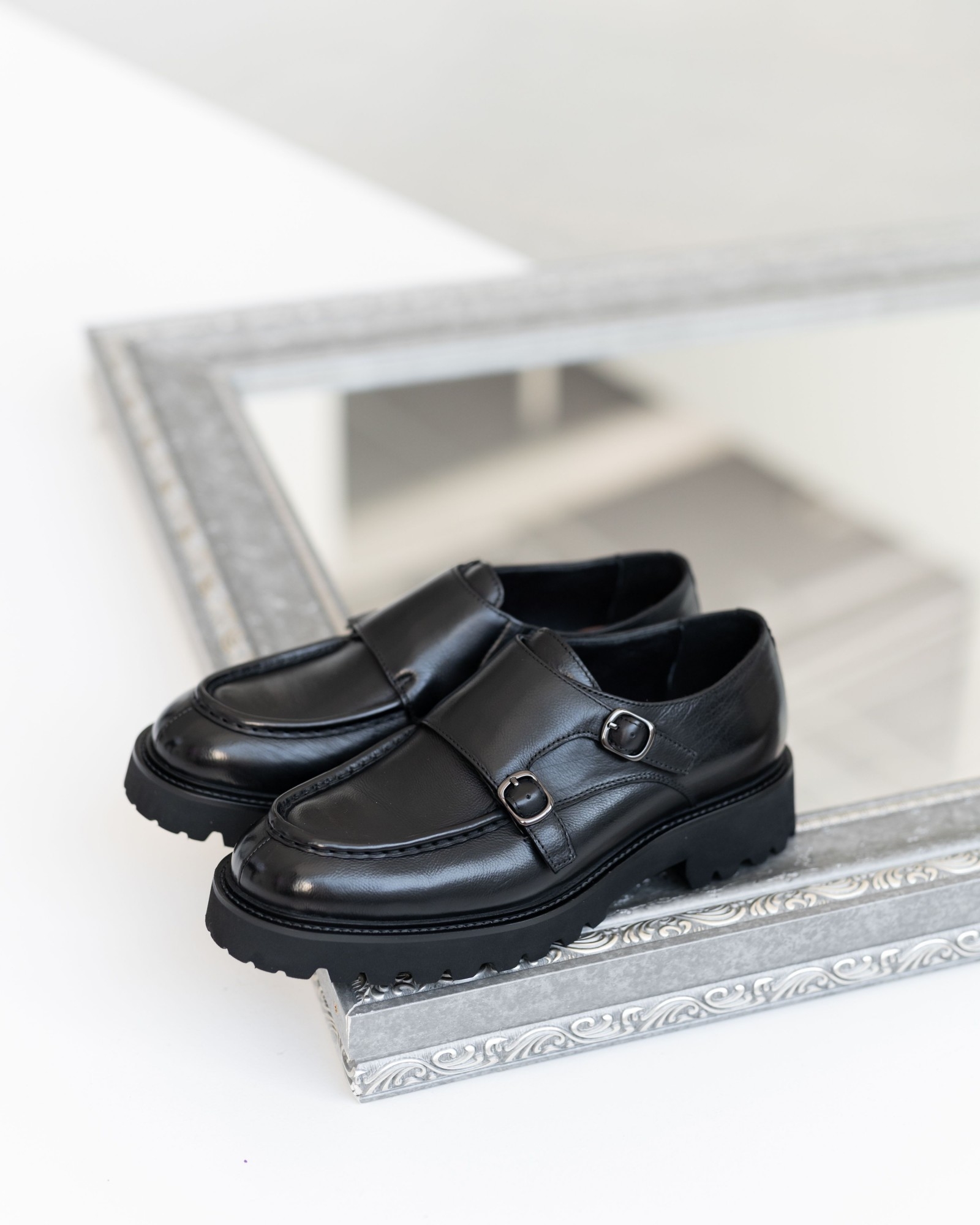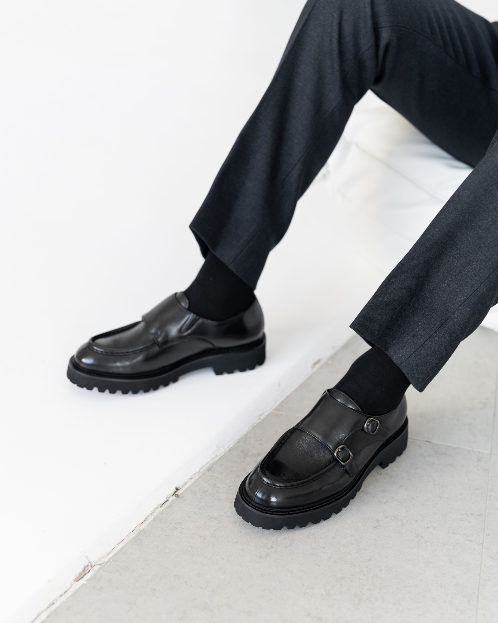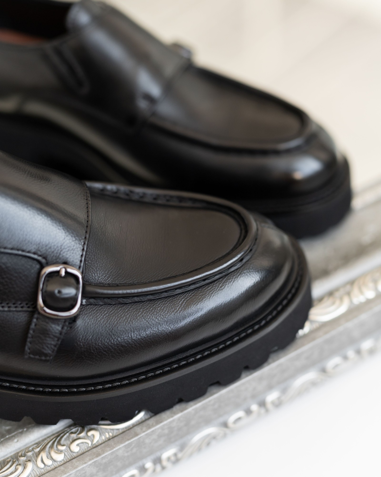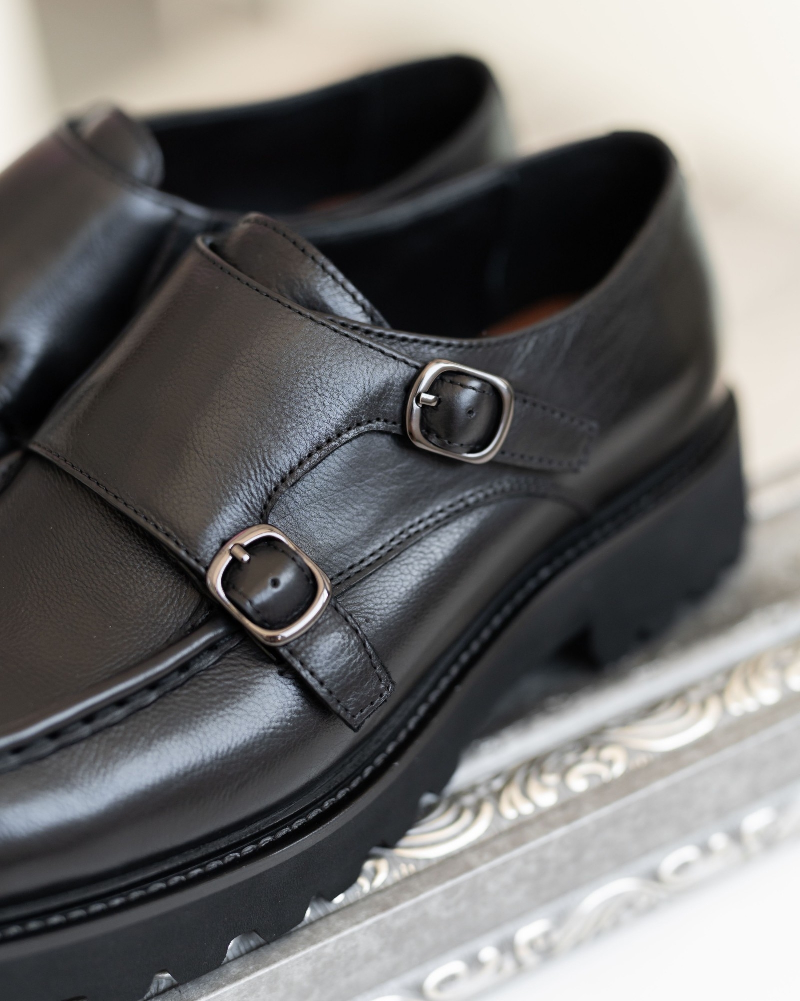 Классика, которая получила современное переосмысление. Эти чёрные монки с двойной застёжкой выполнены из гладкой премиальной кожи, обработанной для сохранения естественного блеска и долговечности. Подошва из лёгкого, но прочного полиуретанового материала с протектором обеспечивает отличное сцепление и амортизацию при каждом шаге. Форма колодки продумана для комфортной посадки даже при длительной носке. Модель сочетает элегантность и брутальность, позволяя уверенно выделяться как в строгом офисе, так и на оживлённой городской улице.