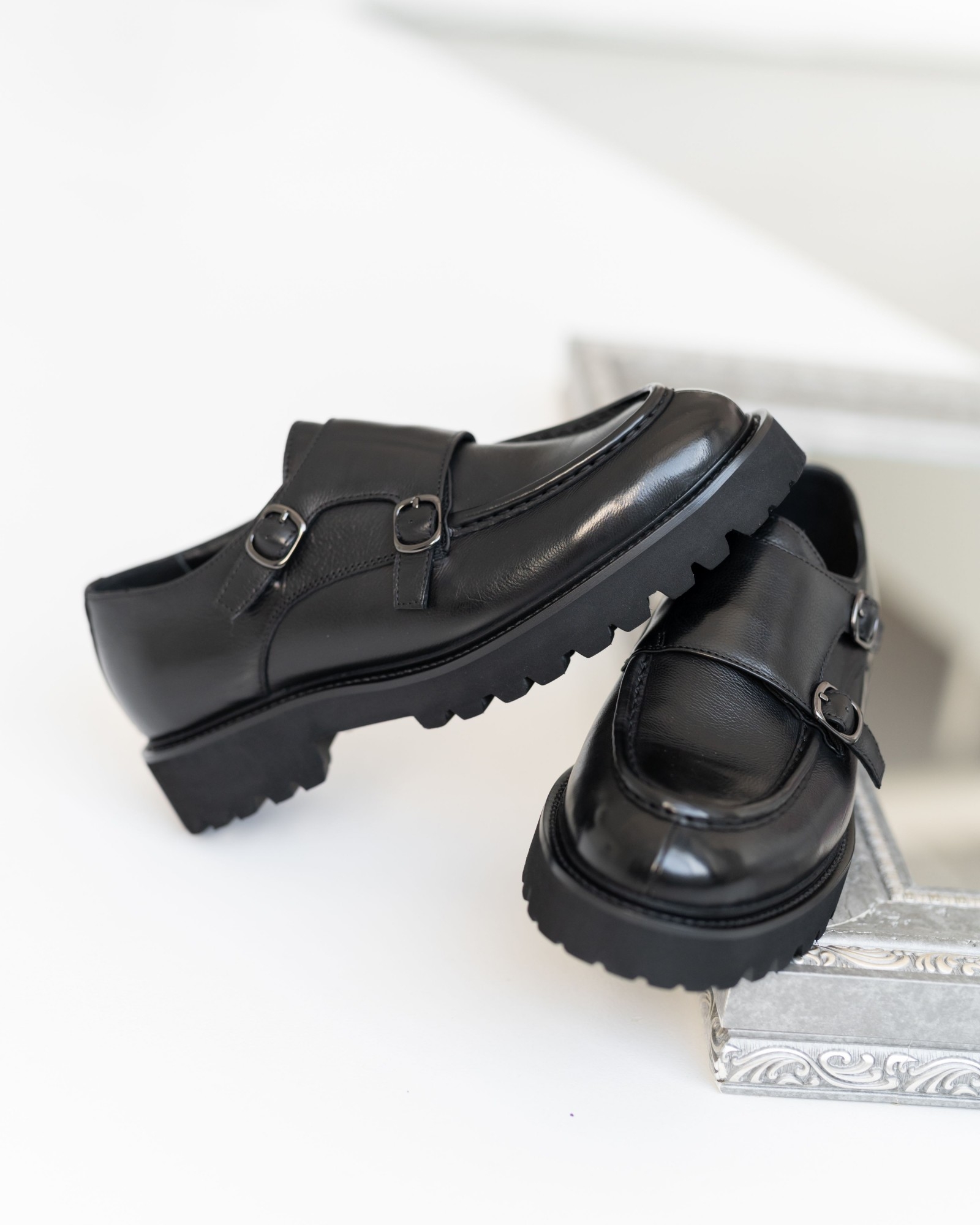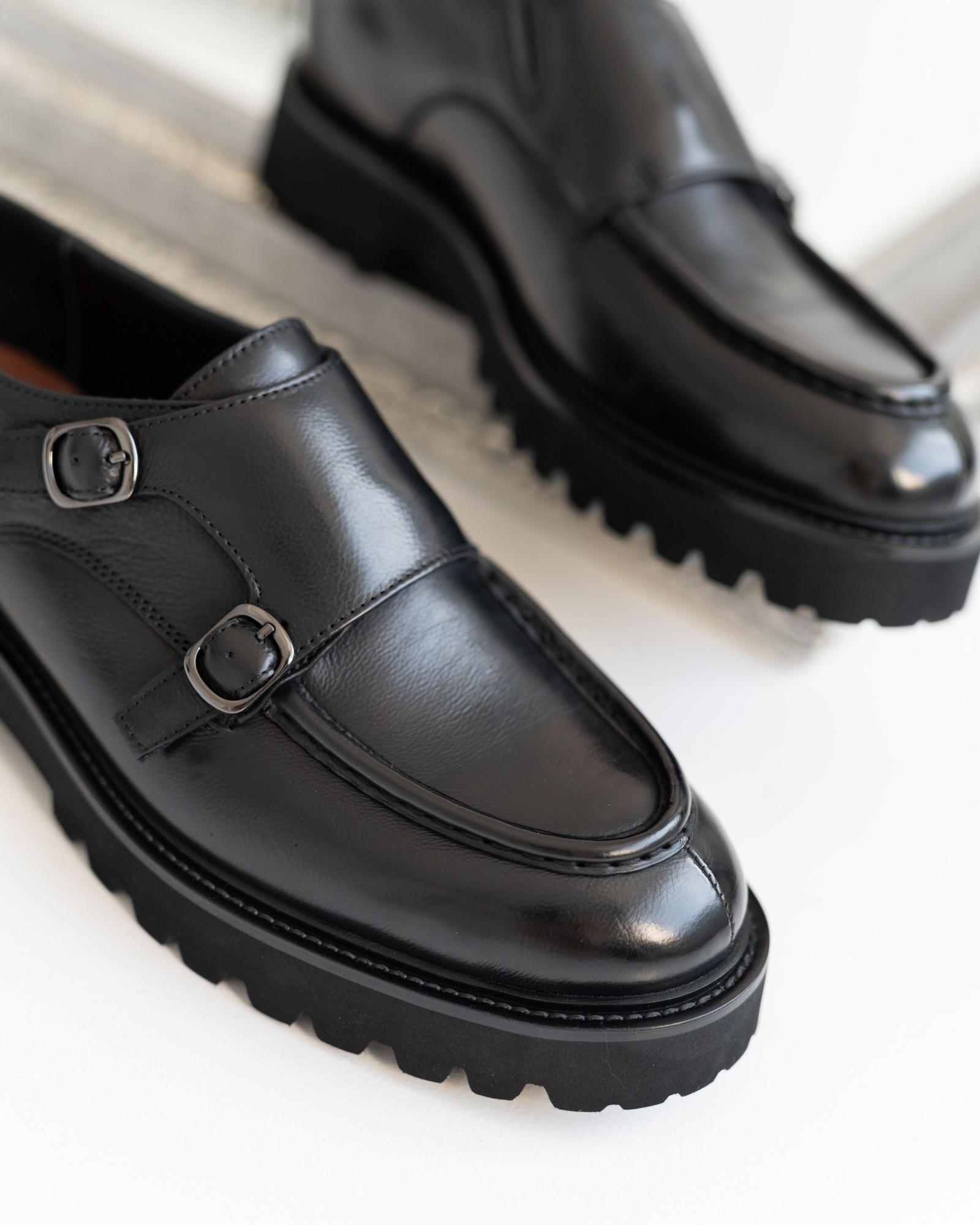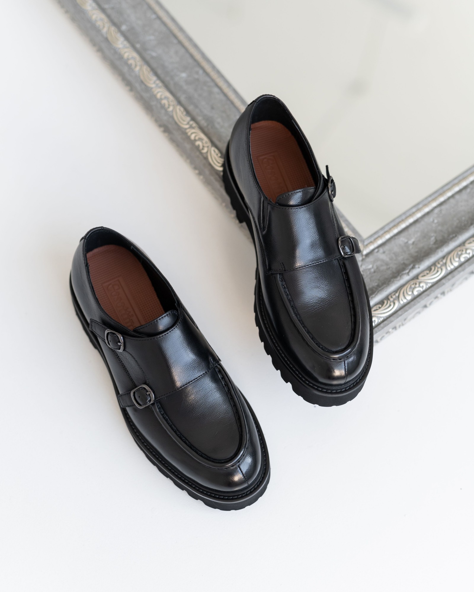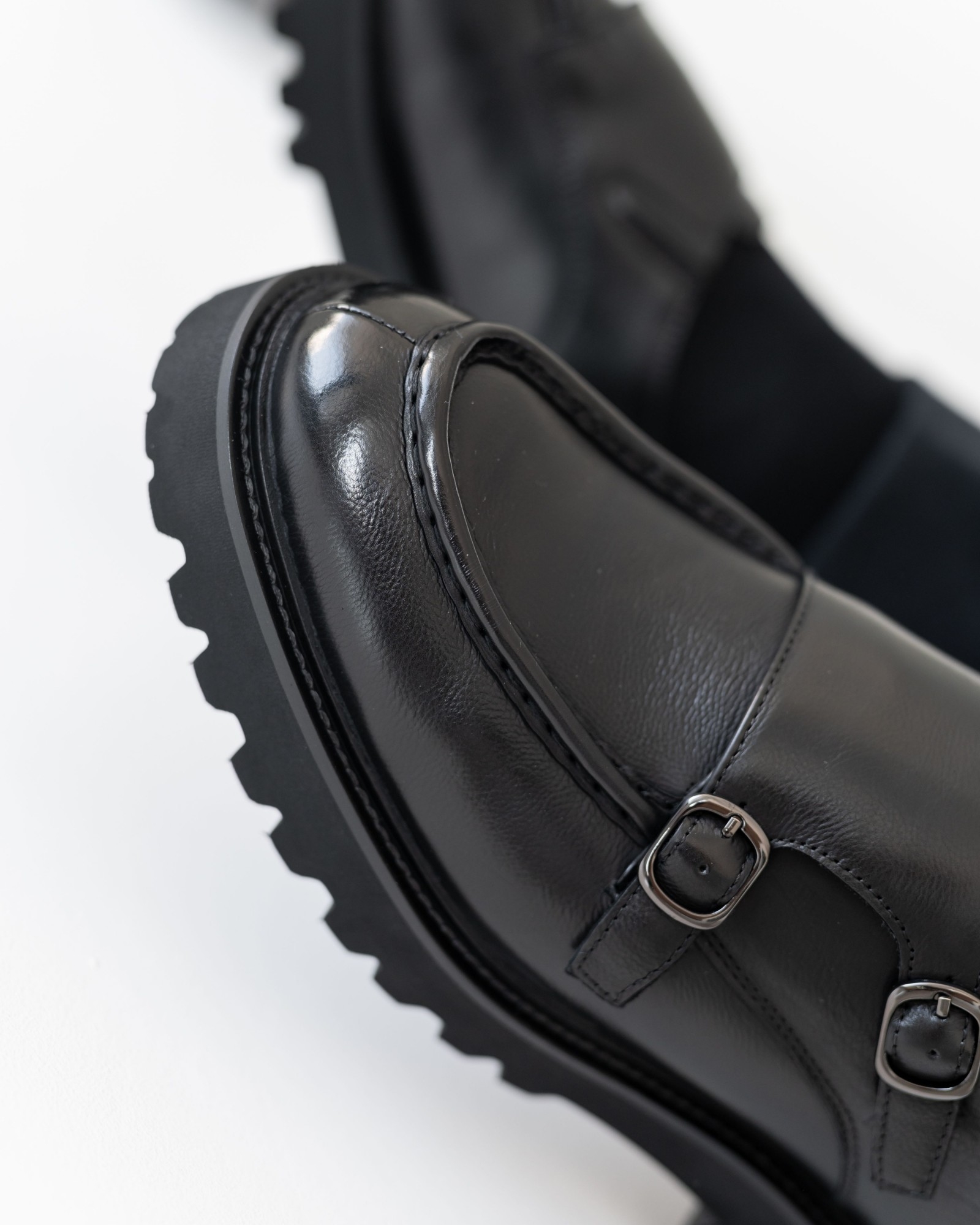 Классика, которая получила современное переосмысление. Эти чёрные монки с двойной застёжкой выполнены из гладкой премиальной кожи, обработанной для сохранения естественного блеска и долговечности. Подошва из лёгкого, но прочного полиуретанового материала с протектором обеспечивает отличное сцепление и амортизацию при каждом шаге. Форма колодки продумана для комфортной посадки даже при длительной носке. Модель сочетает элегантность и брутальность, позволяя уверенно выделяться как в строгом офисе, так и на оживлённой городской улице.