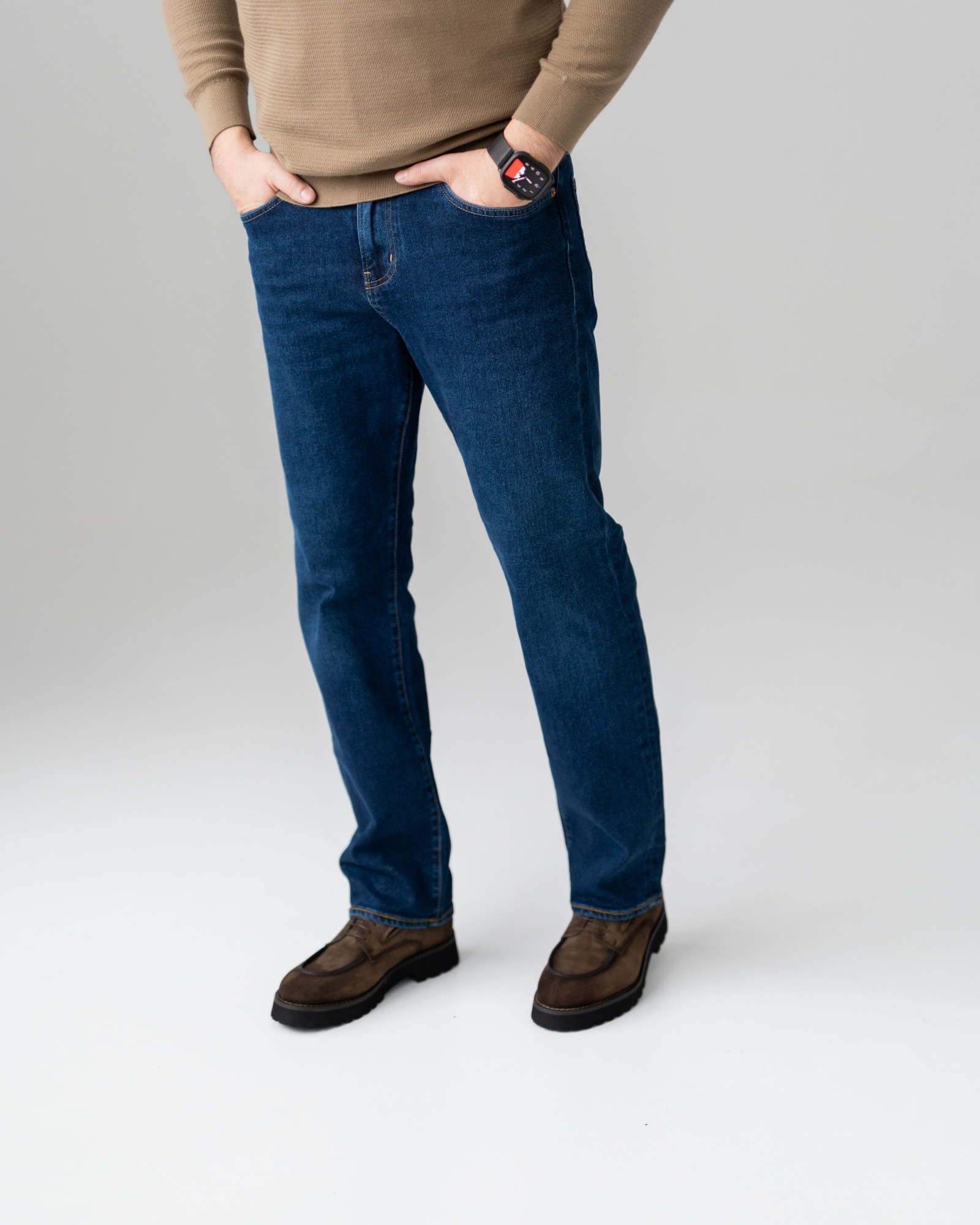 Тёмно-синие или серые брюки чинос, светлый свитер с интересной фактурой и длинное пальто рыжево-коричневого оттенка. Образ остаётся структурированным, а дерби добавляют энергичный, модный акцент.
