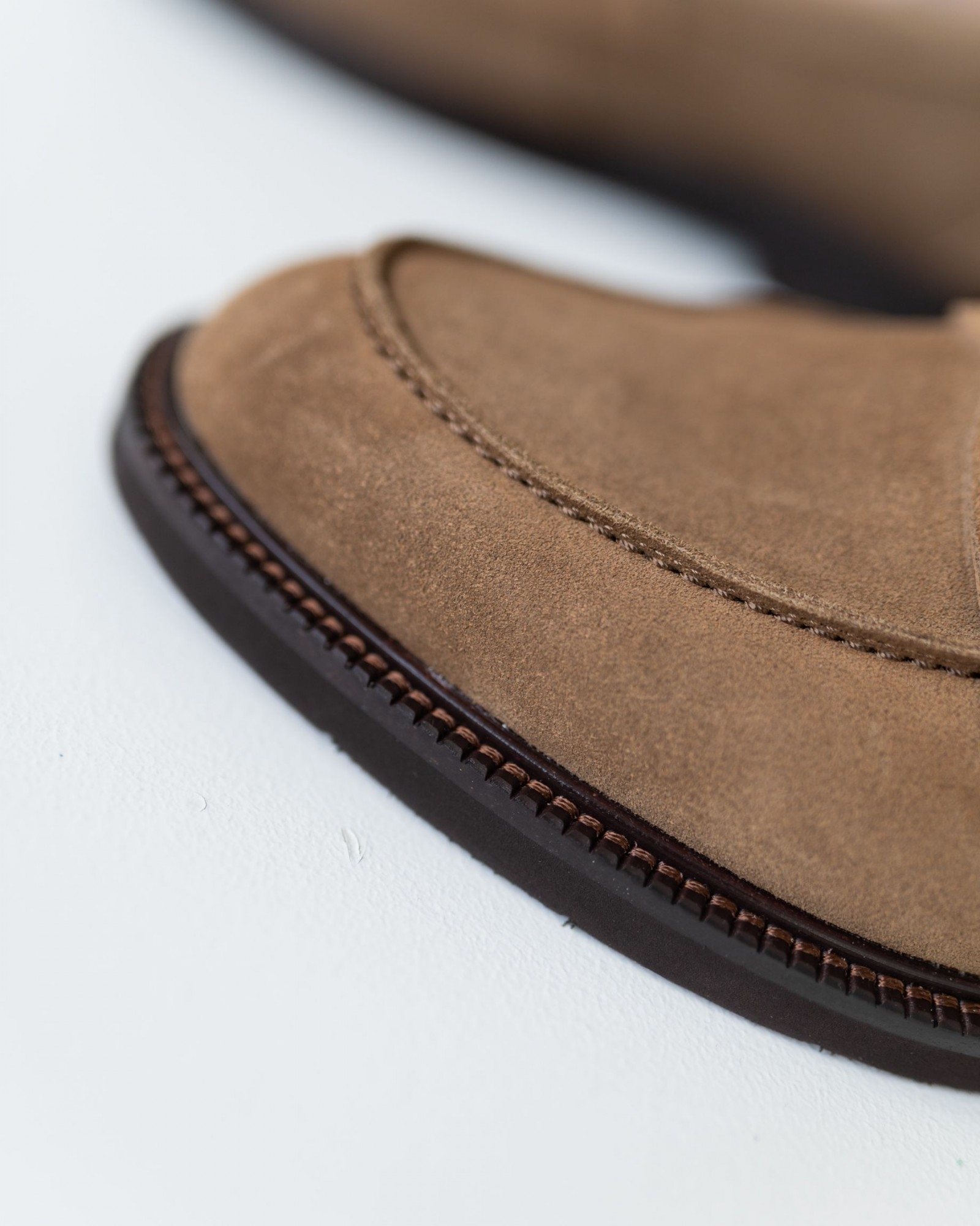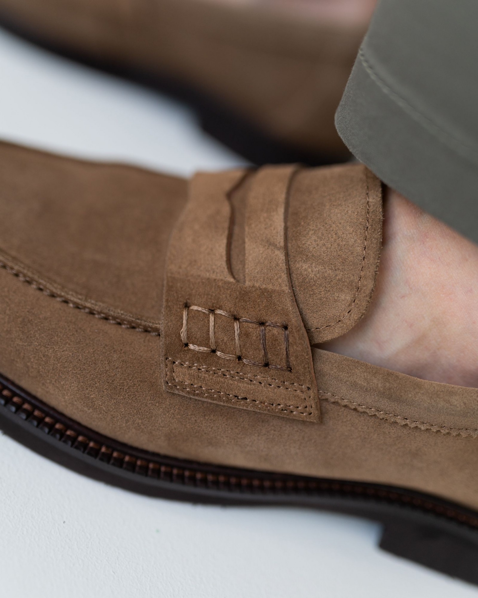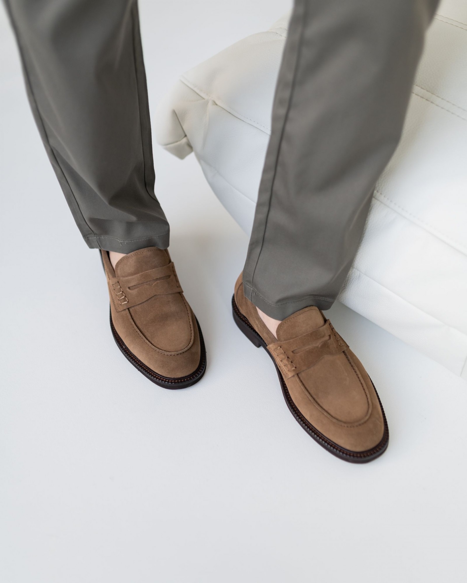 Рыжие замшевые лоферы на тёмно-коричневой подошве — лёгкие, элегантные и универсальные. Классический силуэт сочетается с мягкостью замши, создавая комфорт при каждом шаге. Гибкая подошва с минимальным весом делает модель удобной для повседневной носки. Органично дополняют как классический костюм, так и современные свободные брюки. Идеальный выбор для стильных образов в любое время года.