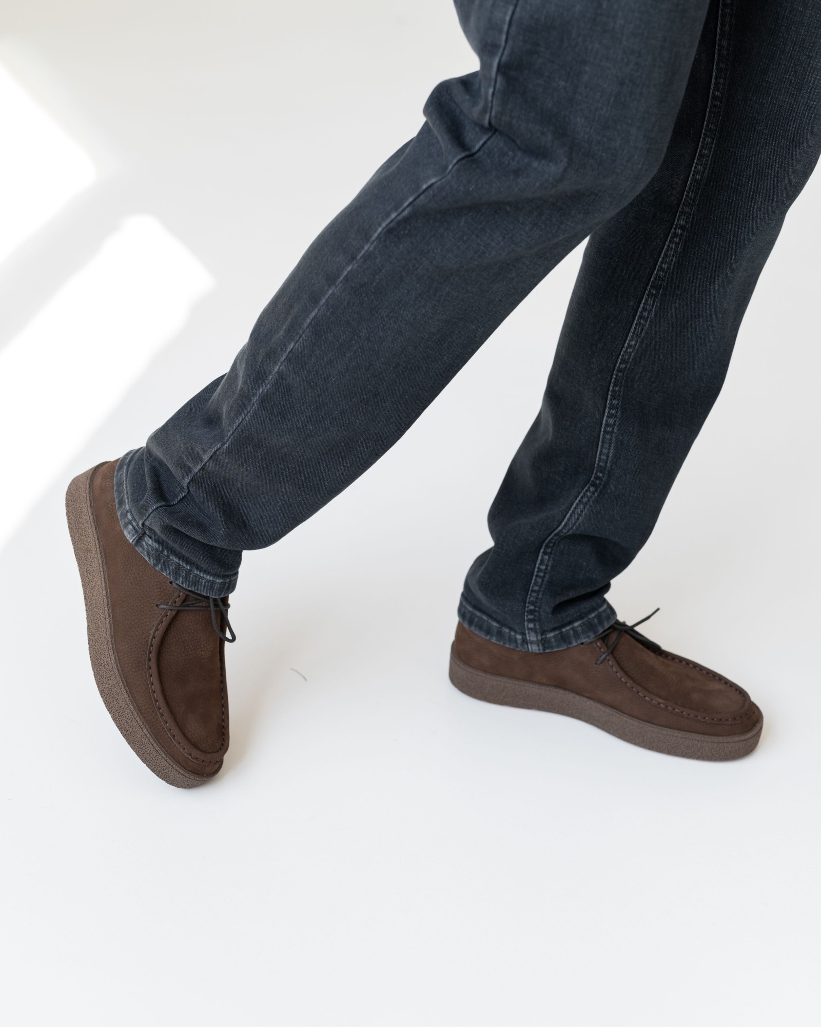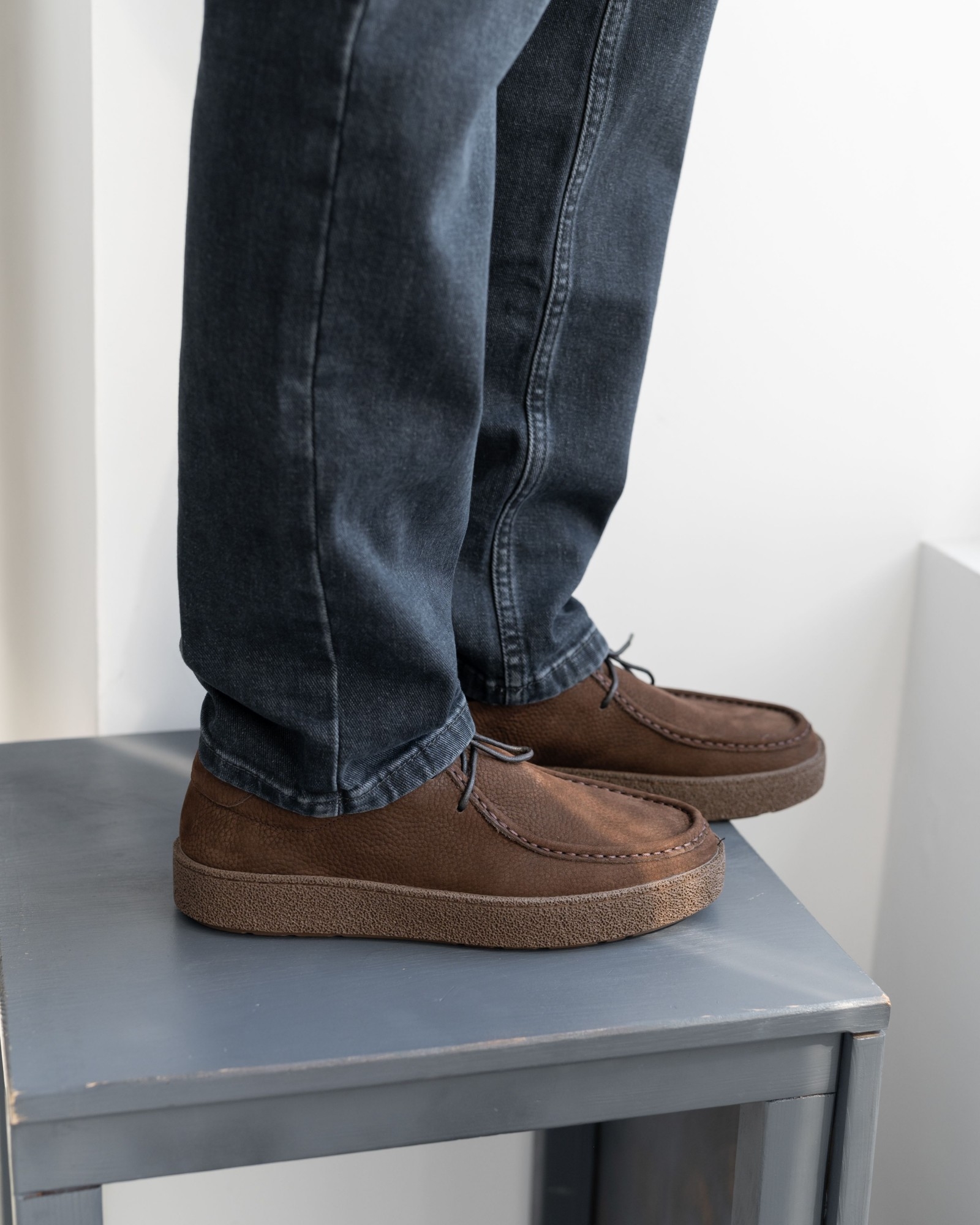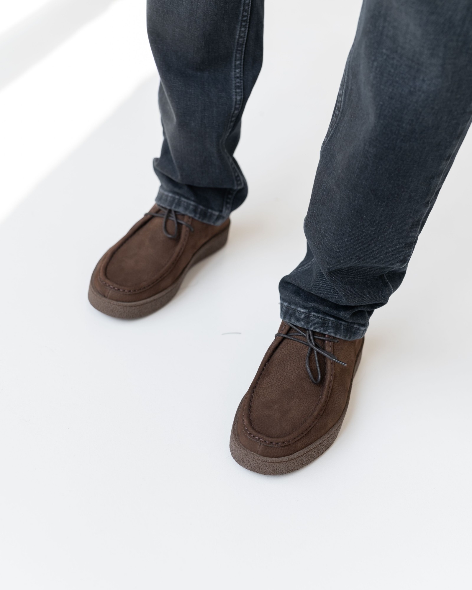 Эта осенняя версия классических мокасин выполнена из качественного коричневого нубука с аккуратной шнуровкой и более выраженным швом на носовой части, который придаёт паре брутальный и выразительный характер. Подошва выполнена в тон с основной кожей, создавая гармоничный и цельный образ.