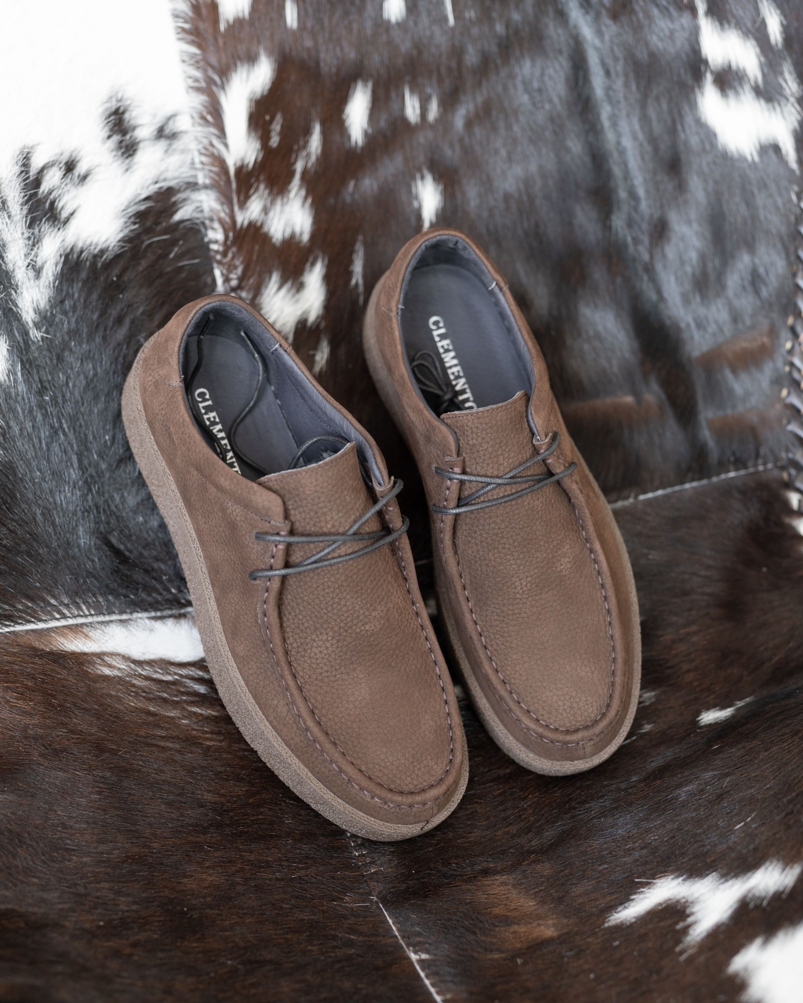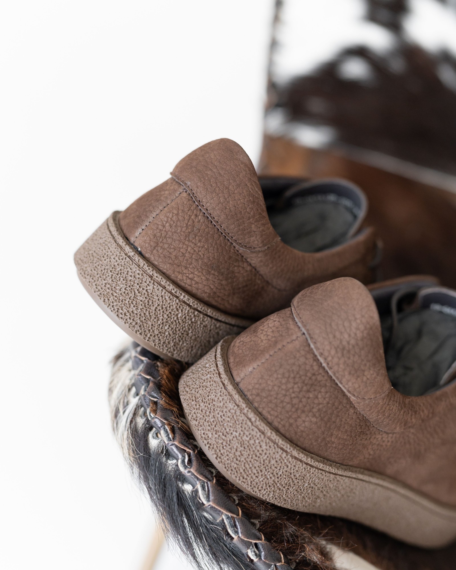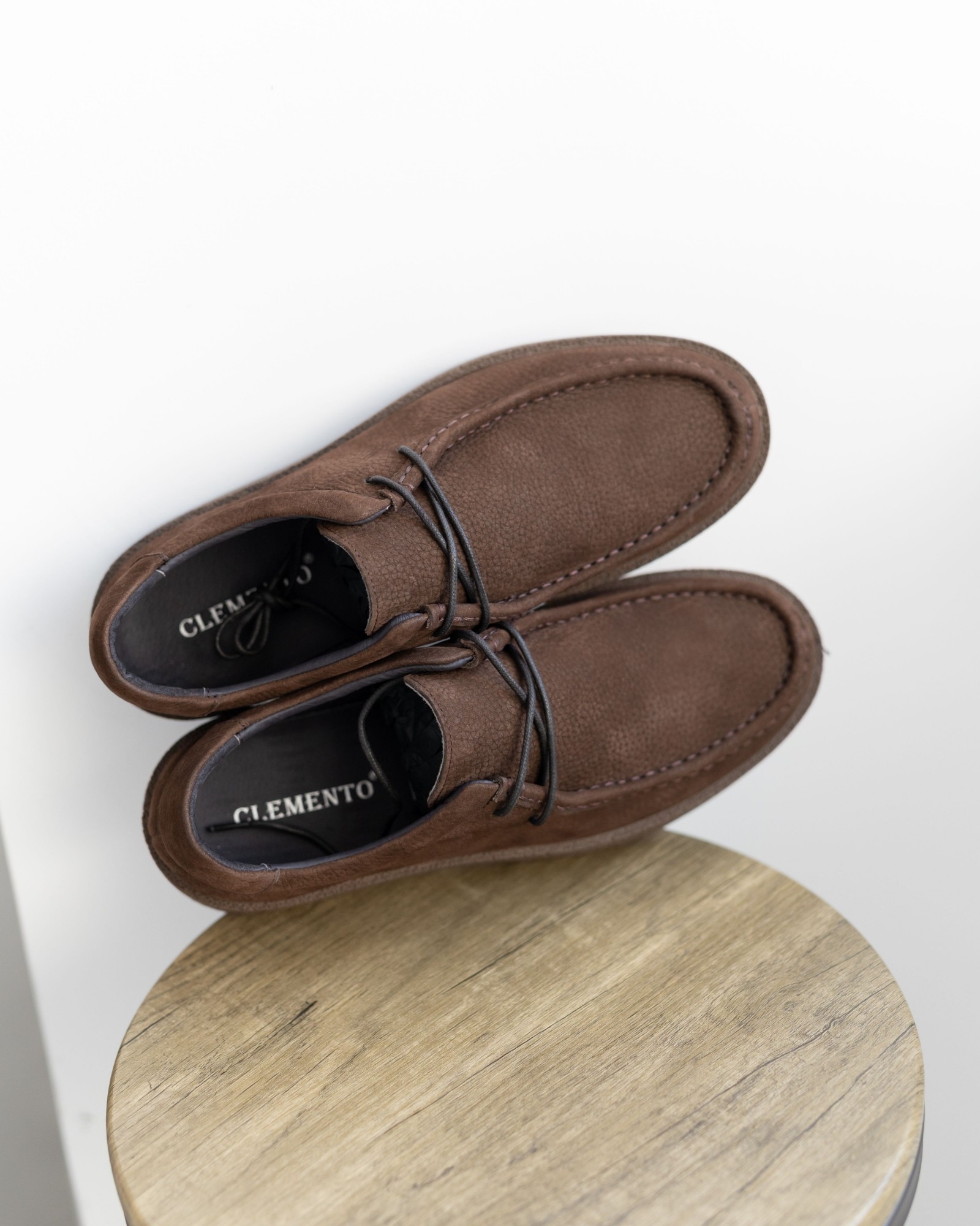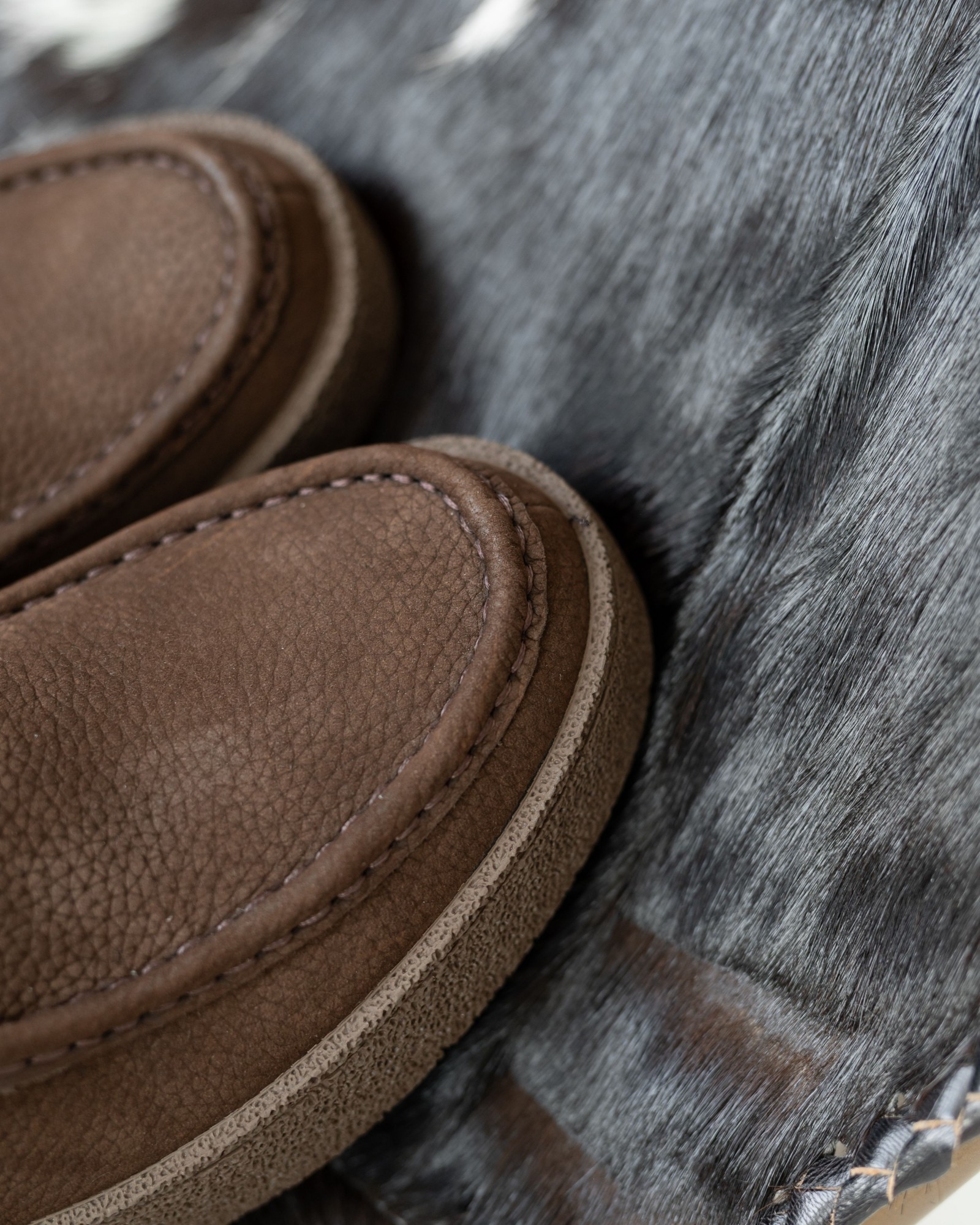 Эта осенняя версия классических мокасин выполнена из качественного коричневого нубука с аккуратной шнуровкой и более выраженным швом на носовой части, который придаёт паре брутальный и выразительный характер. Подошва выполнена в тон с основной кожей, создавая гармоничный и цельный образ.