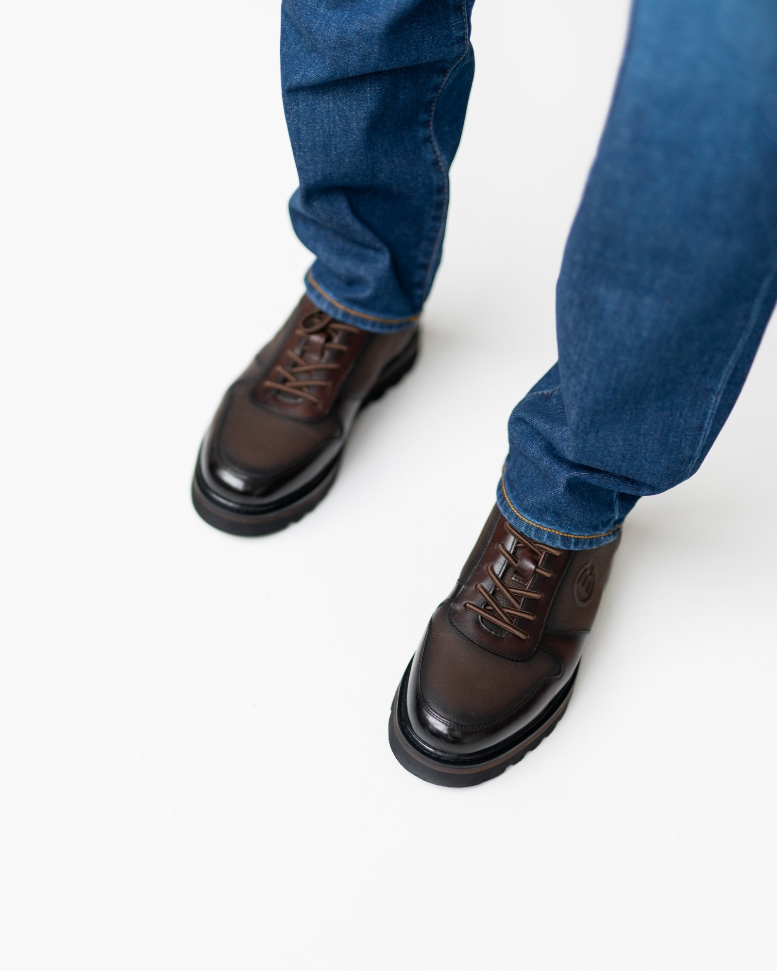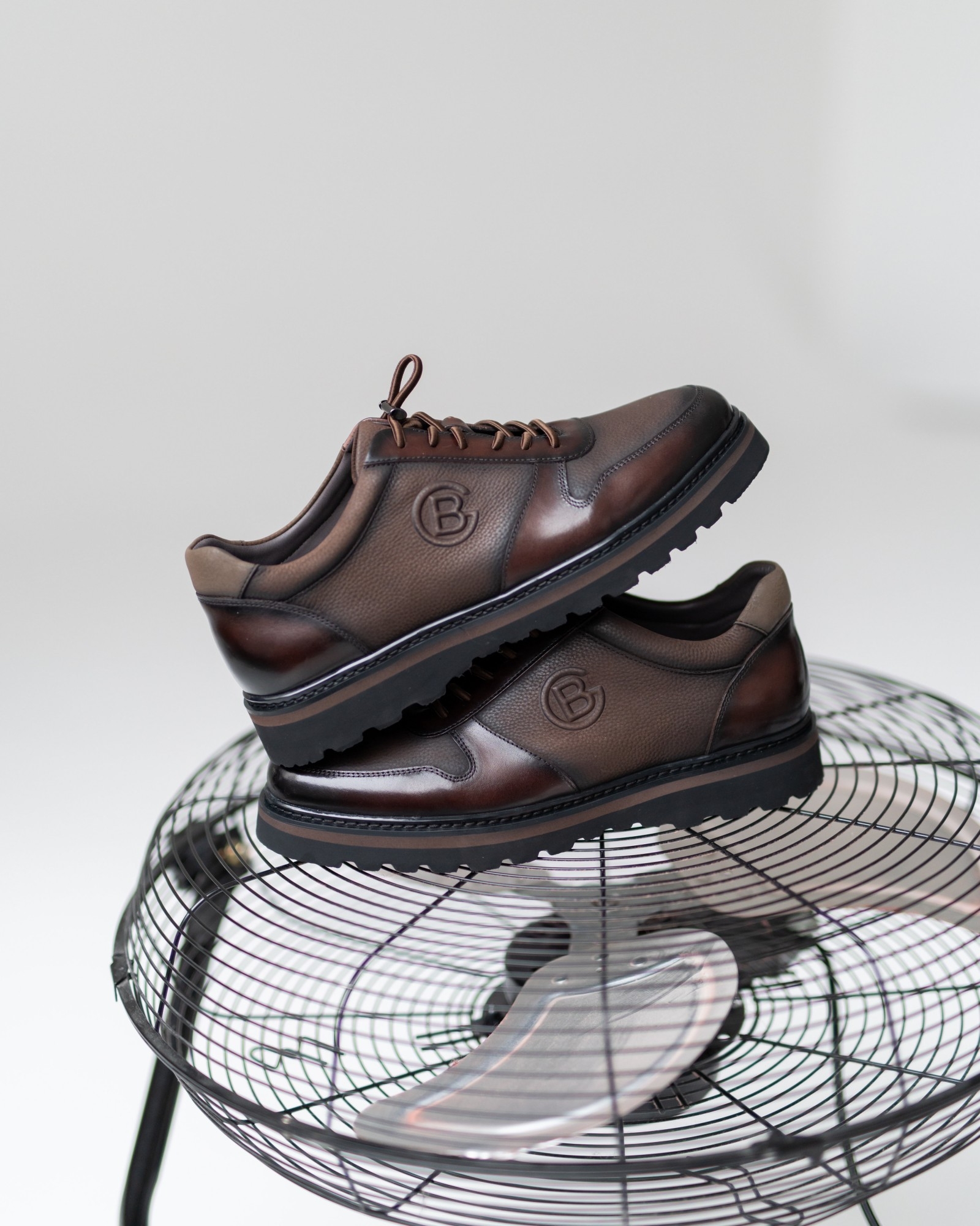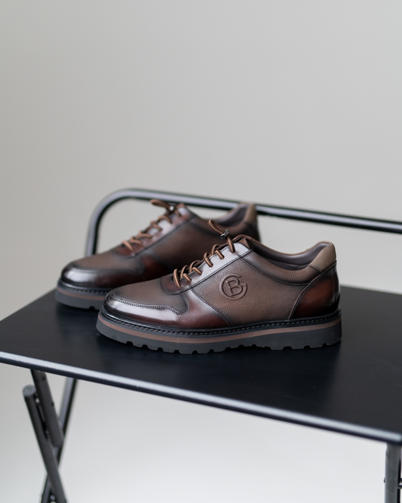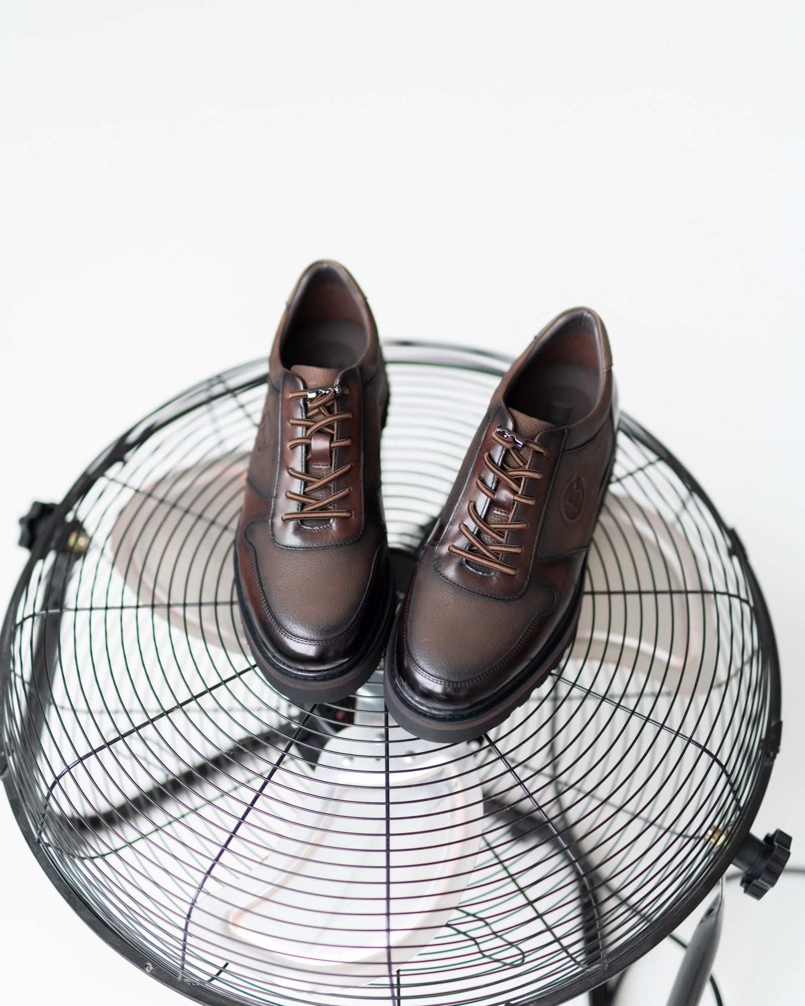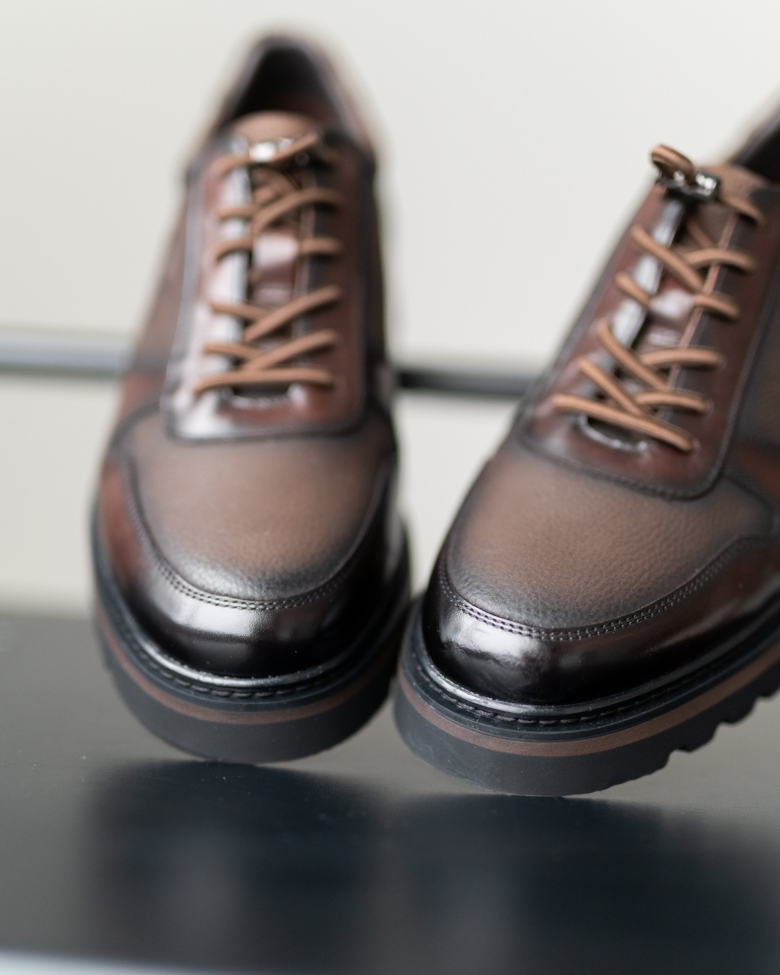 В этой модели использовано два контрастных материала: глянцевая коричневая кожа и матовый коричневый нубук. Такое сочетание создаёт глубину цвета и делает силуэт обуви визуально сложнее и интереснее. Эластичная шнуровка в виде резинок обеспечивает быструю и точную посадку — обувь легко надевать и снимать без лишних движений, сохраняя аккуратный внешний вид.
