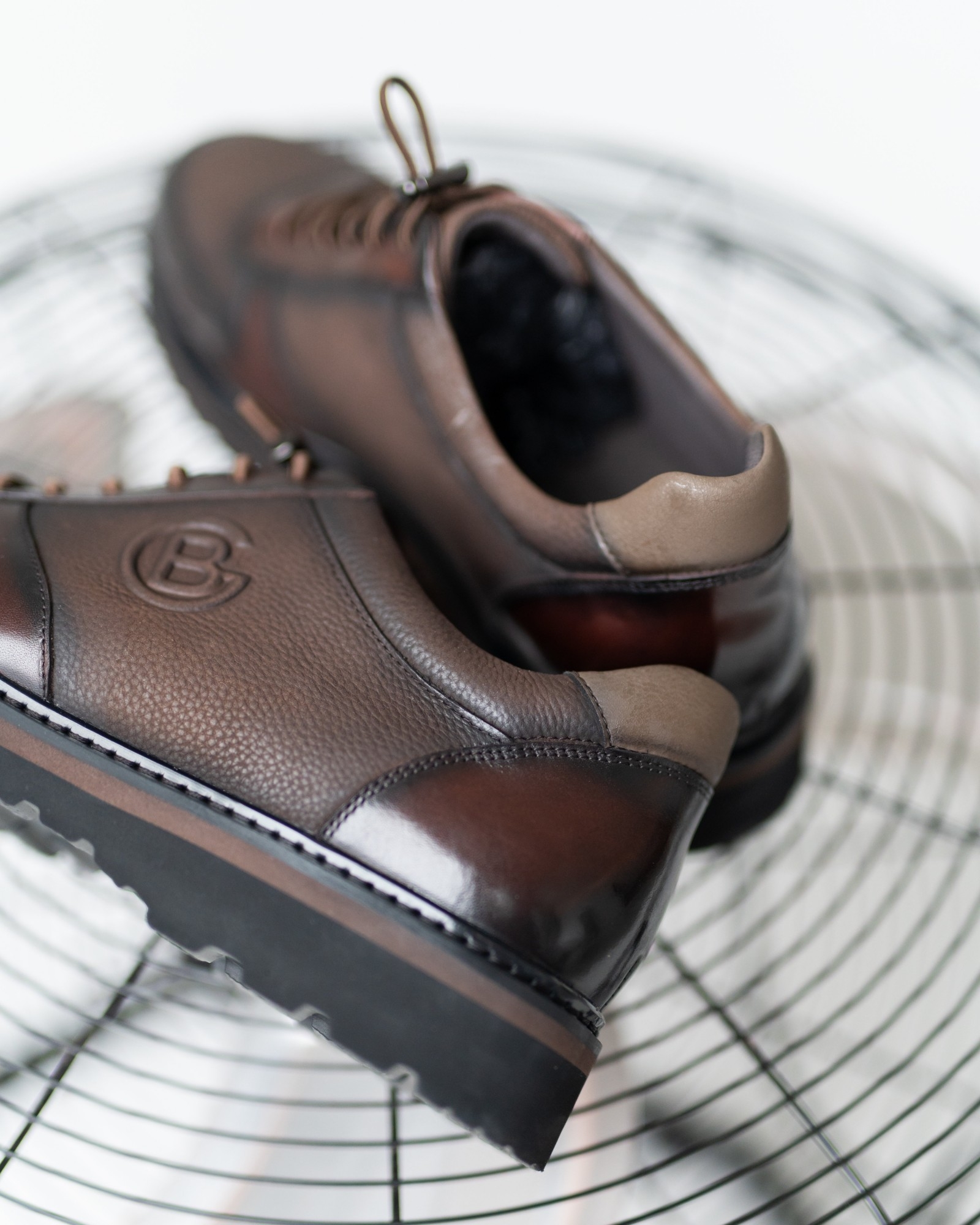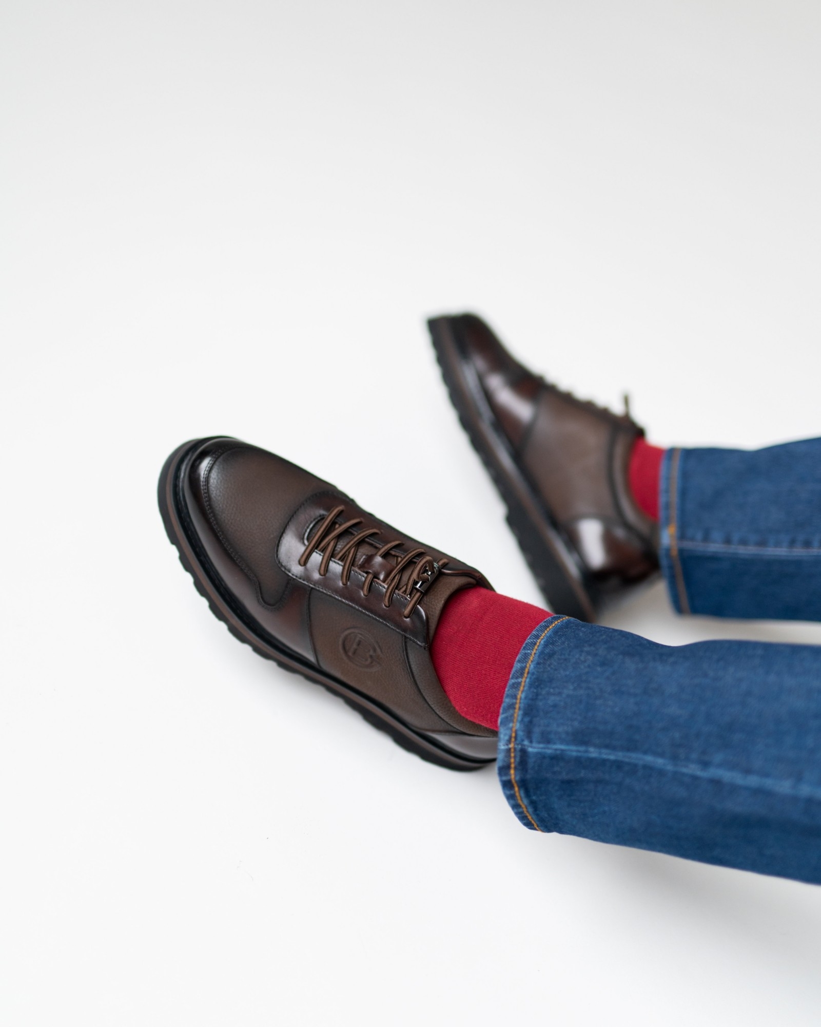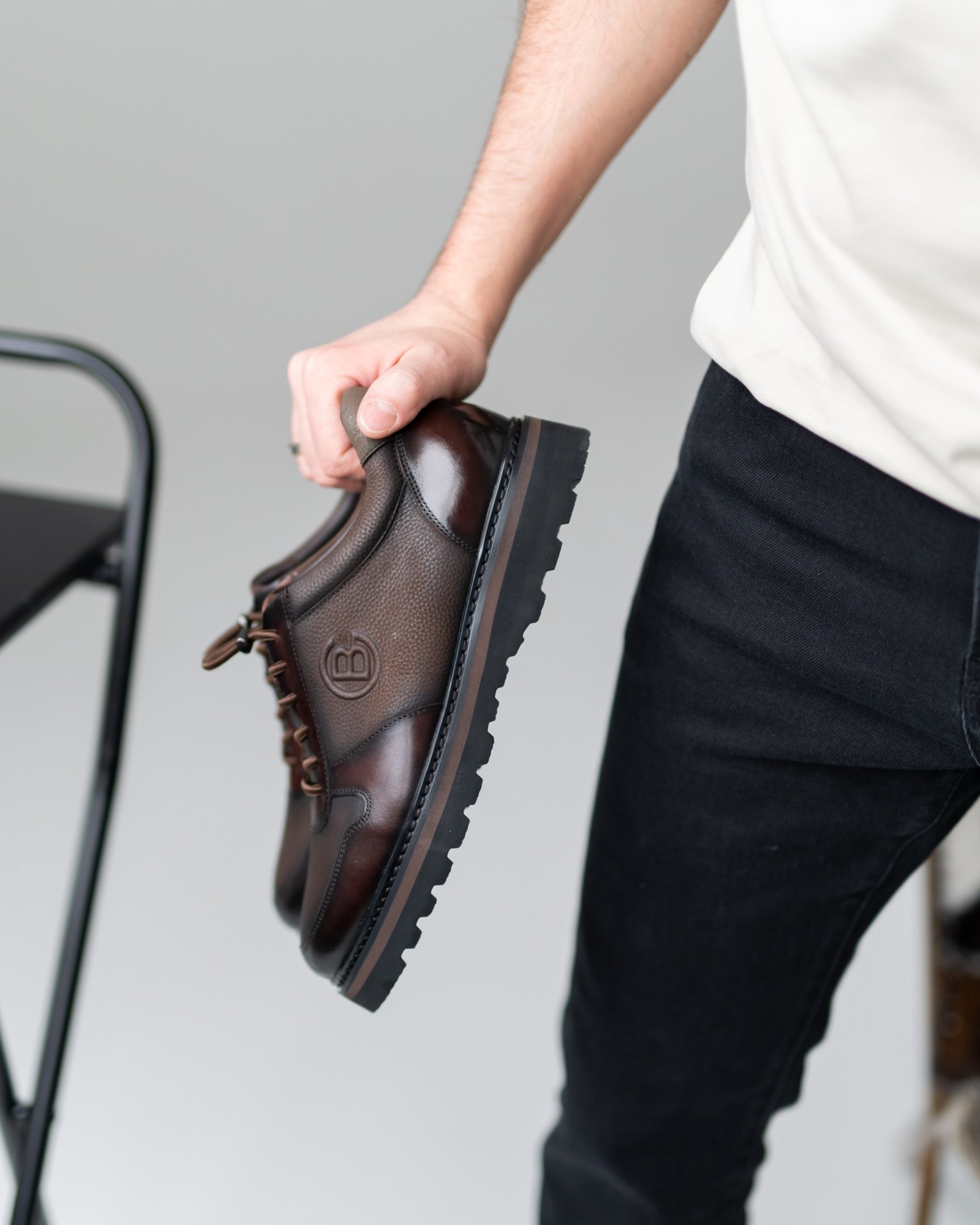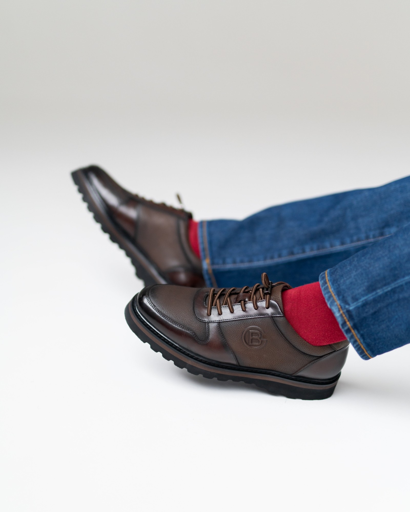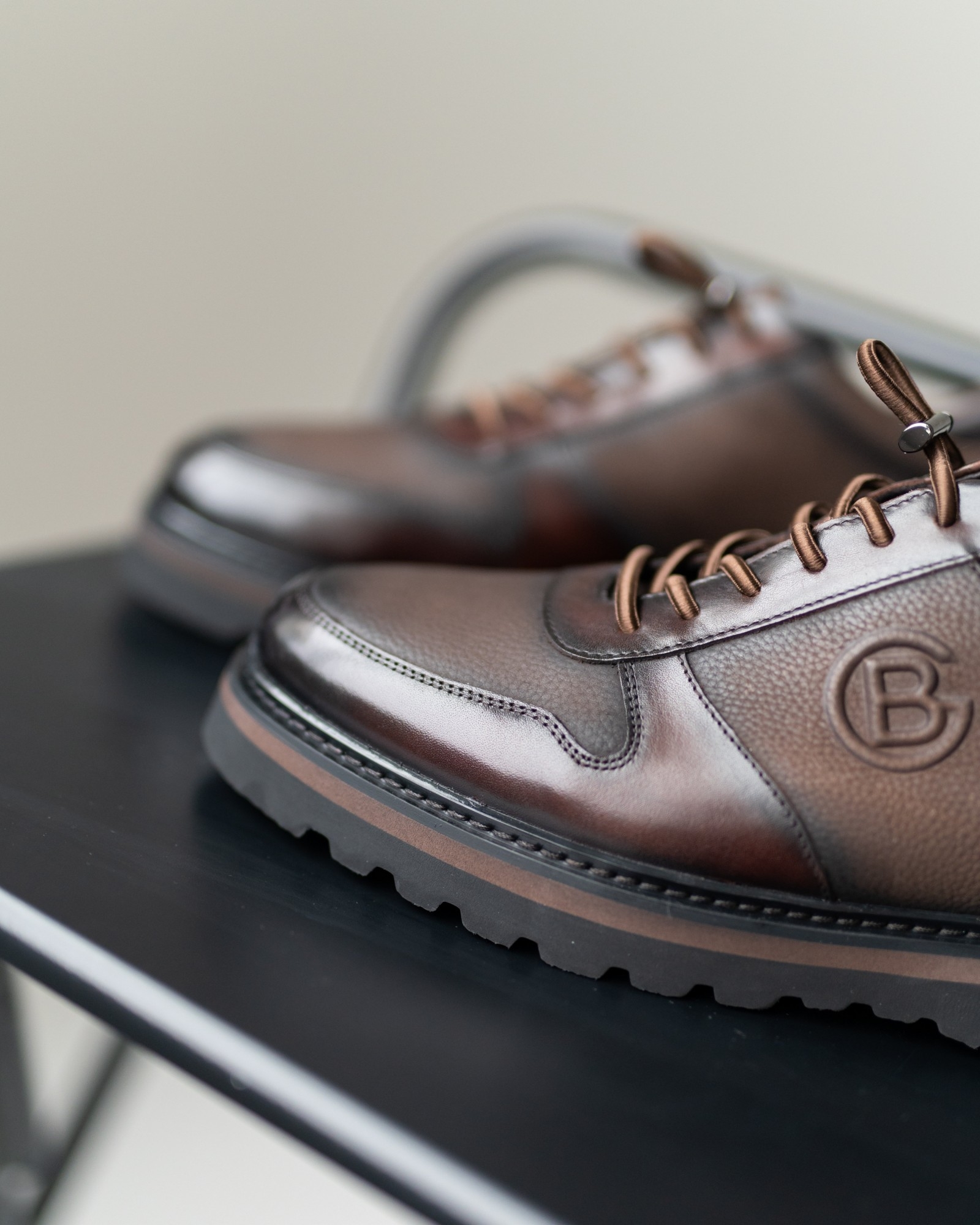 В этой модели использовано два контрастных материала: глянцевая коричневая кожа и матовый коричневый нубук. Такое сочетание создаёт глубину цвета и делает силуэт обуви визуально сложнее и интереснее. Эластичная шнуровка в виде резинок обеспечивает быструю и точную посадку — обувь легко надевать и снимать без лишних движений, сохраняя аккуратный внешний вид.