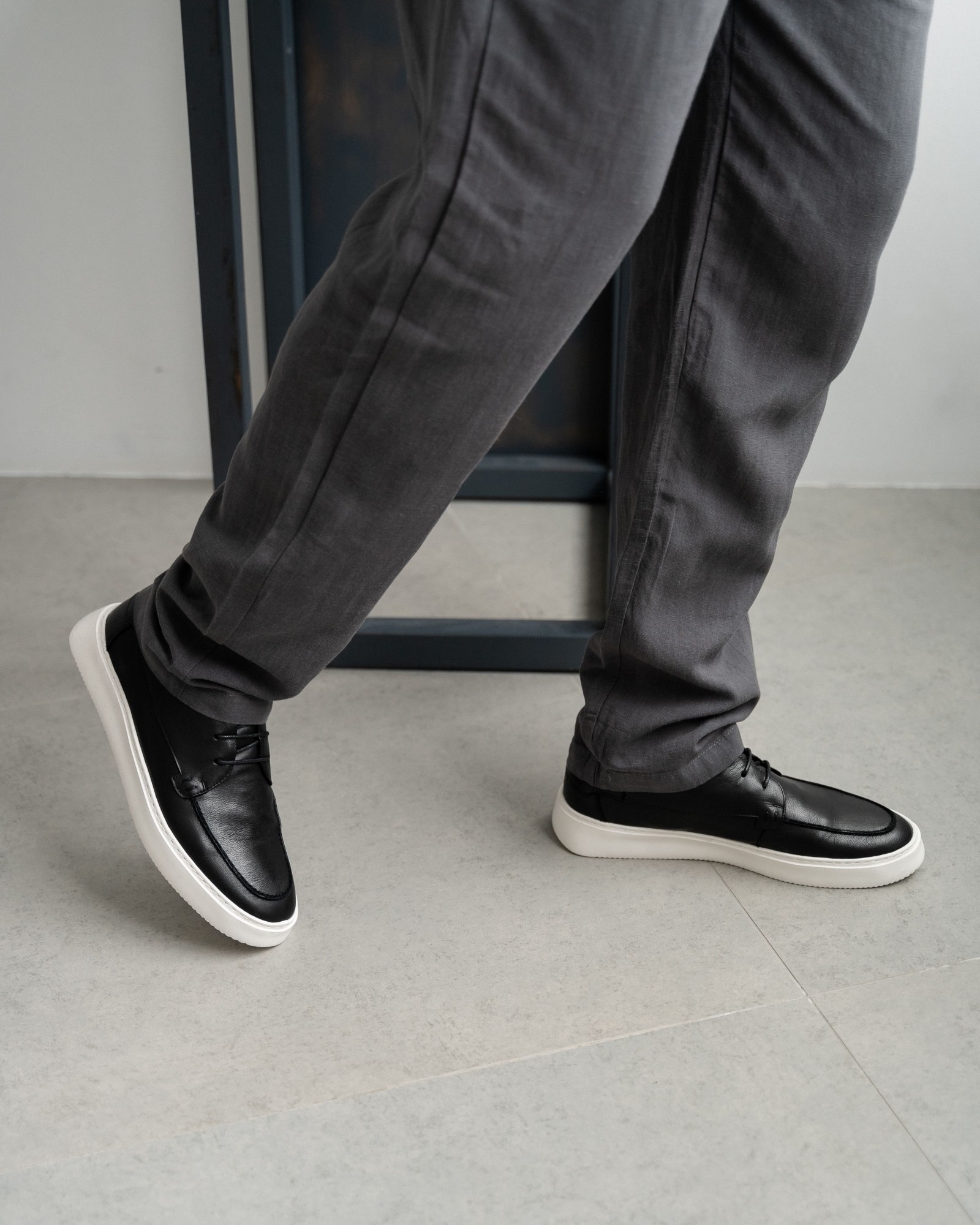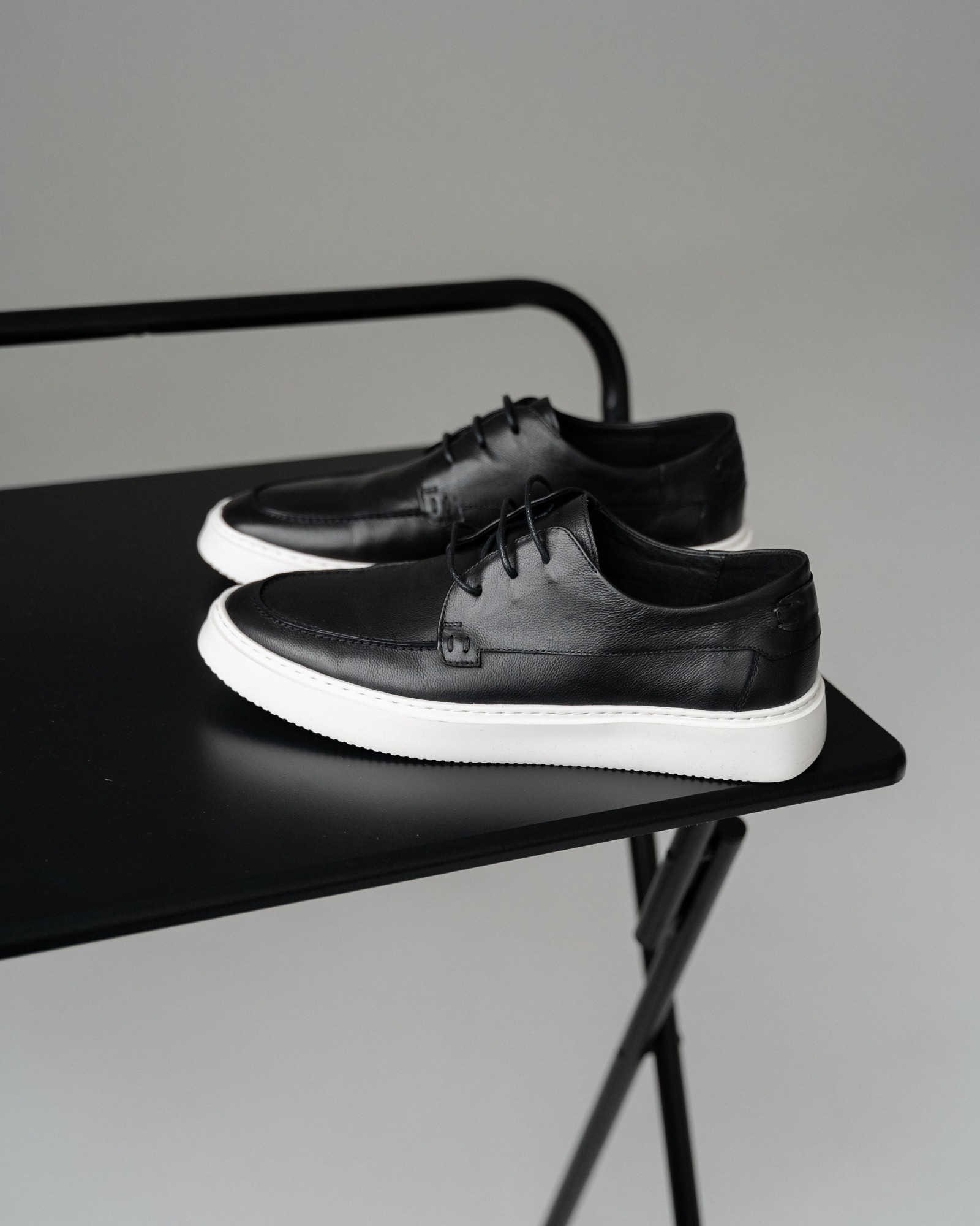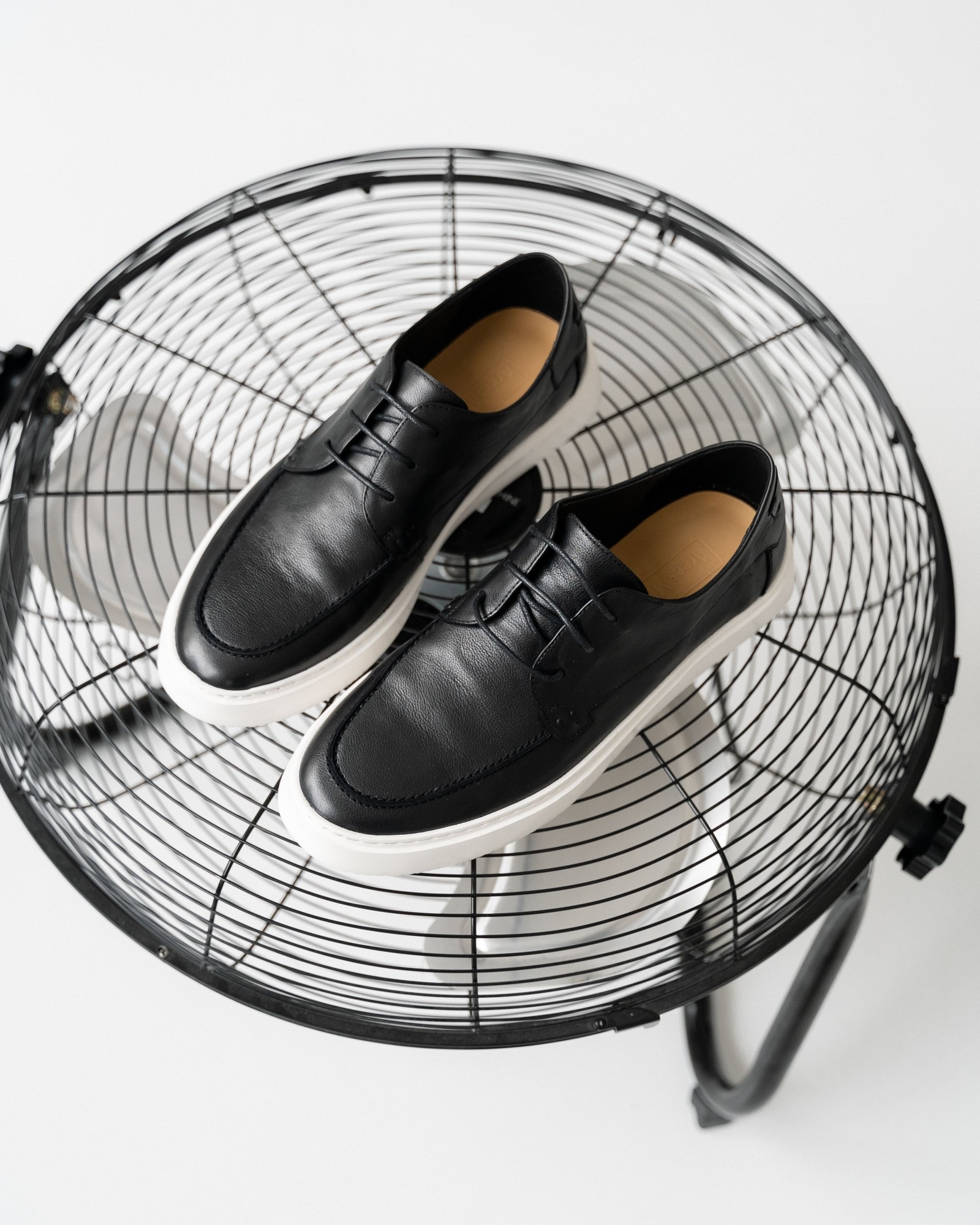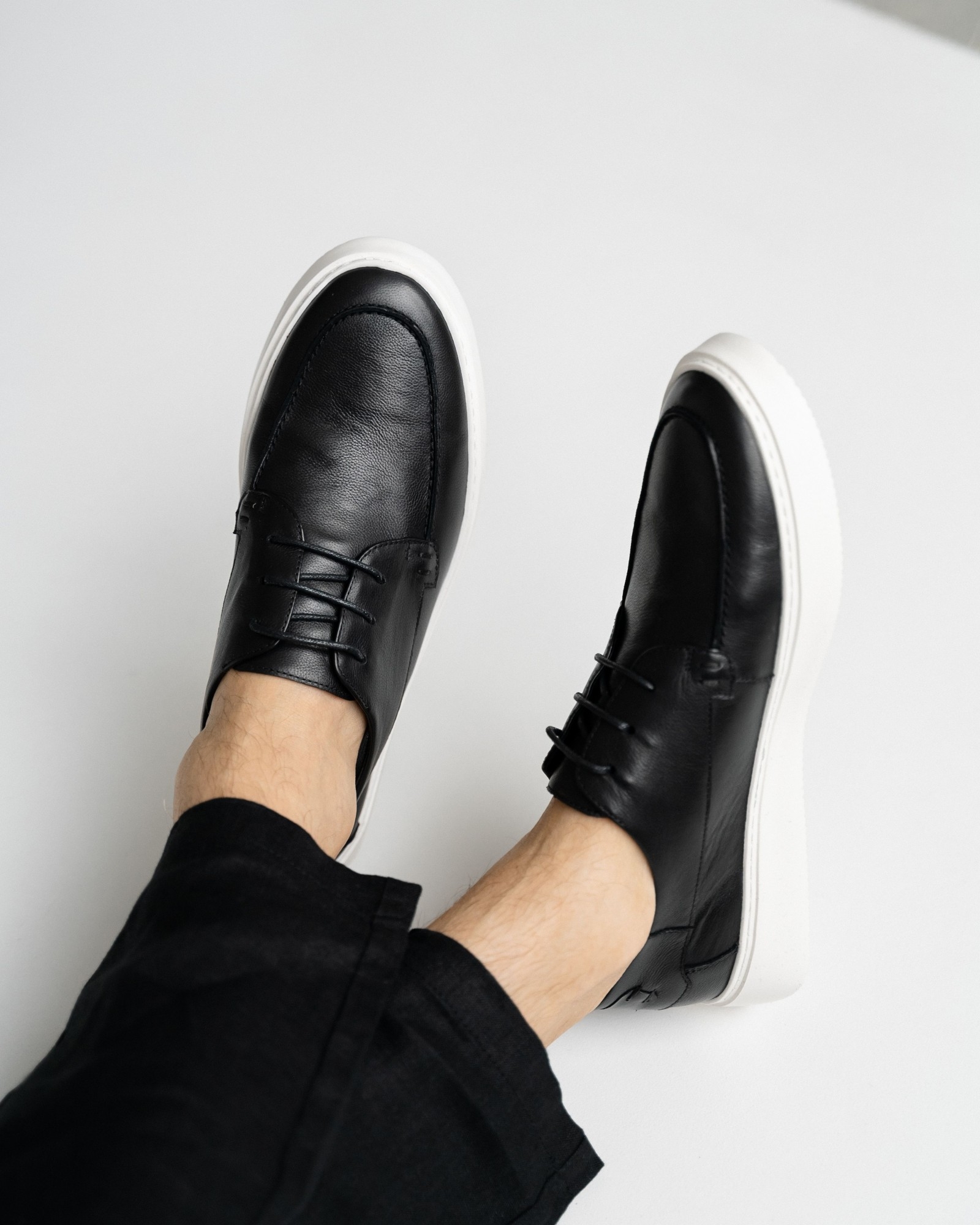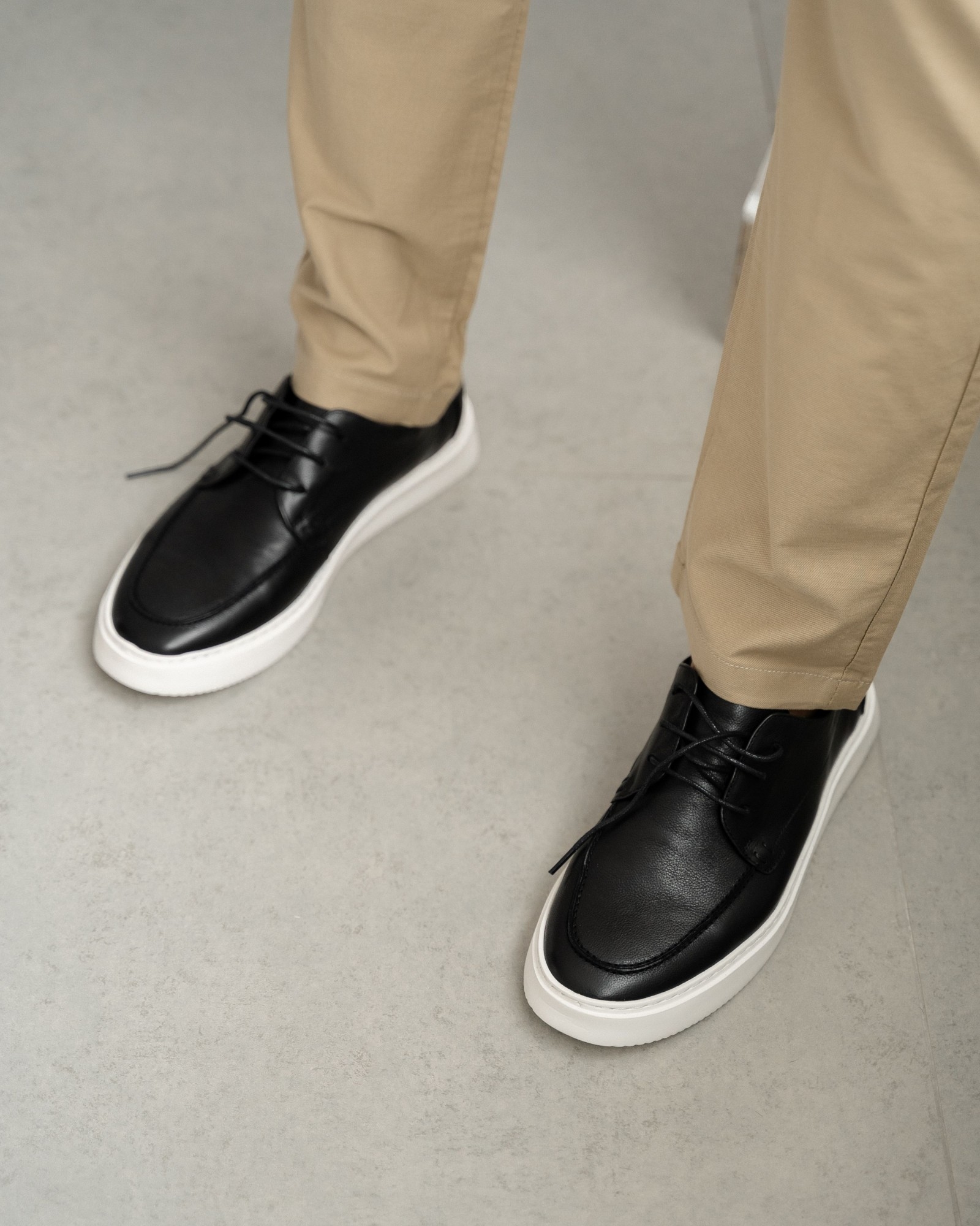 Современный кэжуал с акцентом на контраст — чёрная гладкая кожа и белая ультралёгкая подошва создают эффектное, но сдержанное сочетание. Подошва действительно почти невесома — мы шутим, что при производстве просто забыли добавить в неё вес. Шнурки в духе классических туфель и лёгкие элементы лоферов на носке делают эту модель универсальной: от расслабленного до почти формального образа.
