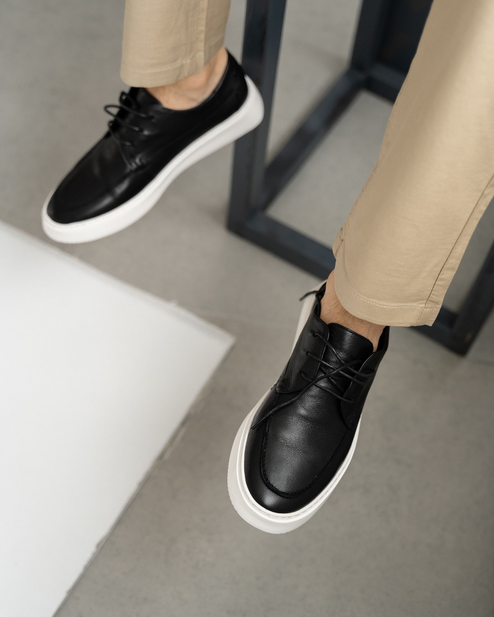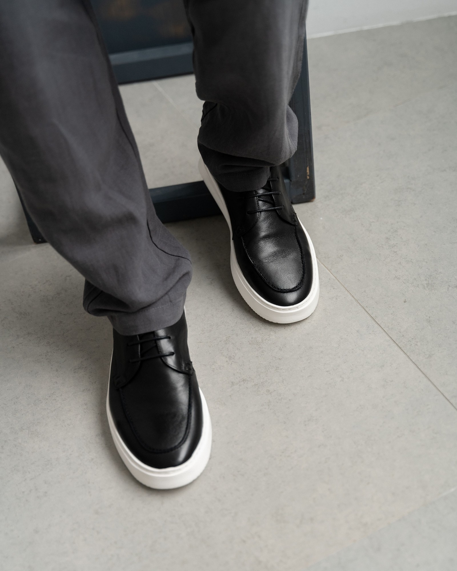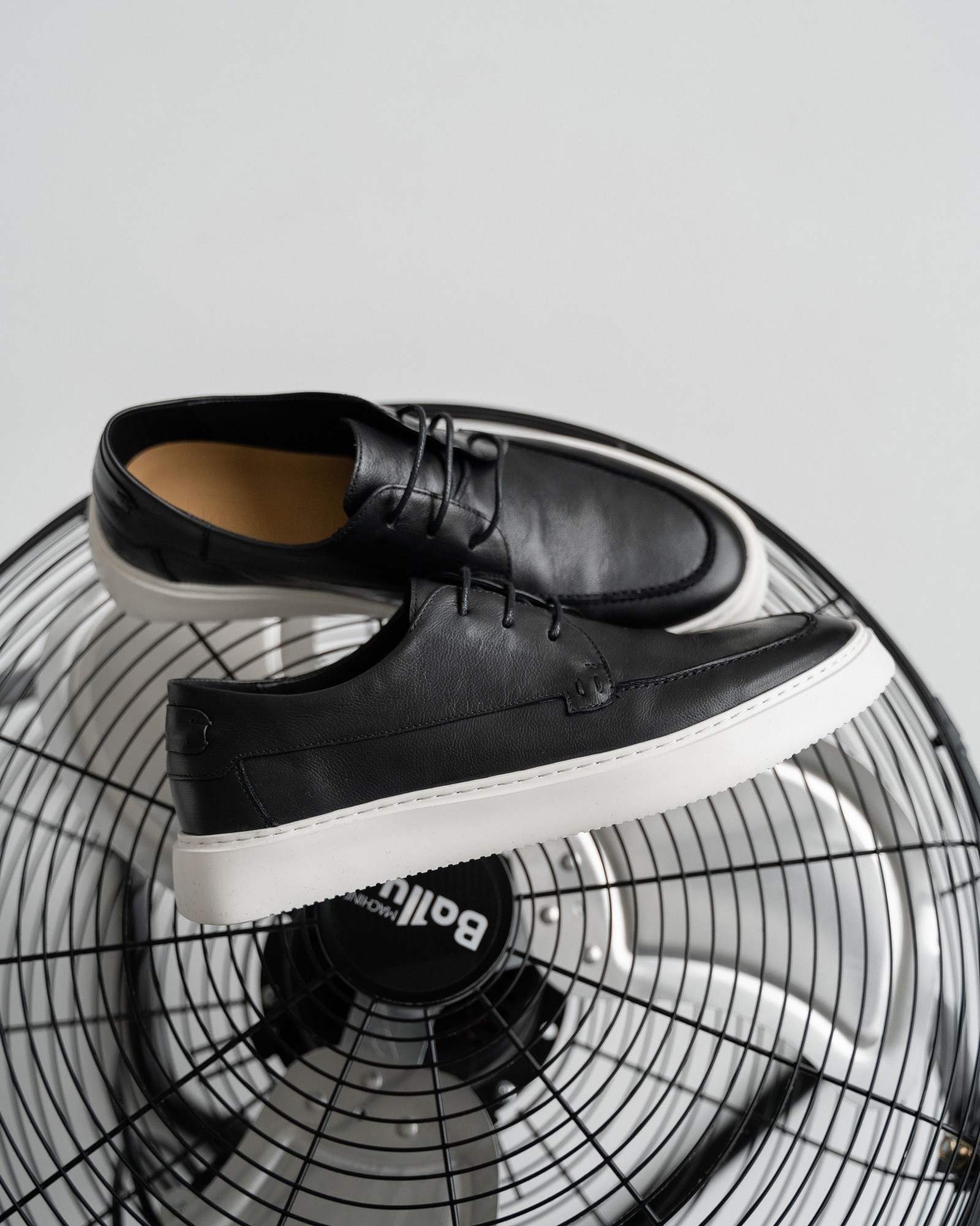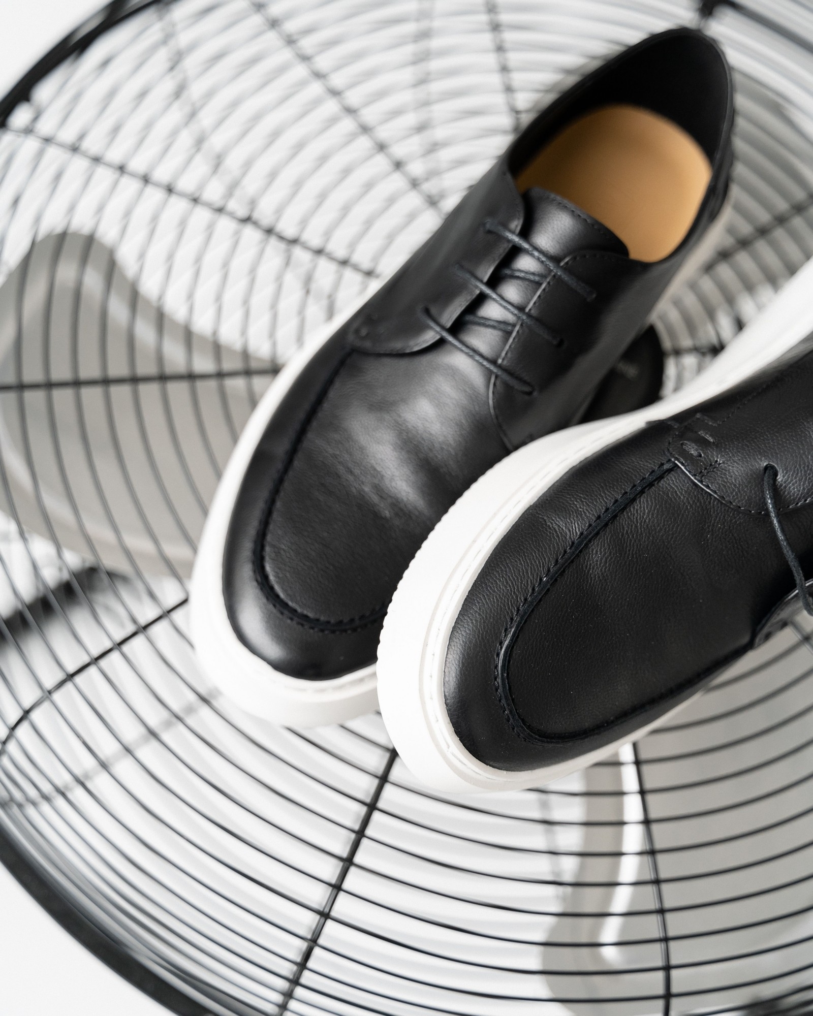 Современный кэжуал с акцентом на контраст — чёрная гладкая кожа и белая ультралёгкая подошва создают эффектное, но сдержанное сочетание. Подошва действительно почти невесома — мы шутим, что при производстве просто забыли добавить в неё вес. Шнурки в духе классических туфель и лёгкие элементы лоферов на носке делают эту модель универсальной: от расслабленного до почти формального образа.