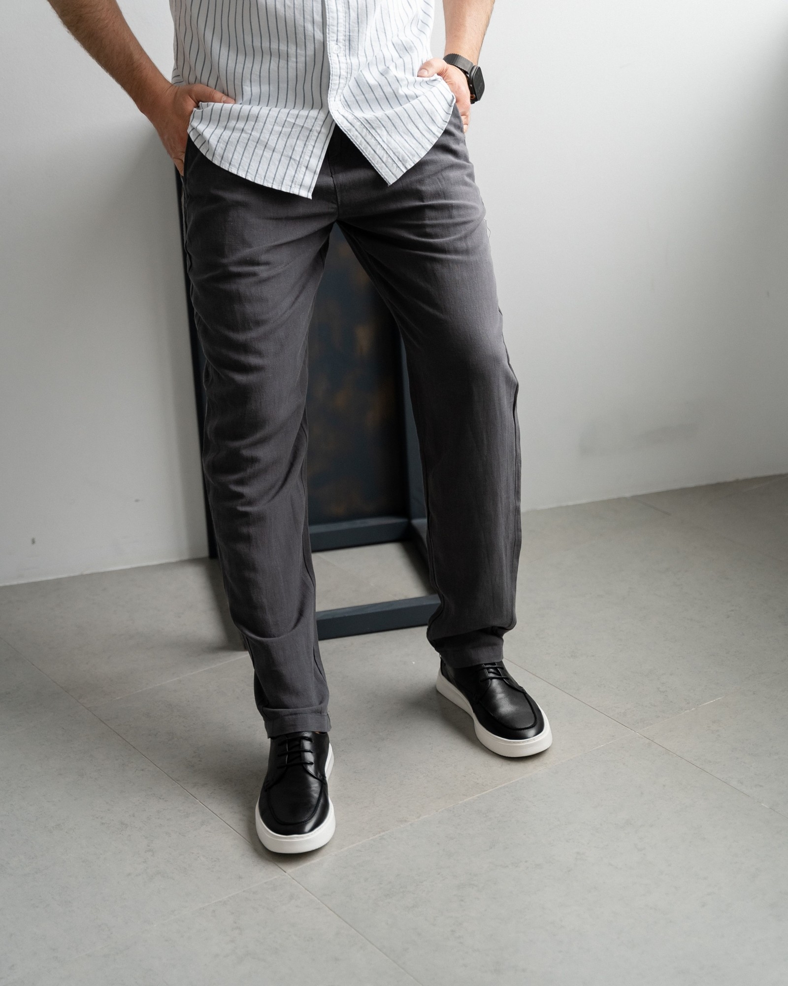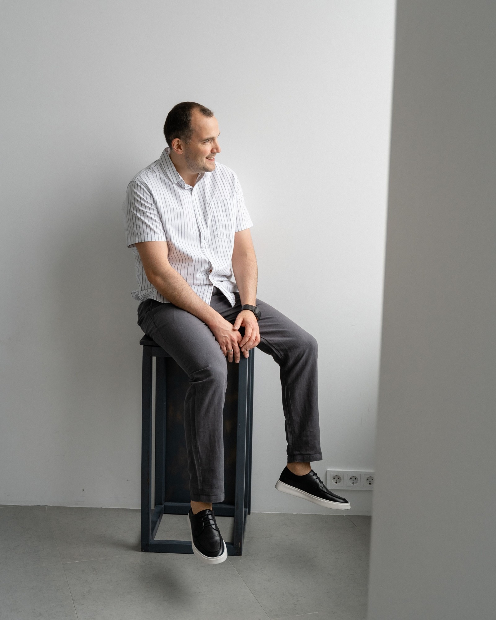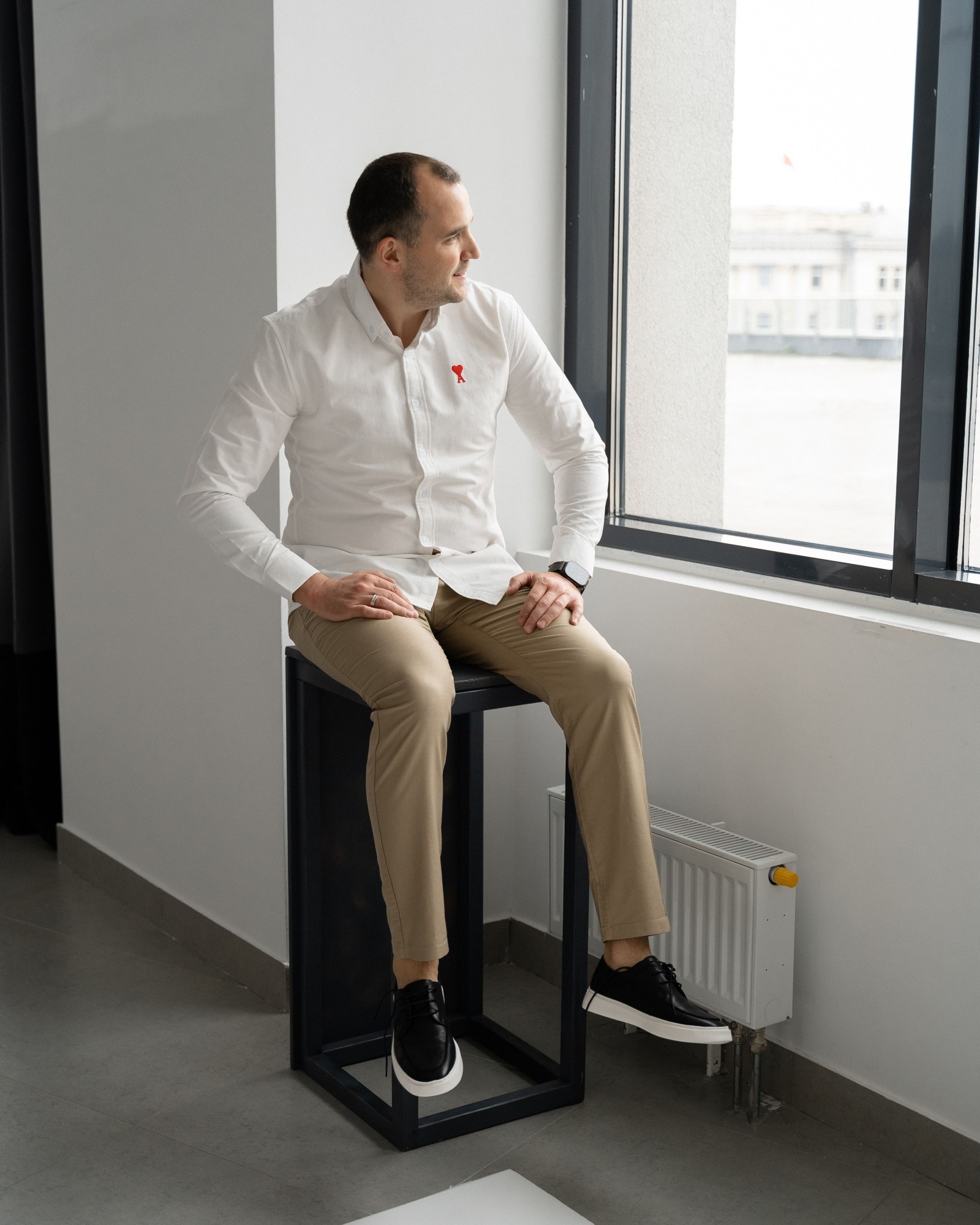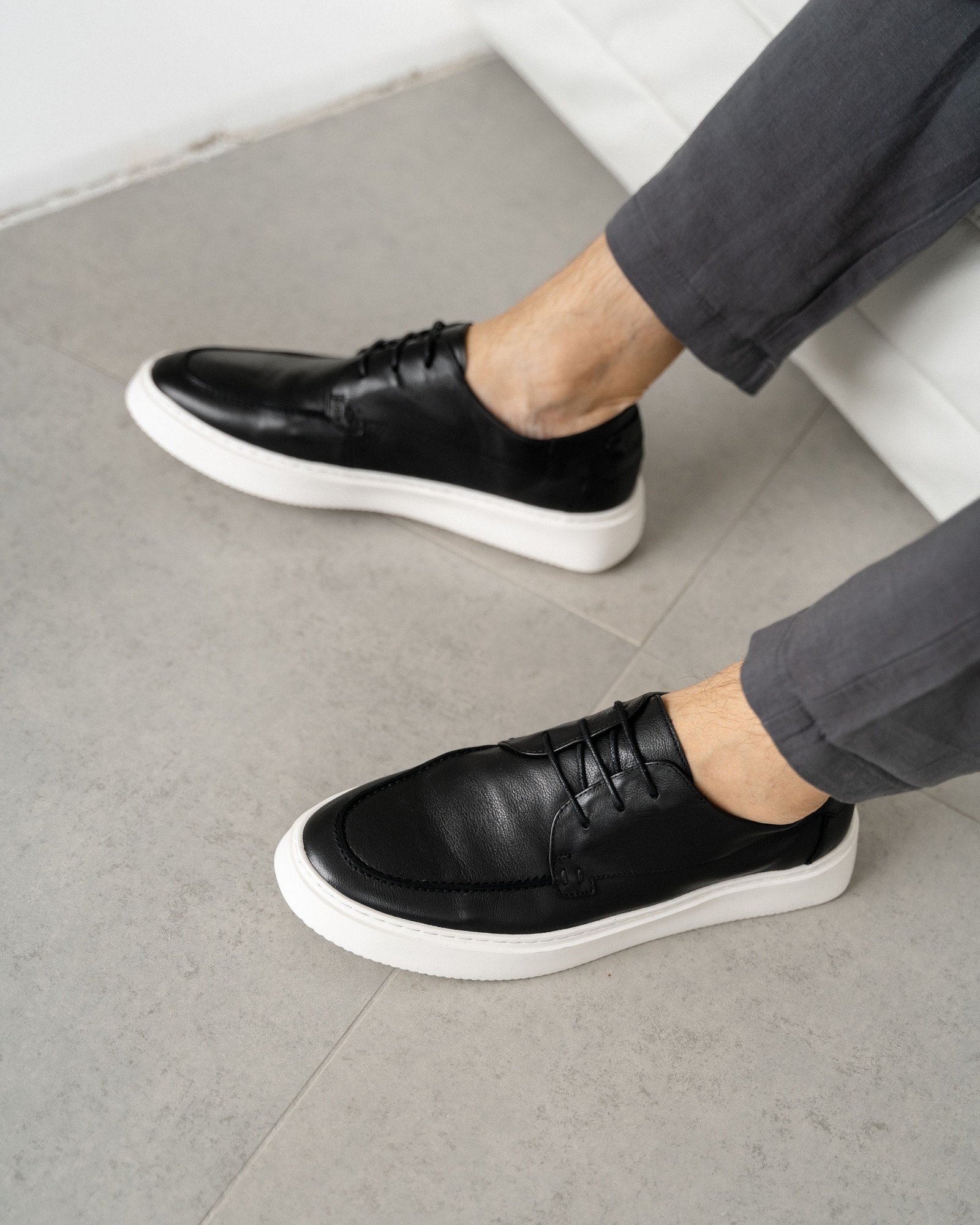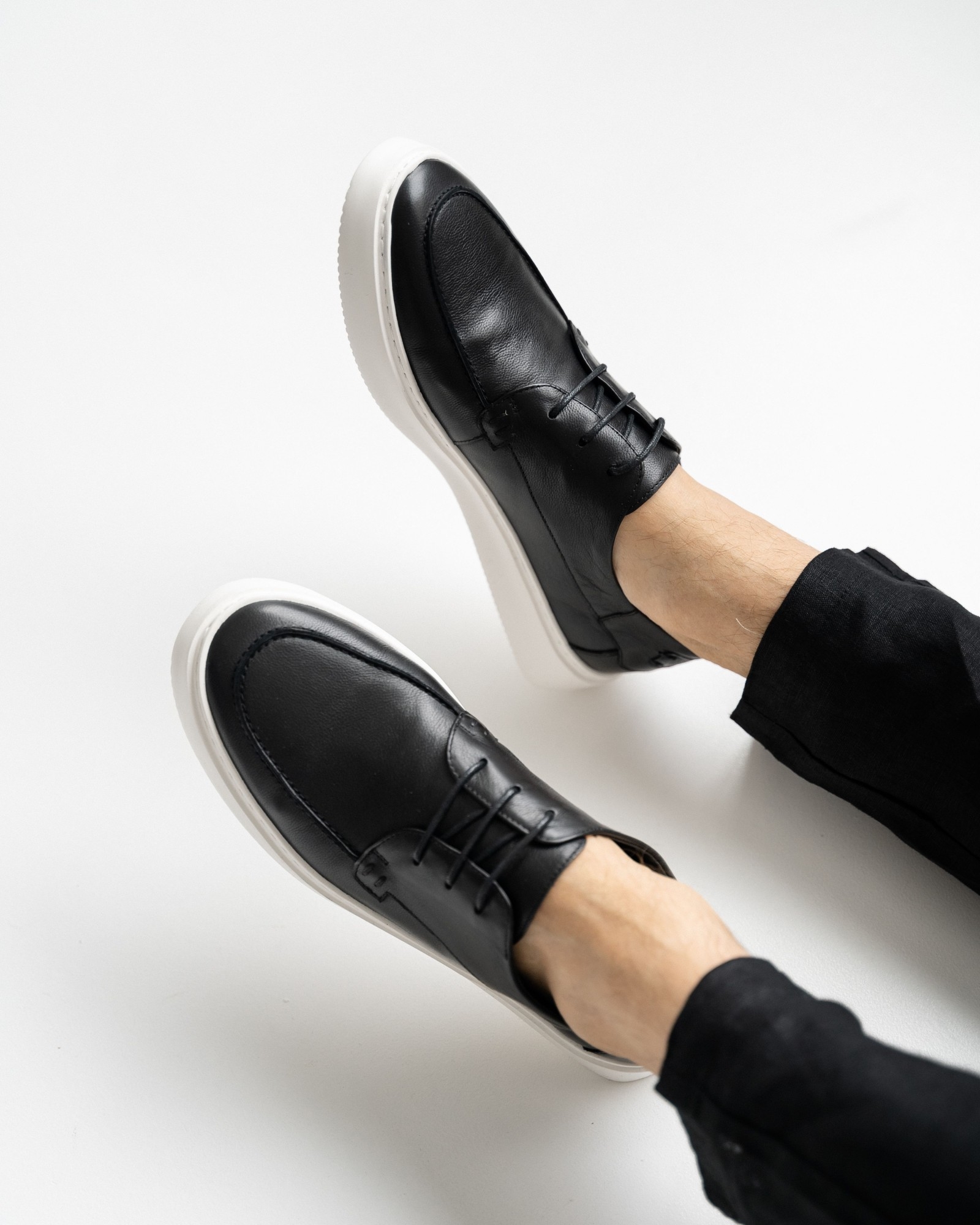 Современный кэжуал с акцентом на контраст — чёрная гладкая кожа и белая ультралёгкая подошва создают эффектное, но сдержанное сочетание. Подошва действительно почти невесома — мы шутим, что при производстве просто забыли добавить в неё вес. Шнурки в духе классических туфель и лёгкие элементы лоферов на носке делают эту модель универсальной: от расслабленного до почти формального образа.