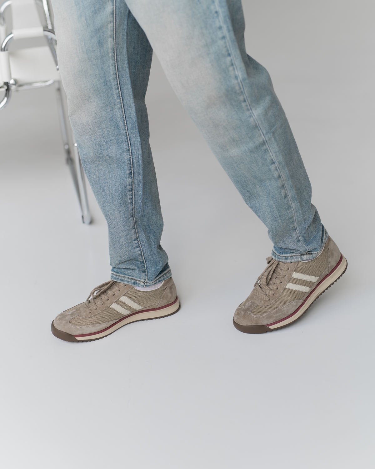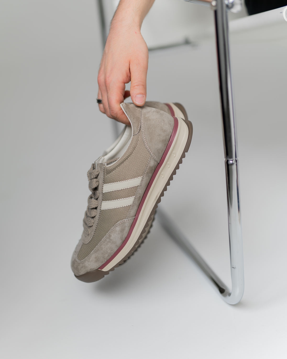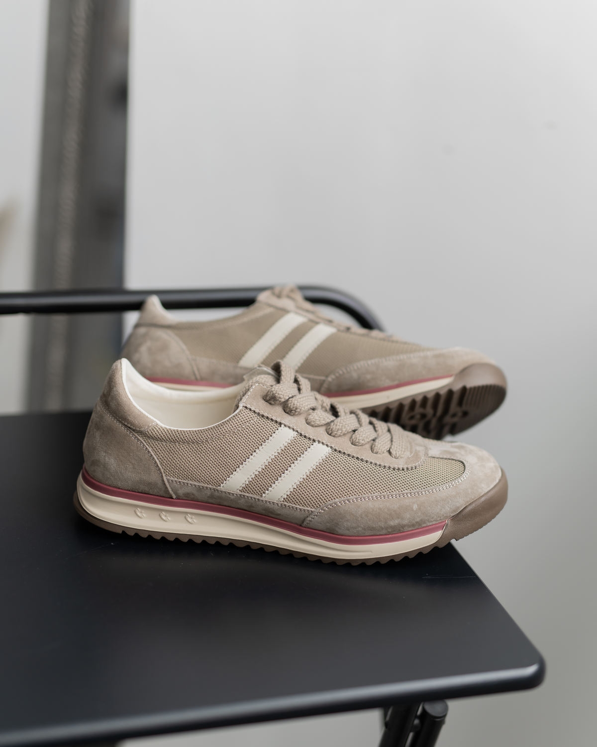 Основной цвет этой пары — нежный беж, который создаёт универсальную и лёгкую базу. Подошва молочного или кофейного оттенка с тонкой отделкой в нижней части тёмно-коричневым цветом придаёт модели изысканность. Бордовая полоска на подошве подчёркивает элегантность, создавая тонкий контраст. Верх выполнен из мягкой кофейной замши, что добавляет модели премиальный тактильный комфорт и визуальную глубину.