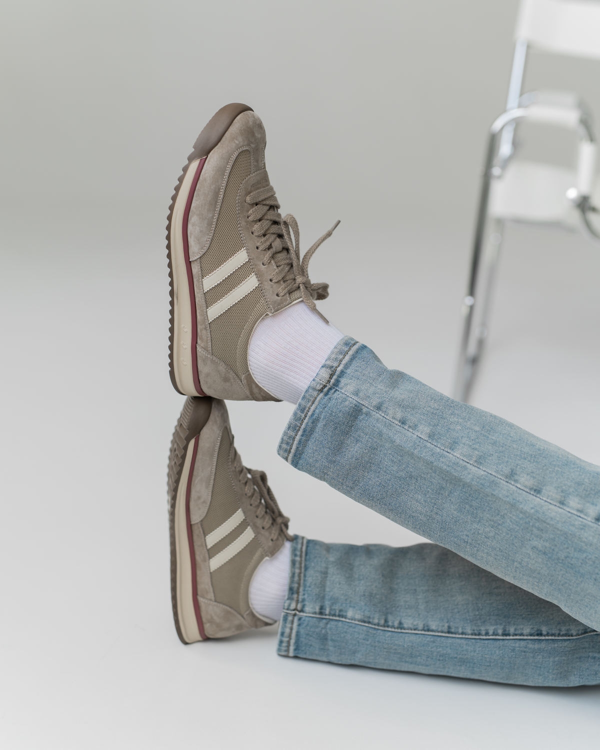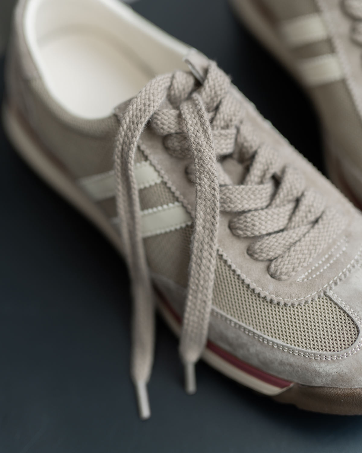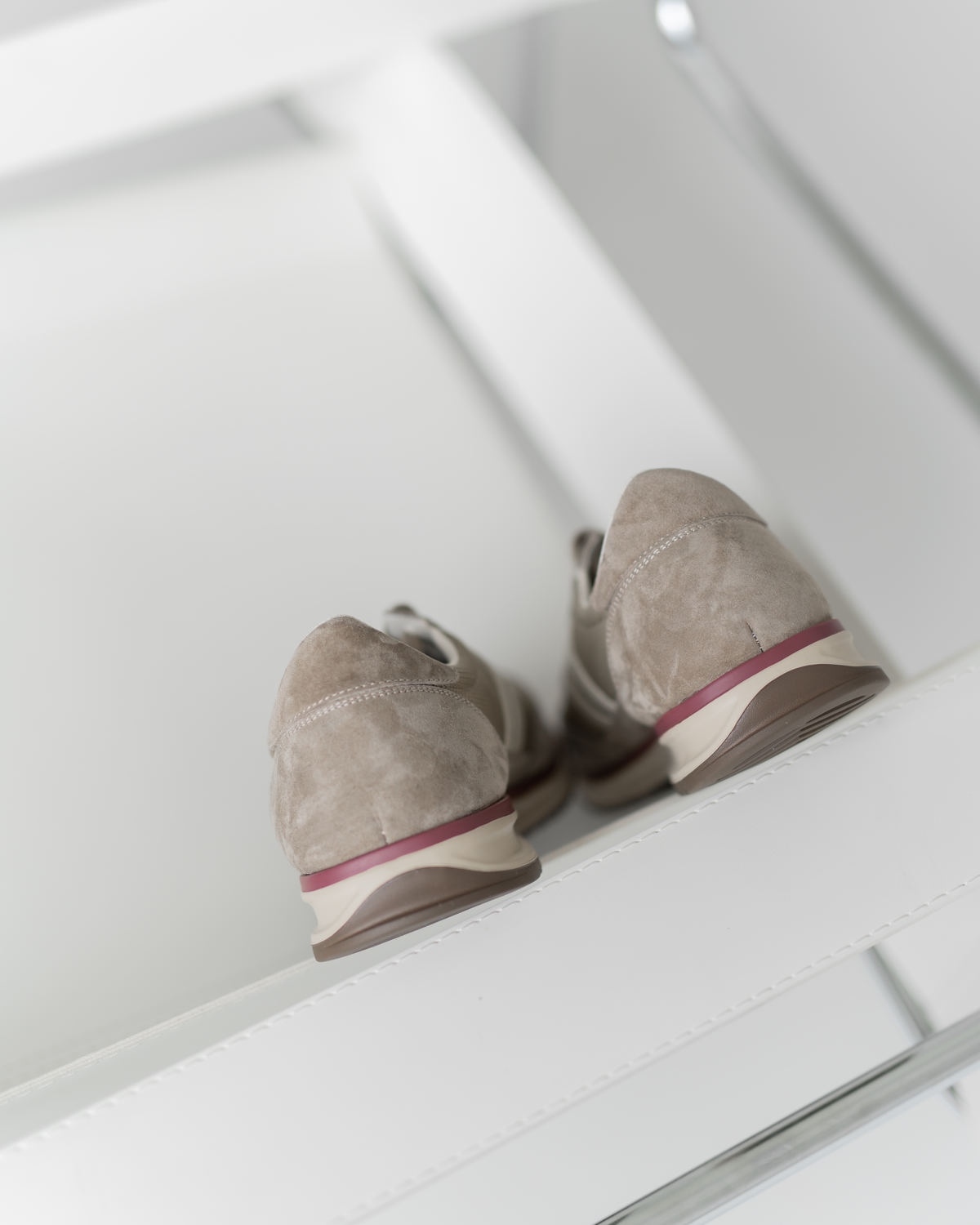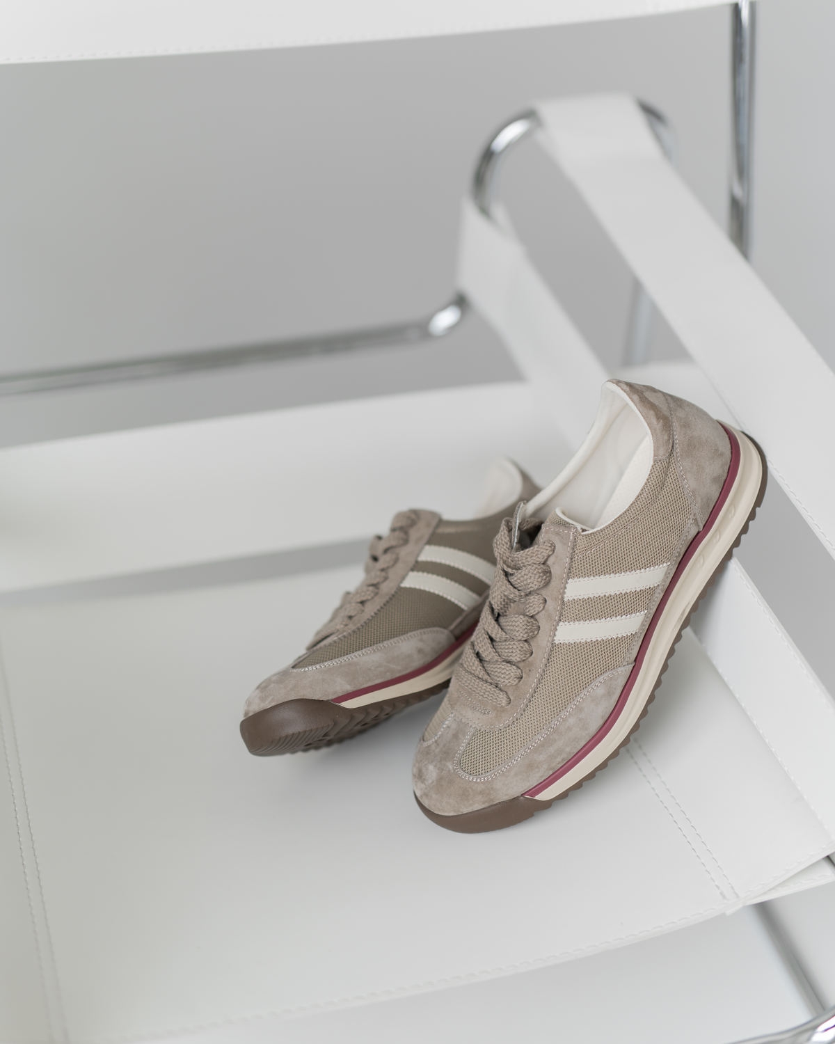 Основной цвет этой пары — нежный беж, который создаёт универсальную и лёгкую базу. Подошва молочного или кофейного оттенка с тонкой отделкой в нижней части тёмно-коричневым цветом придаёт модели изысканность. Бордовая полоска на подошве подчёркивает элегантность, создавая тонкий контраст. Верх выполнен из мягкой кофейной замши, что добавляет модели премиальный тактильный комфорт и визуальную глубину.