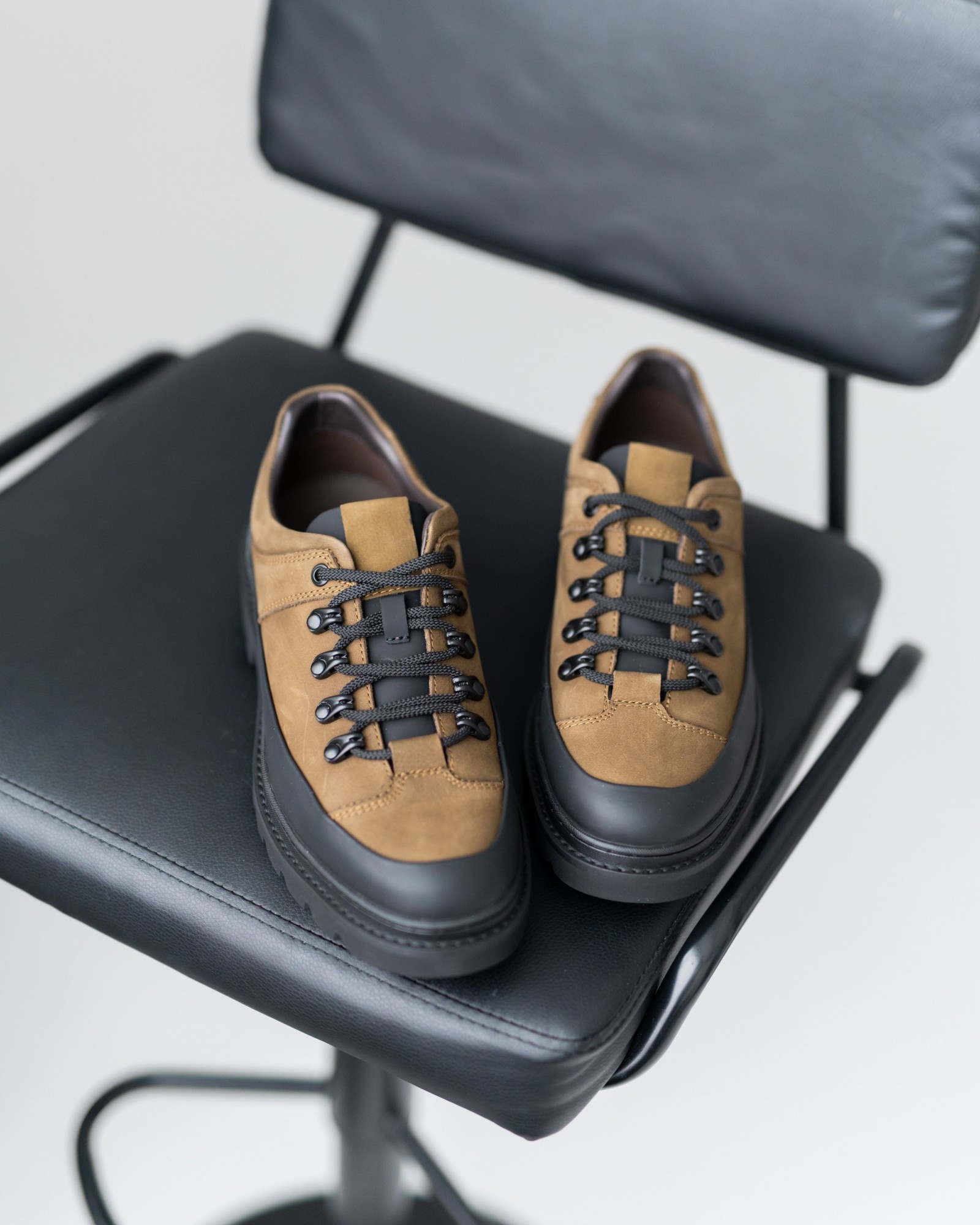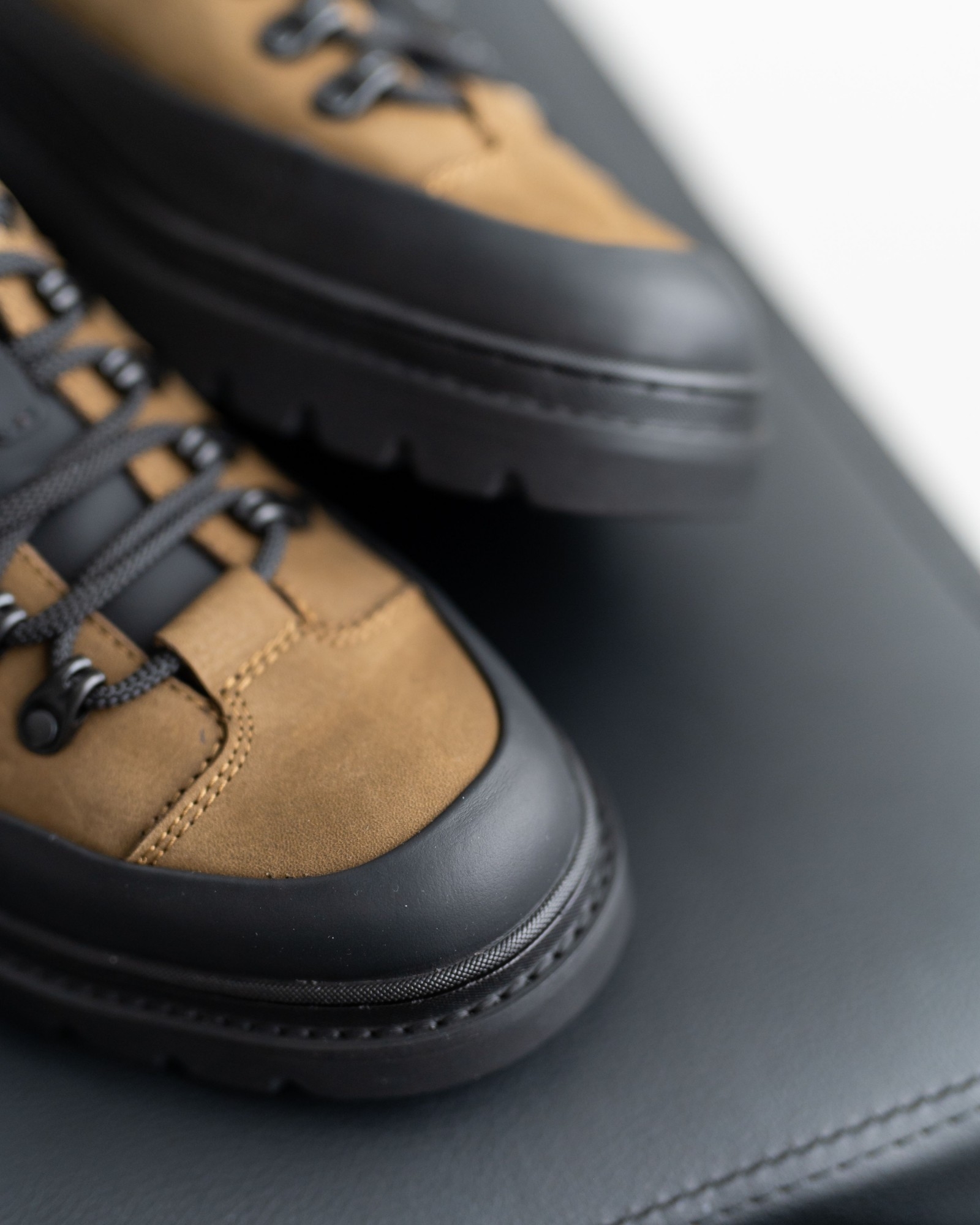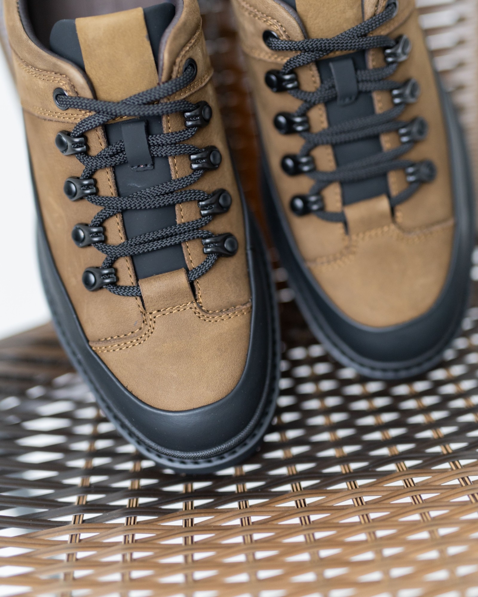 Эти хайкеры созданы для тех, кто ценит современный дизайн и практичность без лишнего шума. Верх выполнен в благородном рыжем оттенке, а нижняя часть аккуратно отделана чёрной матовой кожей — контраст получается глубоким, выразительным и подчёркивающим характер модели.