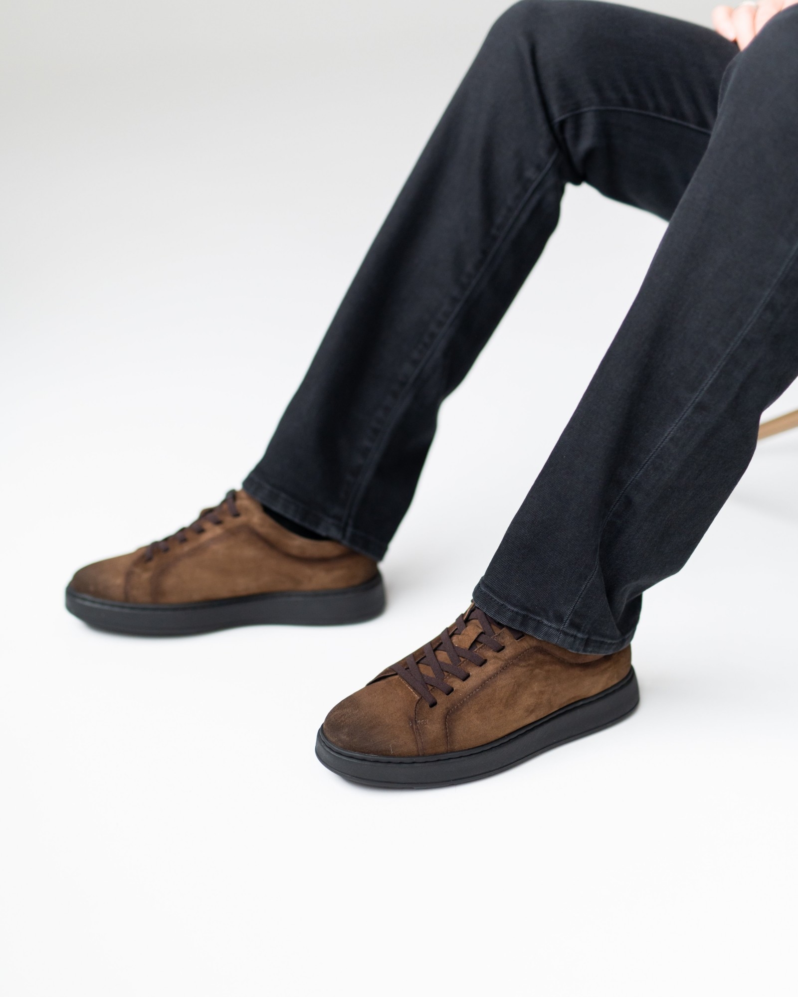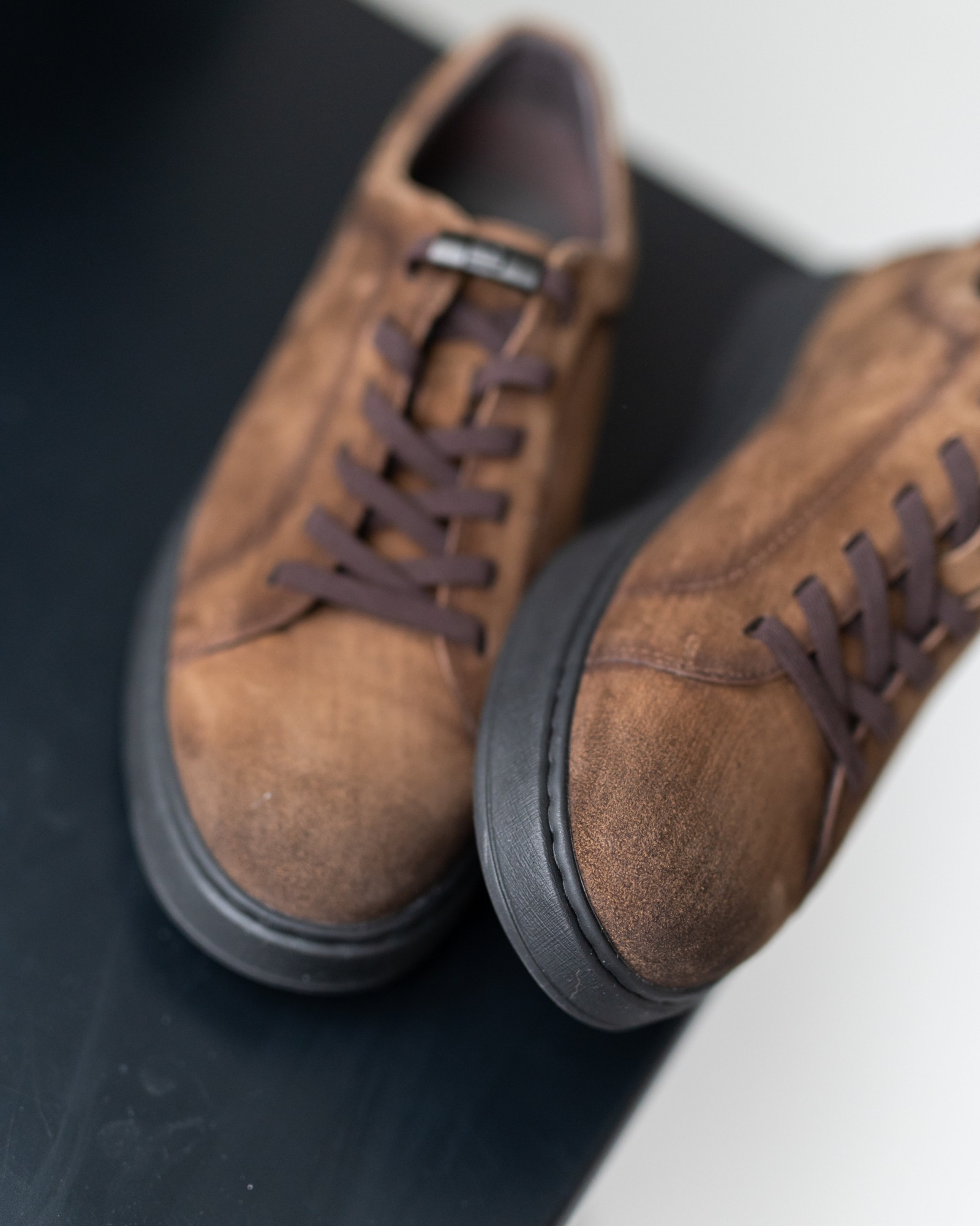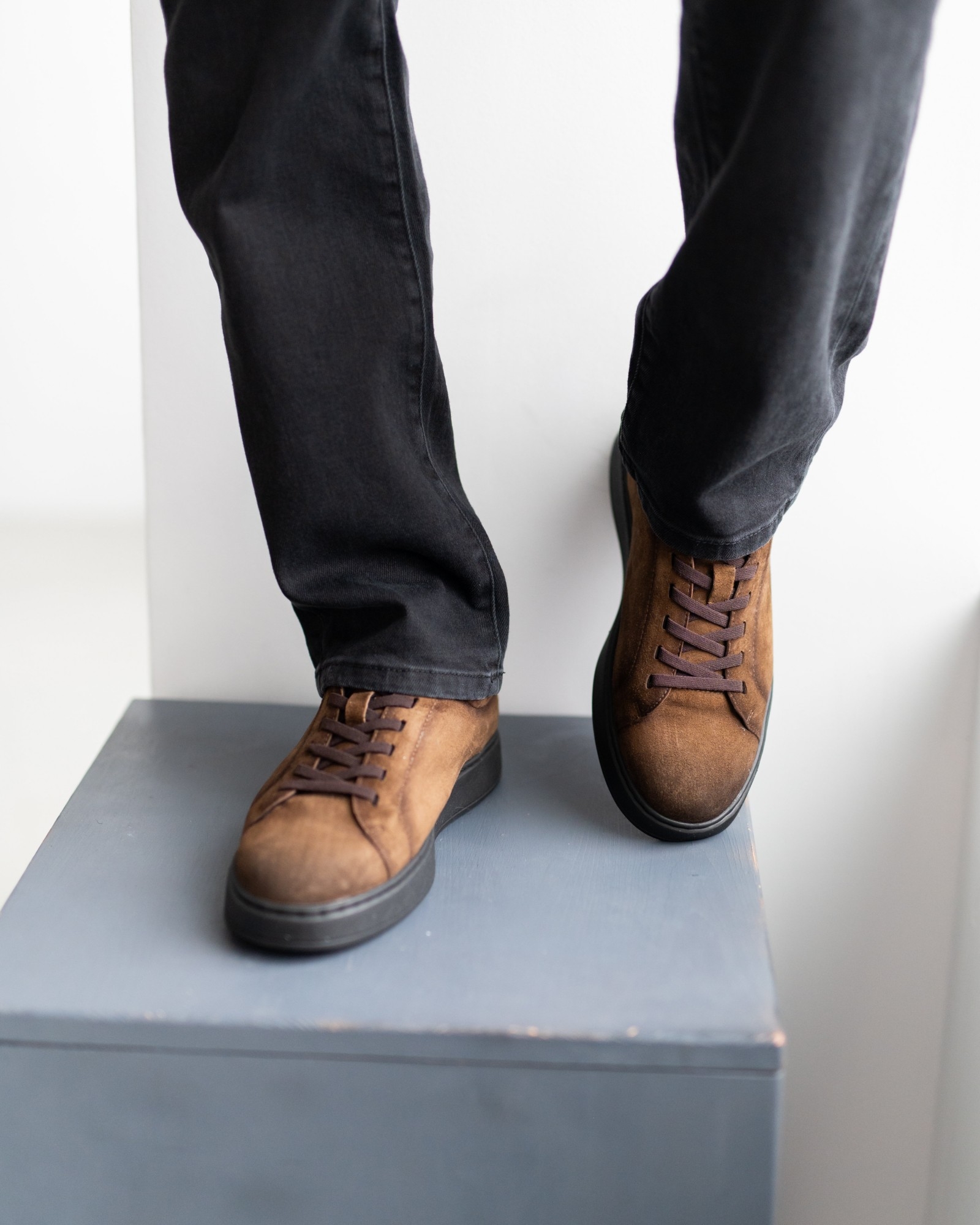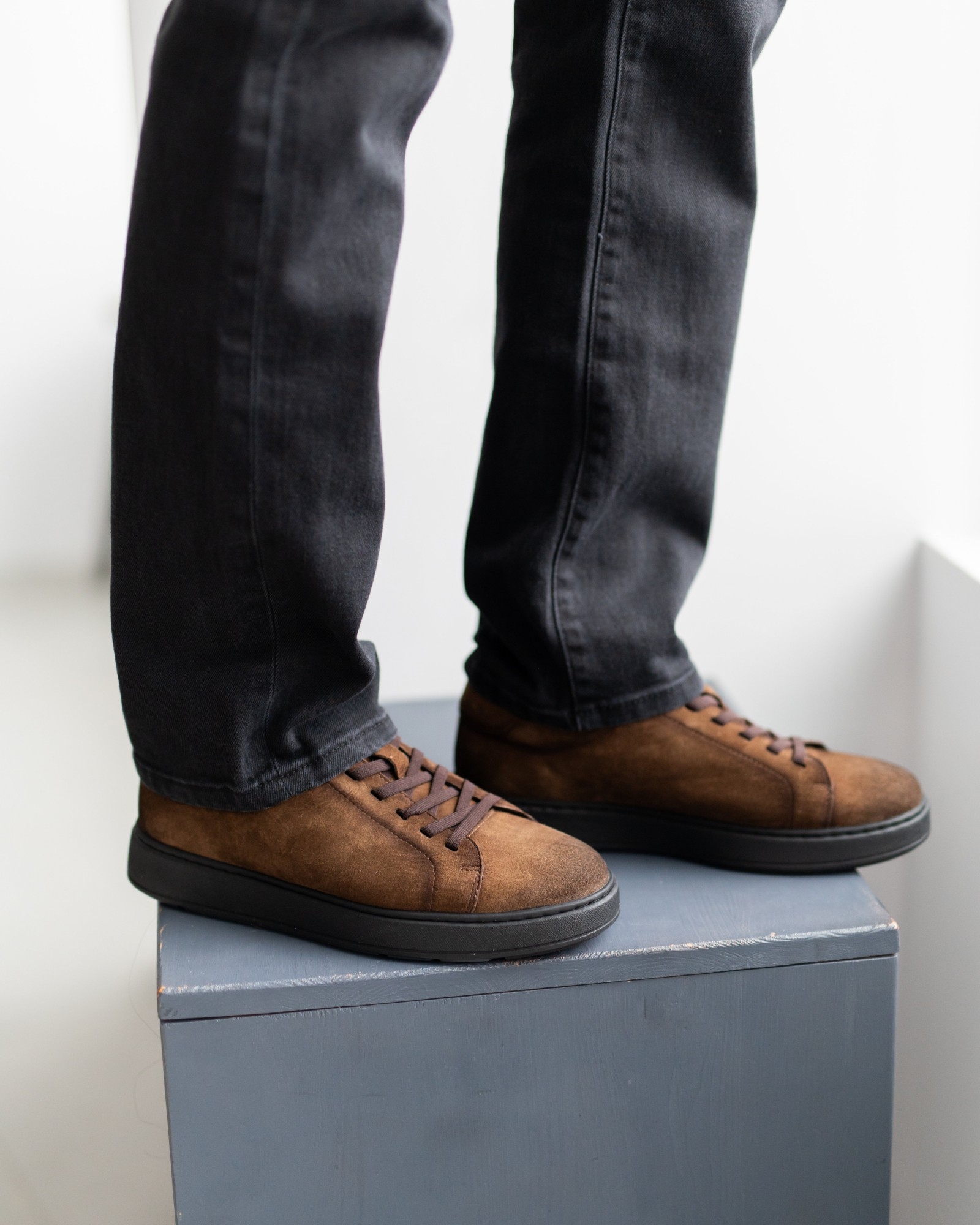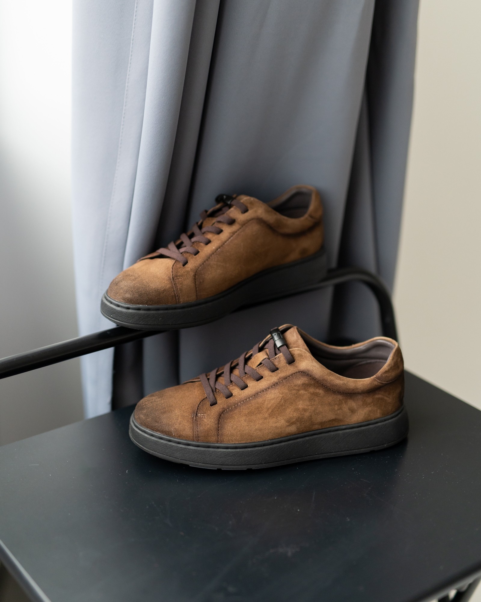 Эта модель сразу притягивает взгляд за счёт сложного цвета. Мягкая рыжая замша плавно переходит от тёмно-коричневого оттенка к светло-рыжему, создавая живой, глубокий градиент. Коричневая подошва с лёгкой структурой поддерживает цветовую гамму и добавляет визуальной цельности образу.