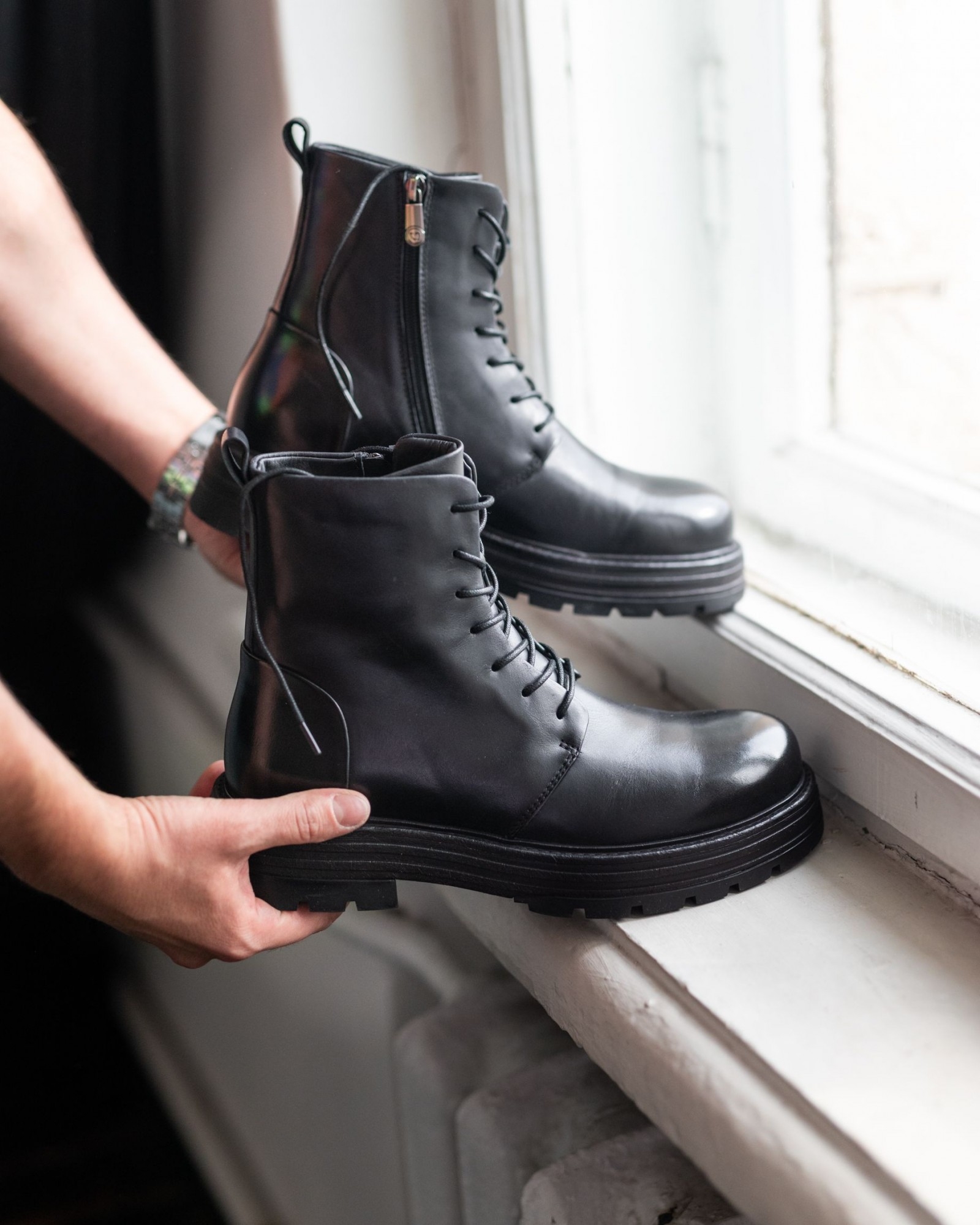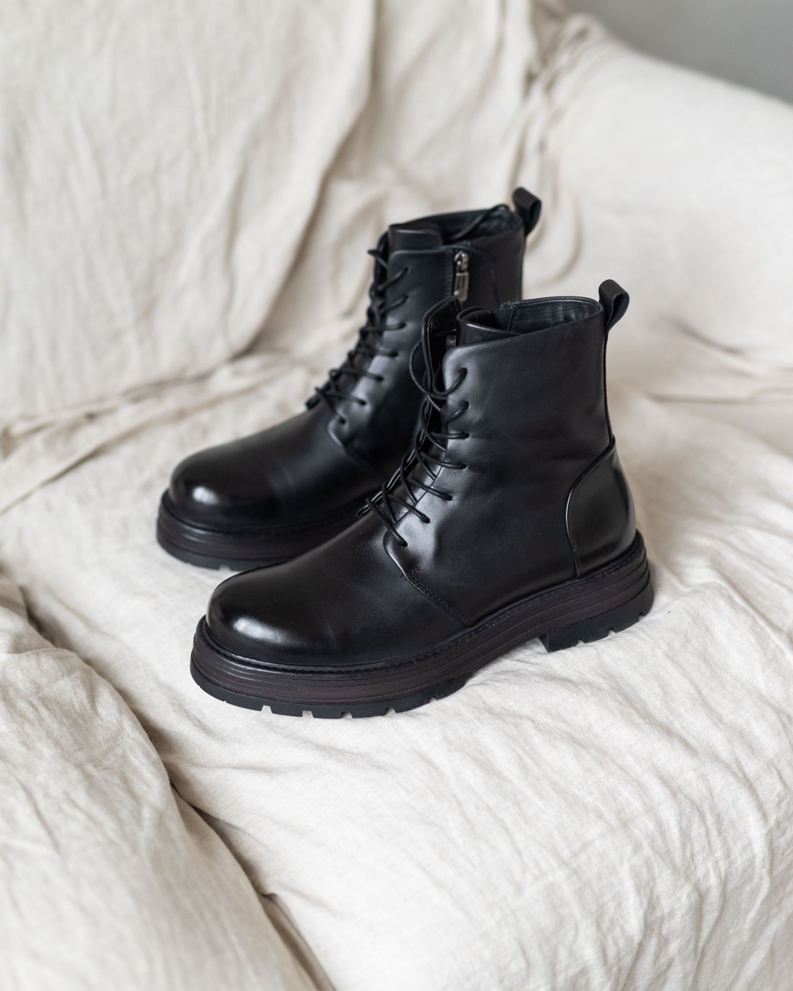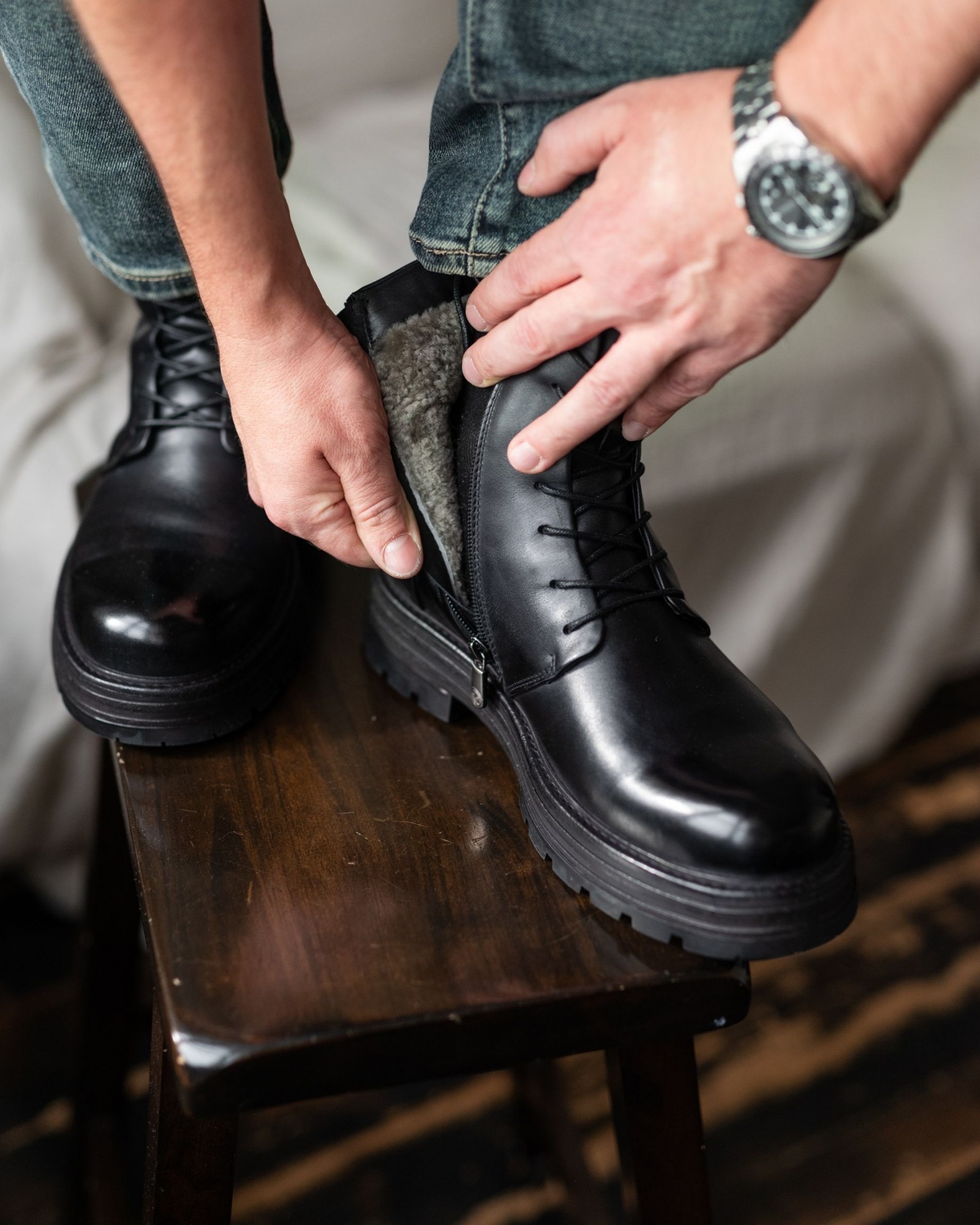 Эти стильные ботинки из глянцевой натуральной кожи — идеальный выбор для зимы. Внутри — натуральный мех, который обеспечивает тепло и комфорт даже в морозы. Удобный замок и шнурки гарантируют лёгкость надевания и плотную фиксацию. Высокий силуэт защищает от снега и холода, а прочная подошва с протектором обеспечивает надёжное сцепление с поверхностью.
