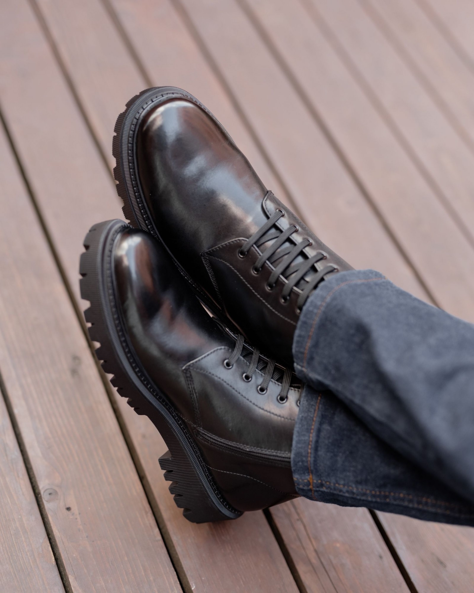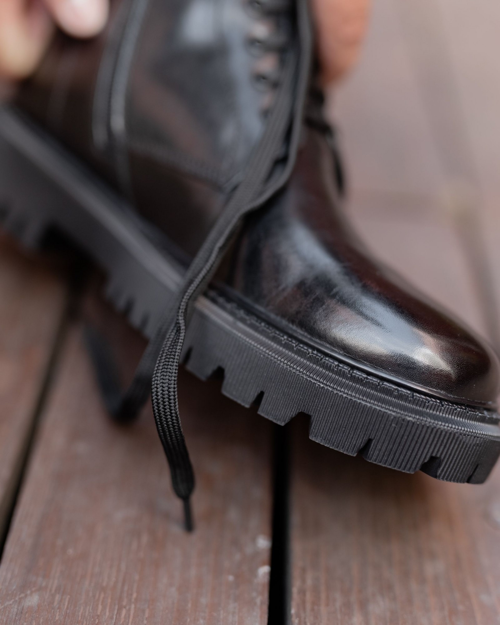 - **Материалы:** Верх выполнен из глянцевой чёрной кожи, которая не только выглядит стильно, но и обладает отличной износостойкостью, защищая от влаги и снега.