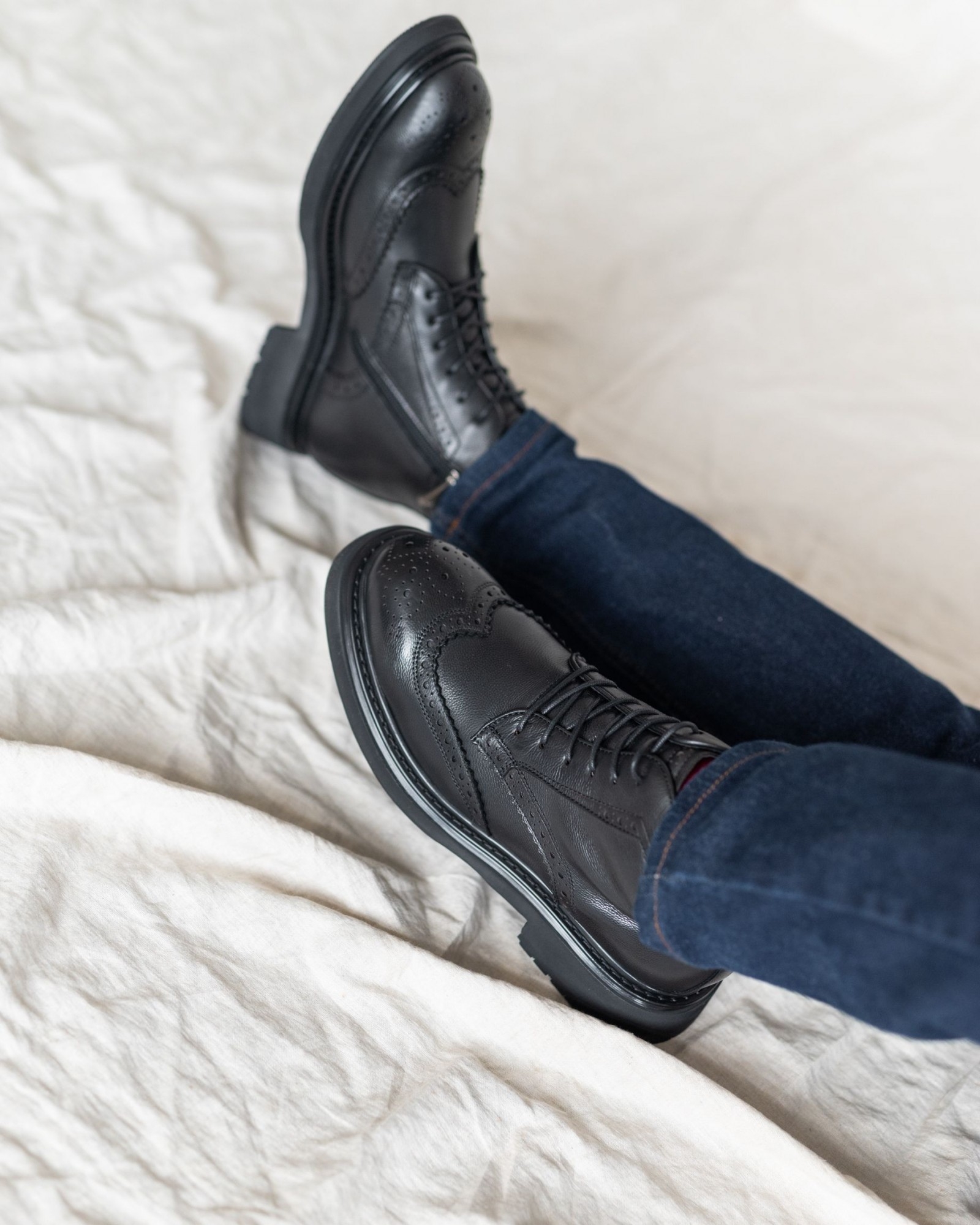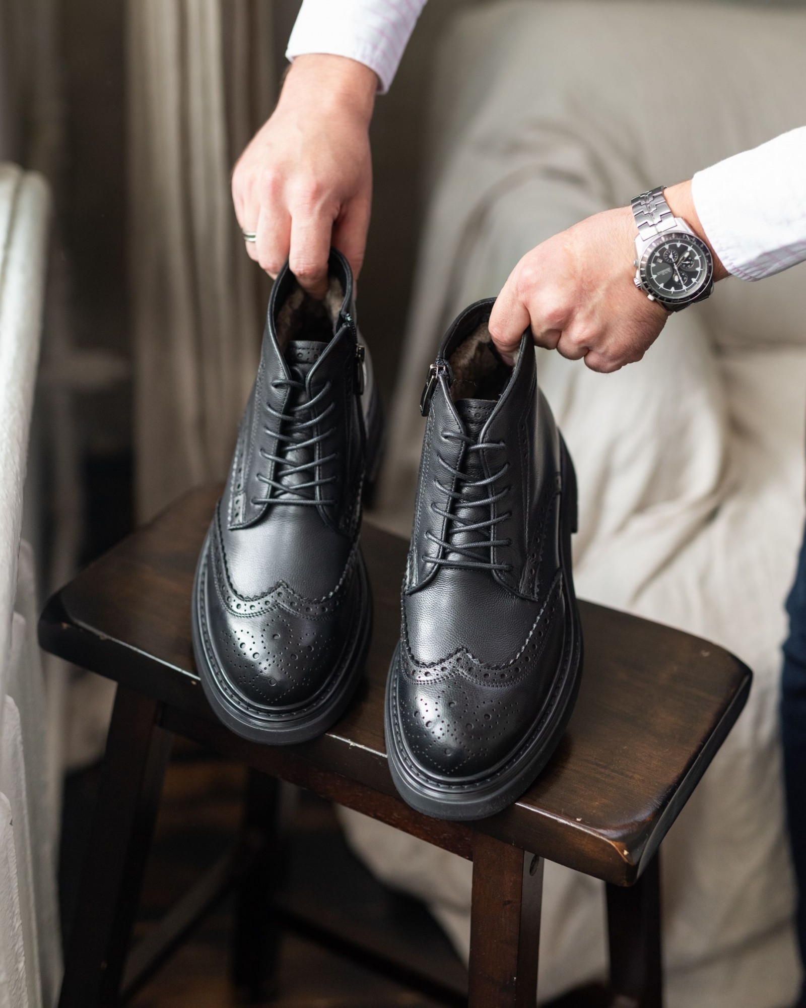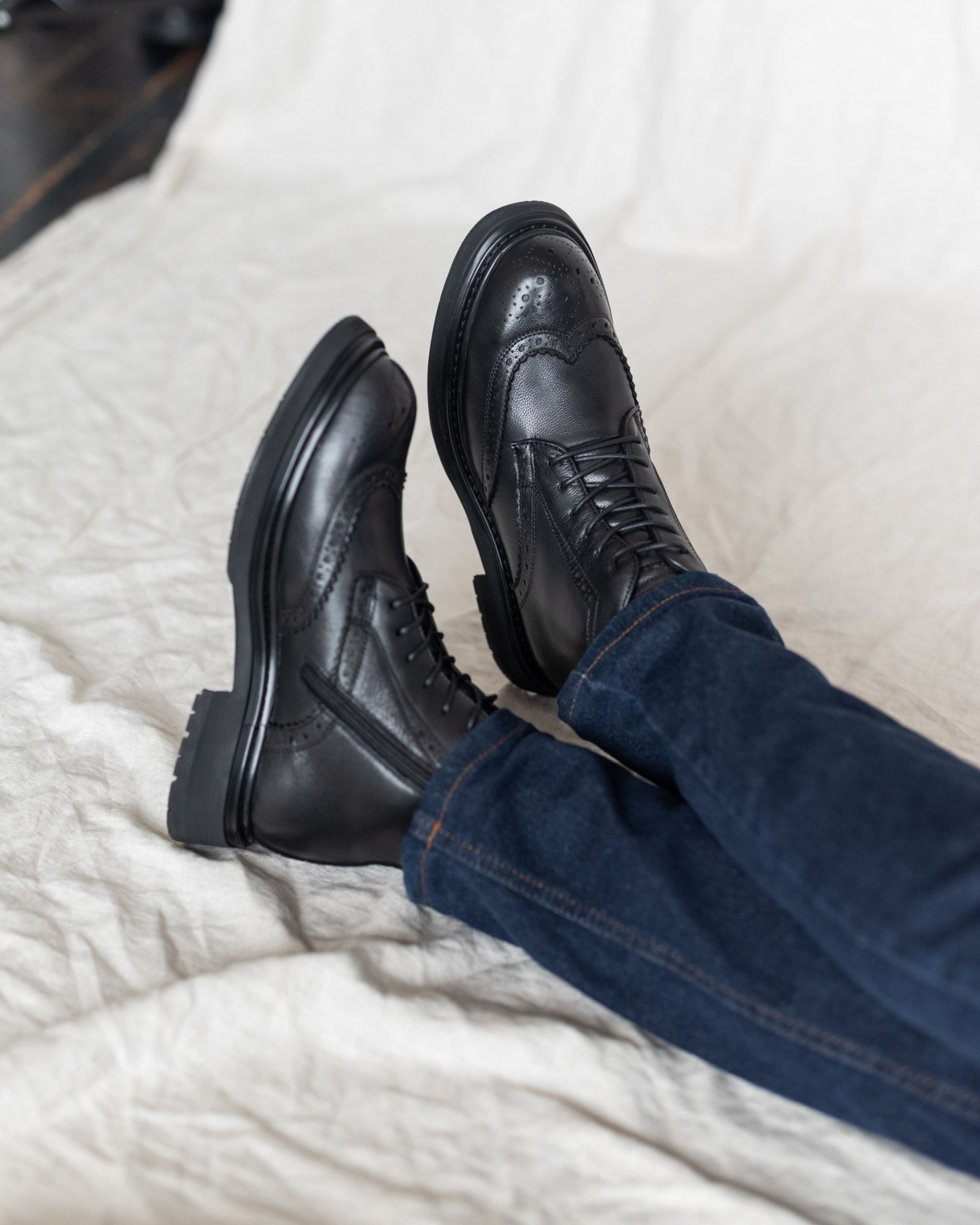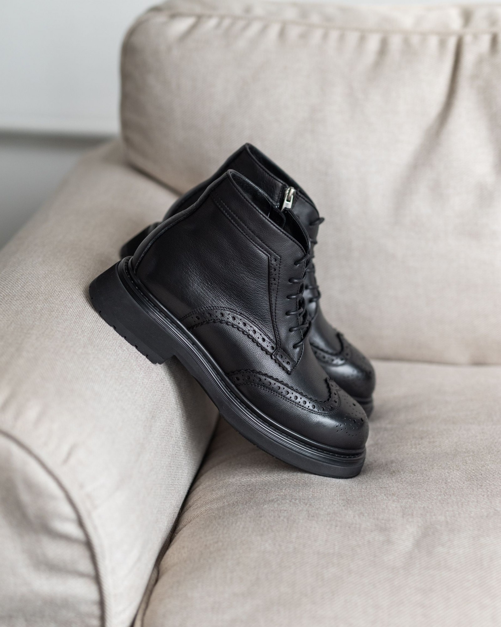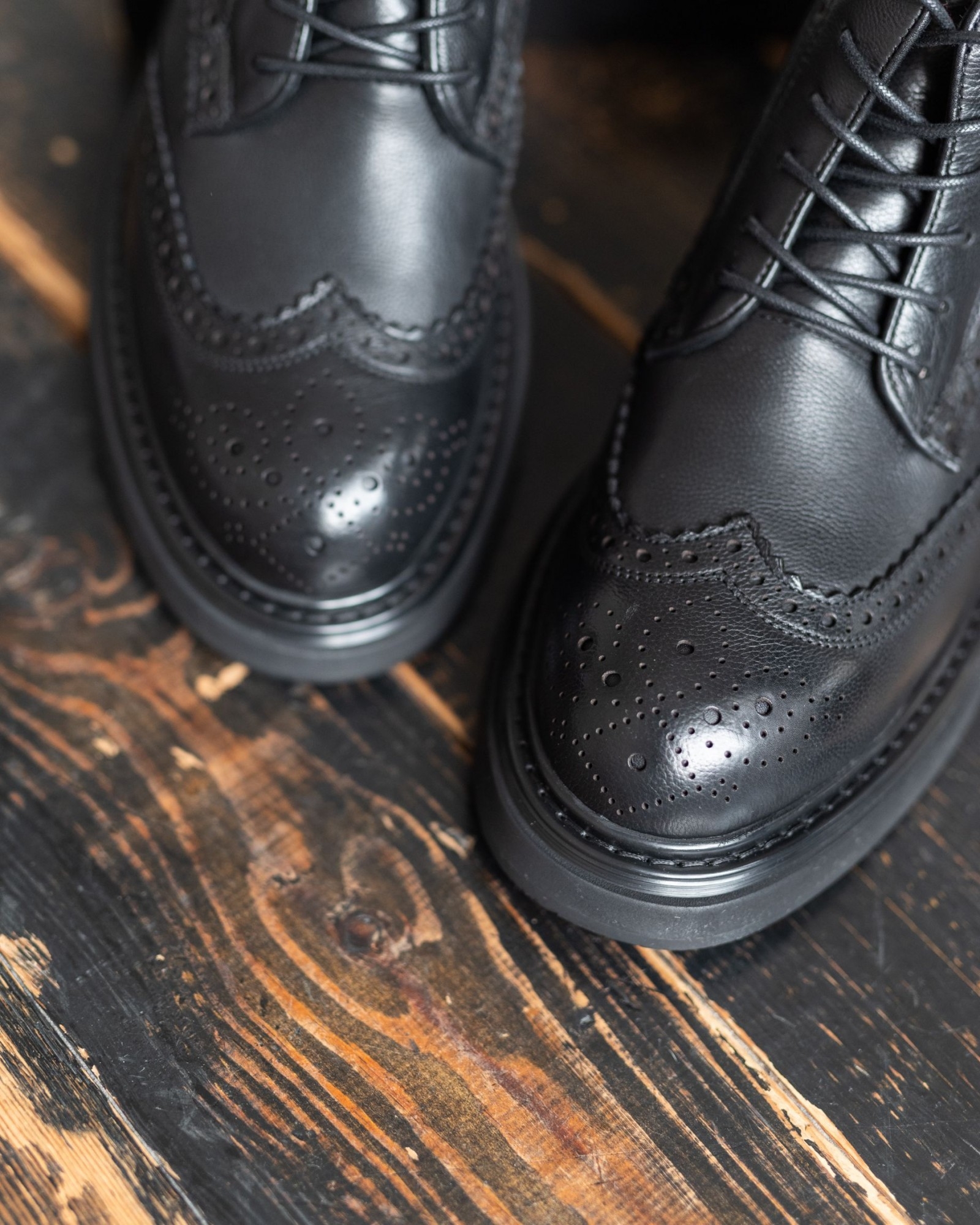 Стильная модель, выполненная из чёрной кожи с крупным классическим узором брогирования. Толстая подошва выглядит выразительно, но остаётся лёгкой, что делает обувь удобной для повседневного ношения. Внутри — подкладка из натурального меха, сохраняющая тепло и создающая дополнительный комфорт в холодное время года.