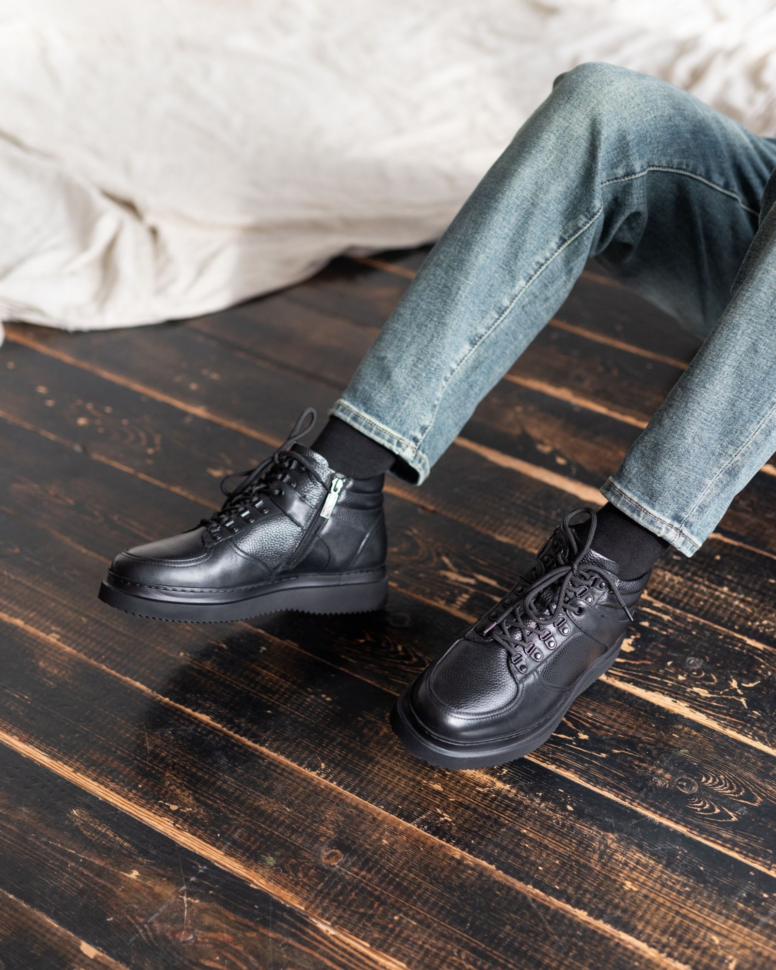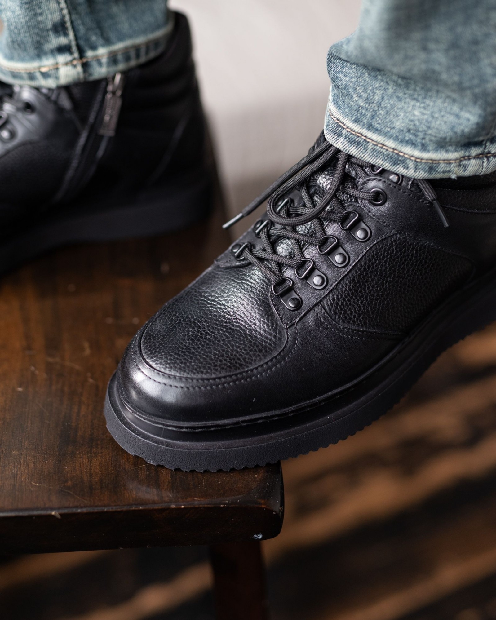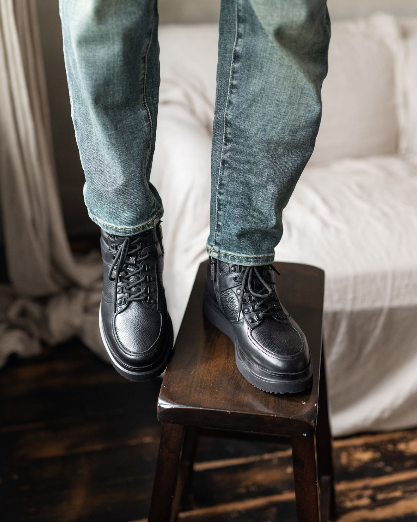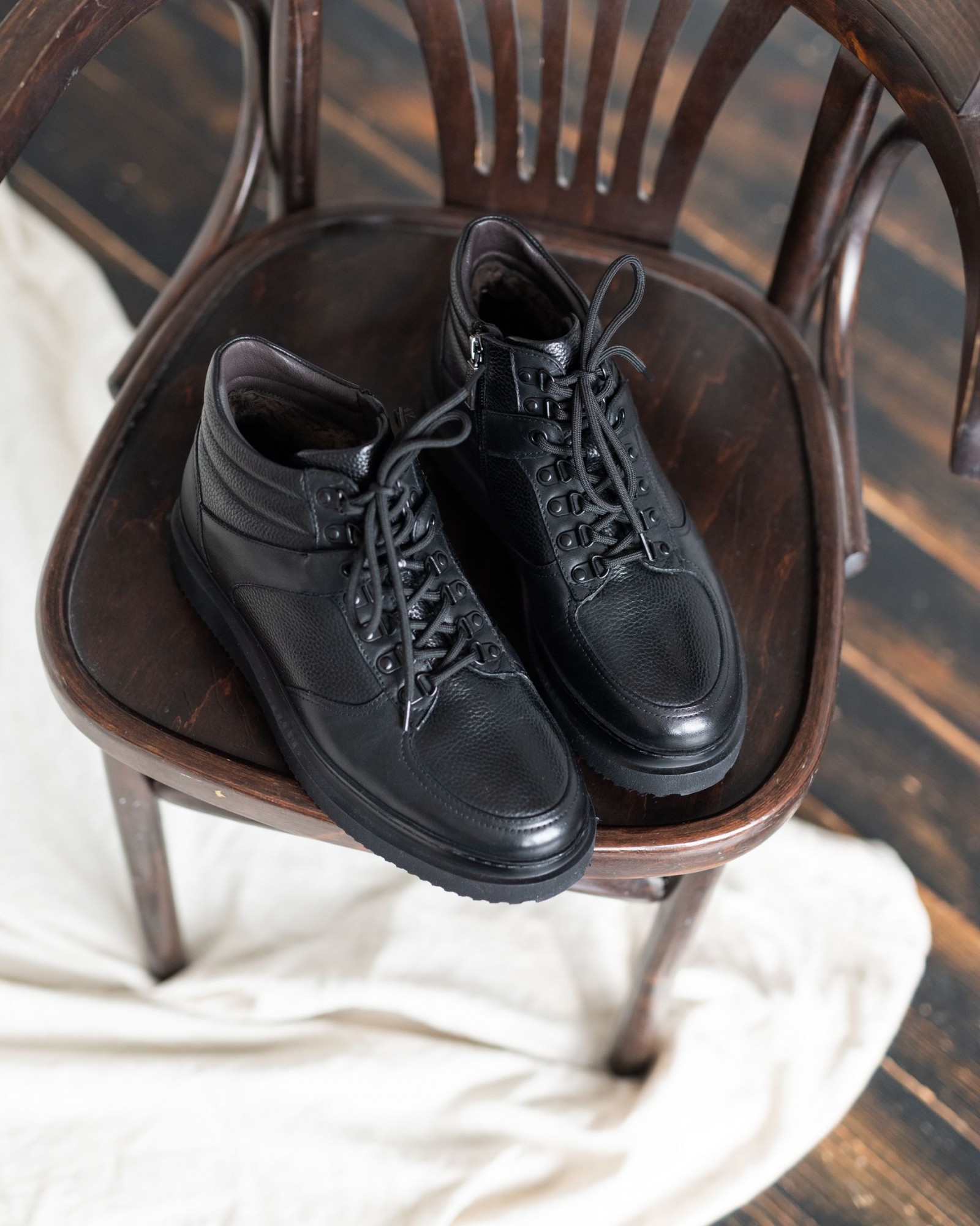 Эта стильная пара сочетает в себе комфорт и брутальный дизайн. Толстая, но лёгкая подошва обеспечивает надёжную амортизацию и защиту от холода, а средняя высота халявы гарантирует свободу движения и отличную посадку. Внутри — натуральный мех, который согреет в морозы. Особое внимание привлекает сочетание шнуровки с металлическими петельками и замка, что делает обувь удобной и эффектной.