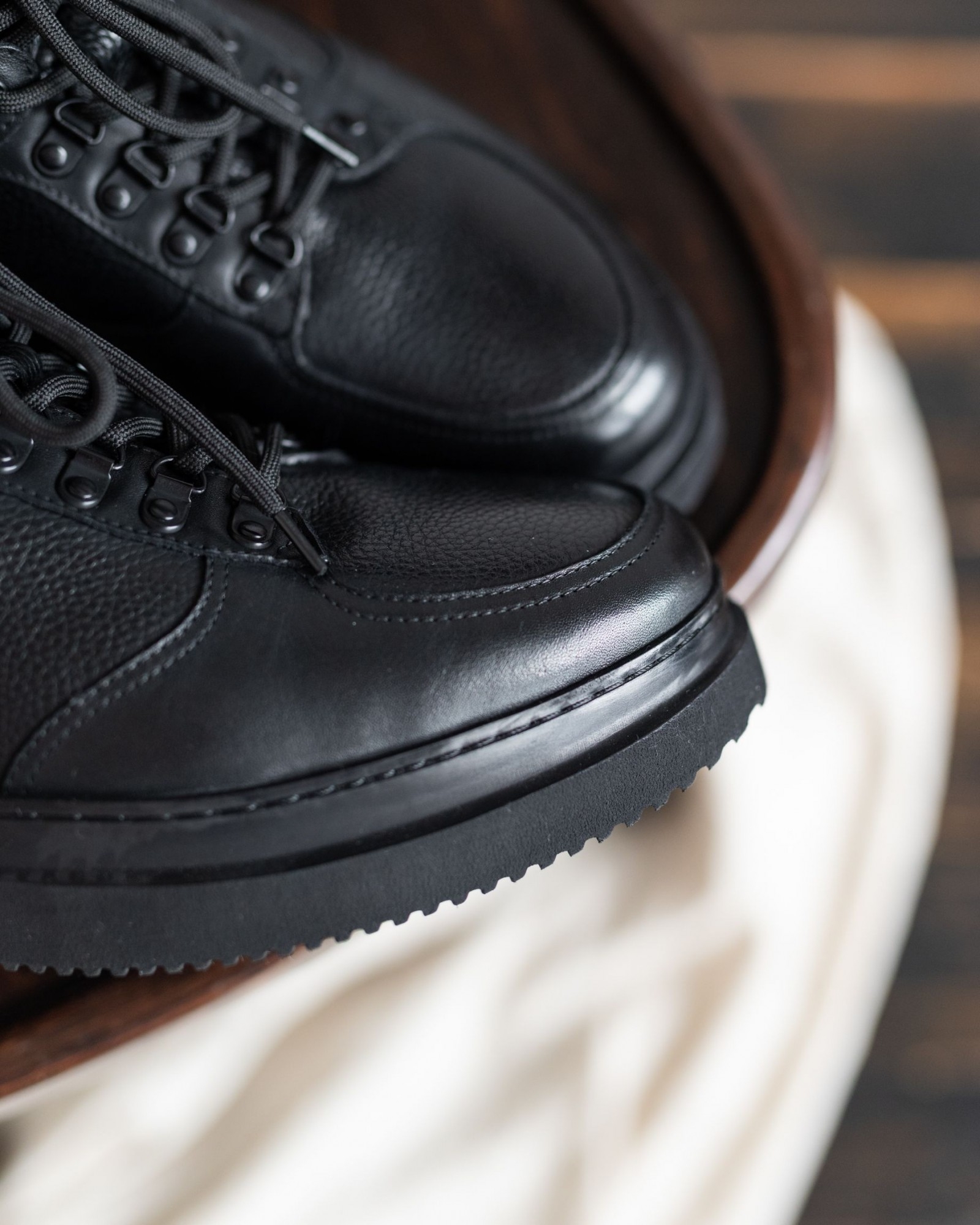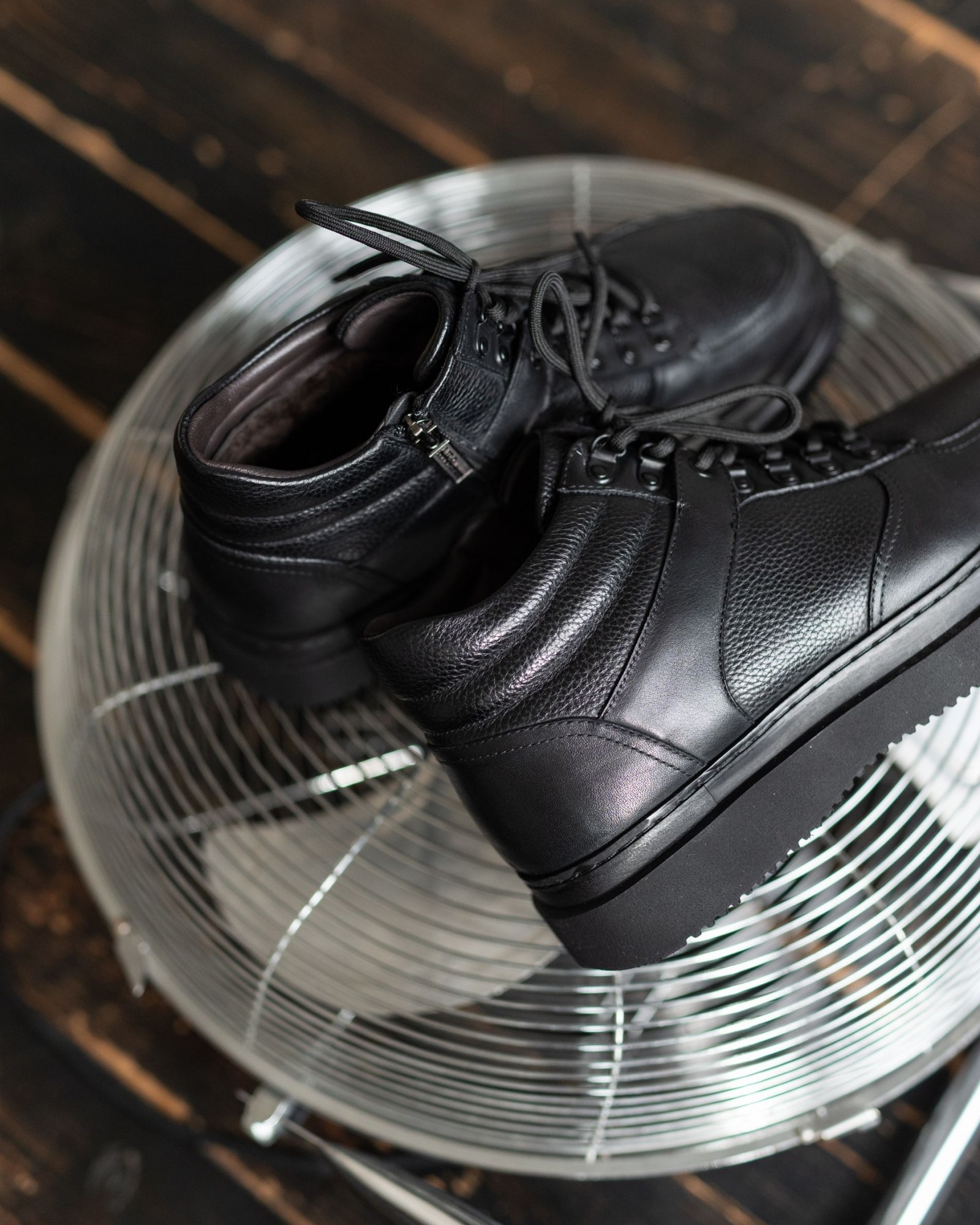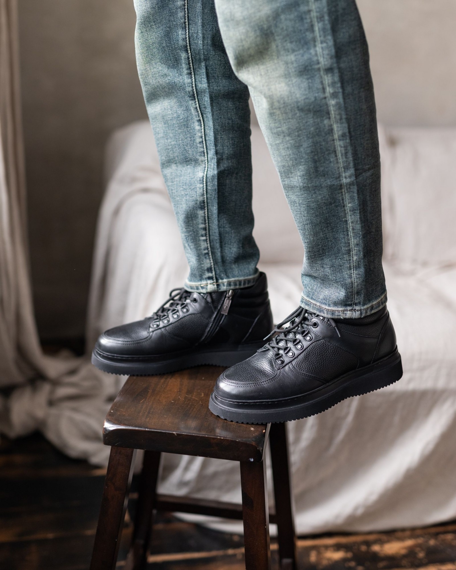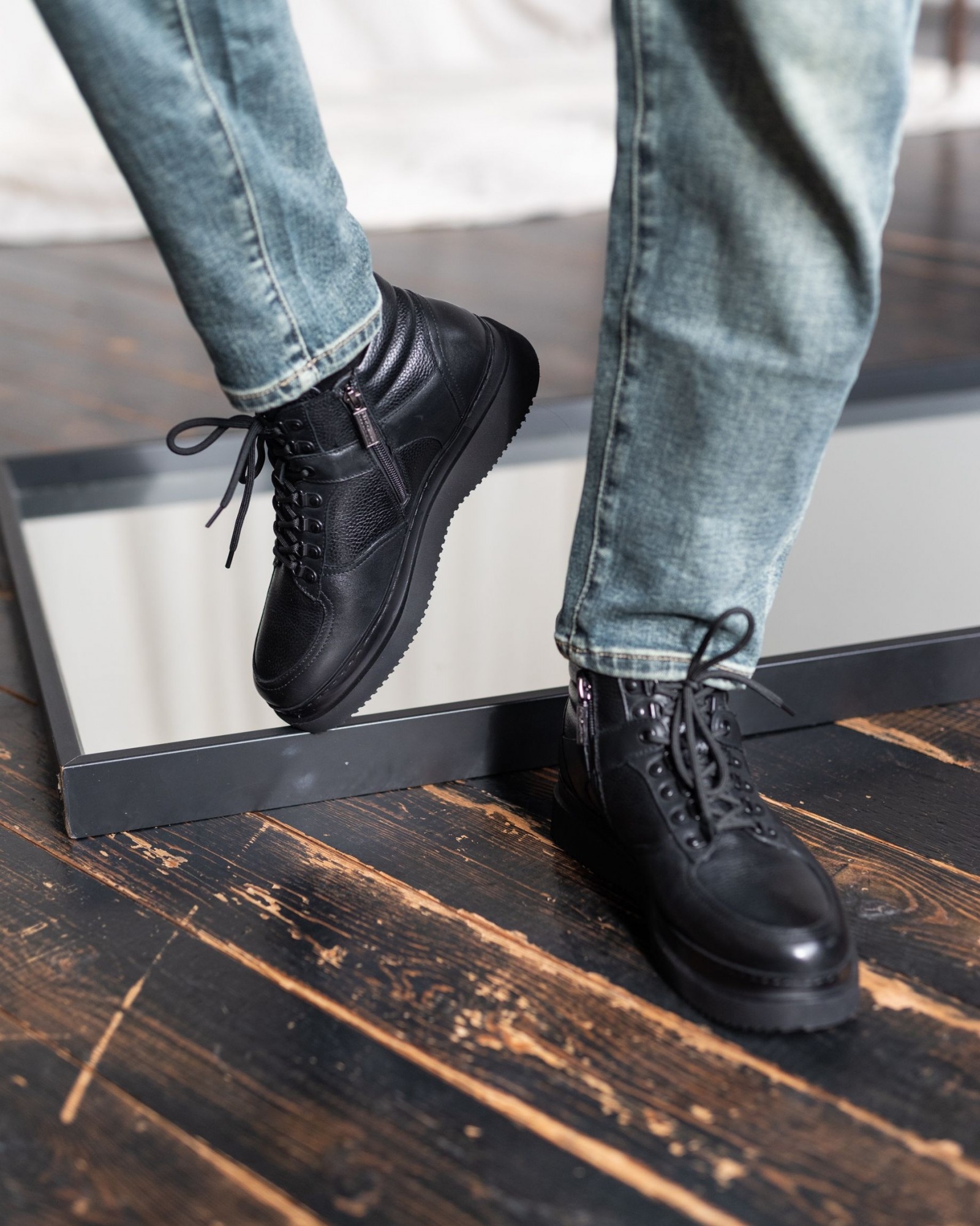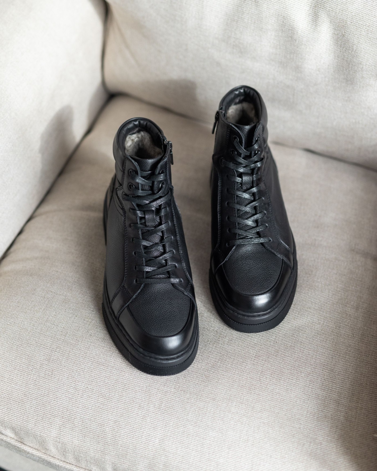 Эта стильная пара сочетает в себе комфорт и брутальный дизайн. Толстая, но лёгкая подошва обеспечивает надёжную амортизацию и защиту от холода, а средняя высота халявы гарантирует свободу движения и отличную посадку. Внутри — натуральный мех, который согреет в морозы. Особое внимание привлекает сочетание шнуровки с металлическими петельками и замка, что делает обувь удобной и эффектной.