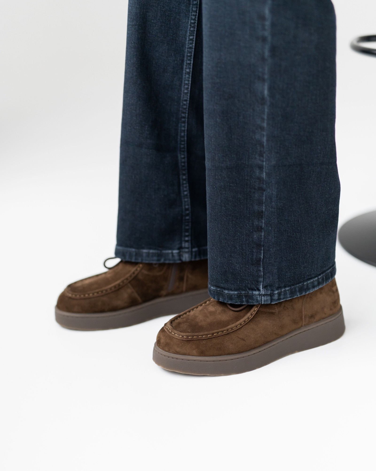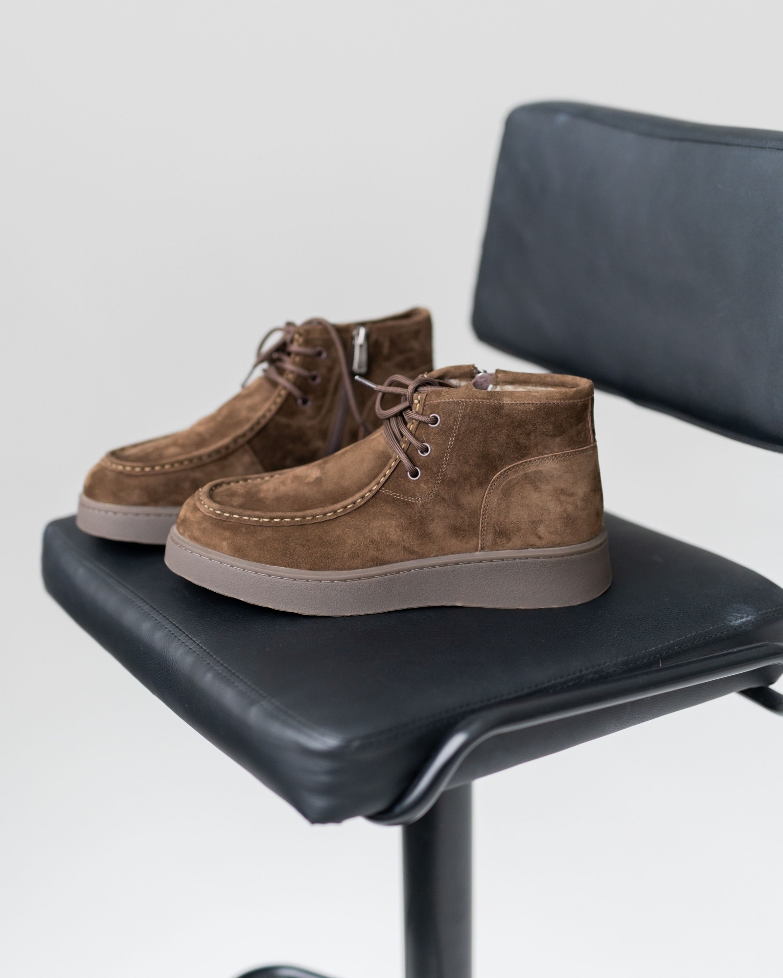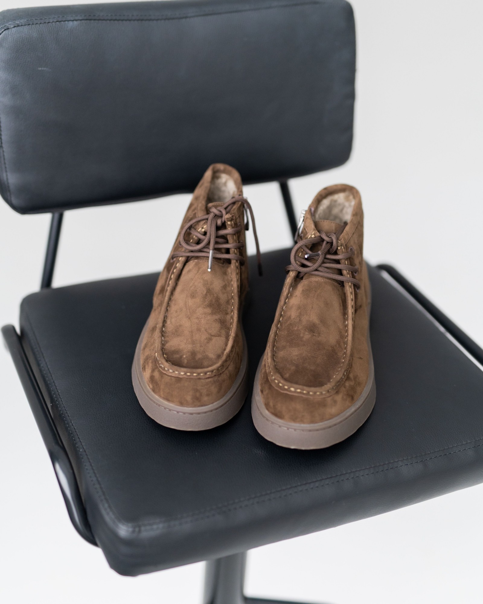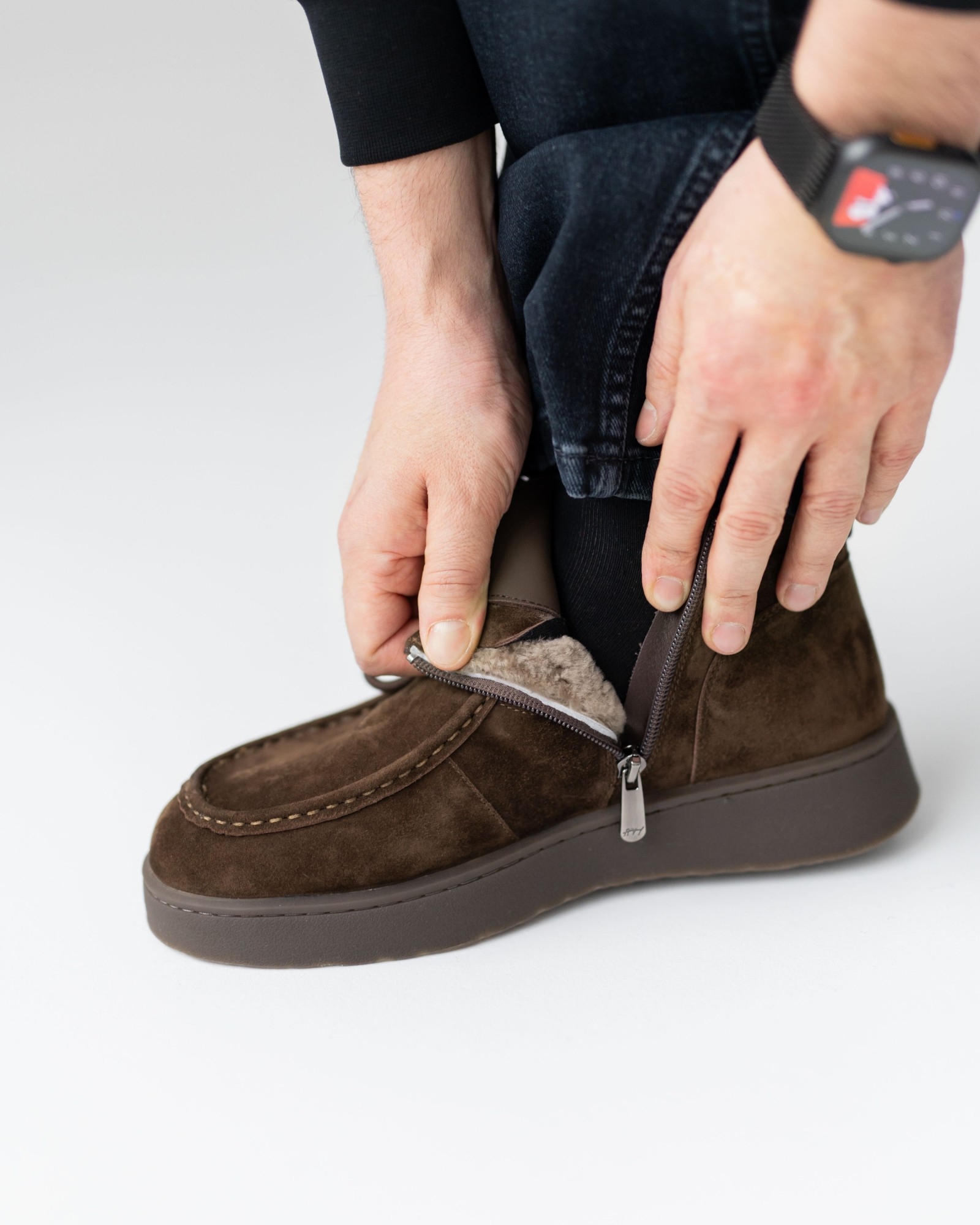 Мягкие зимние полуботинки из коричневой замши с подкладкой из натурального меха — тепло, комфорт и элегантность в одном. Форма слегка напоминает бурочки, а шнуровка вместе с замком на внутренней стороне делает надевание быстрым и удобным. Натуральный мех сохраняет ноги в тепле даже в самые холодные дни, а качественная замша придаёт паре премиальный вид и долговечность. Лёгкая, устойчиво сбалансированная подошва обеспечивает уверенный шаг на любой поверхности. Приходите на примерку — оцените комфорт и стиль вживую и убедитесь, что эта пара создана именно для вас!