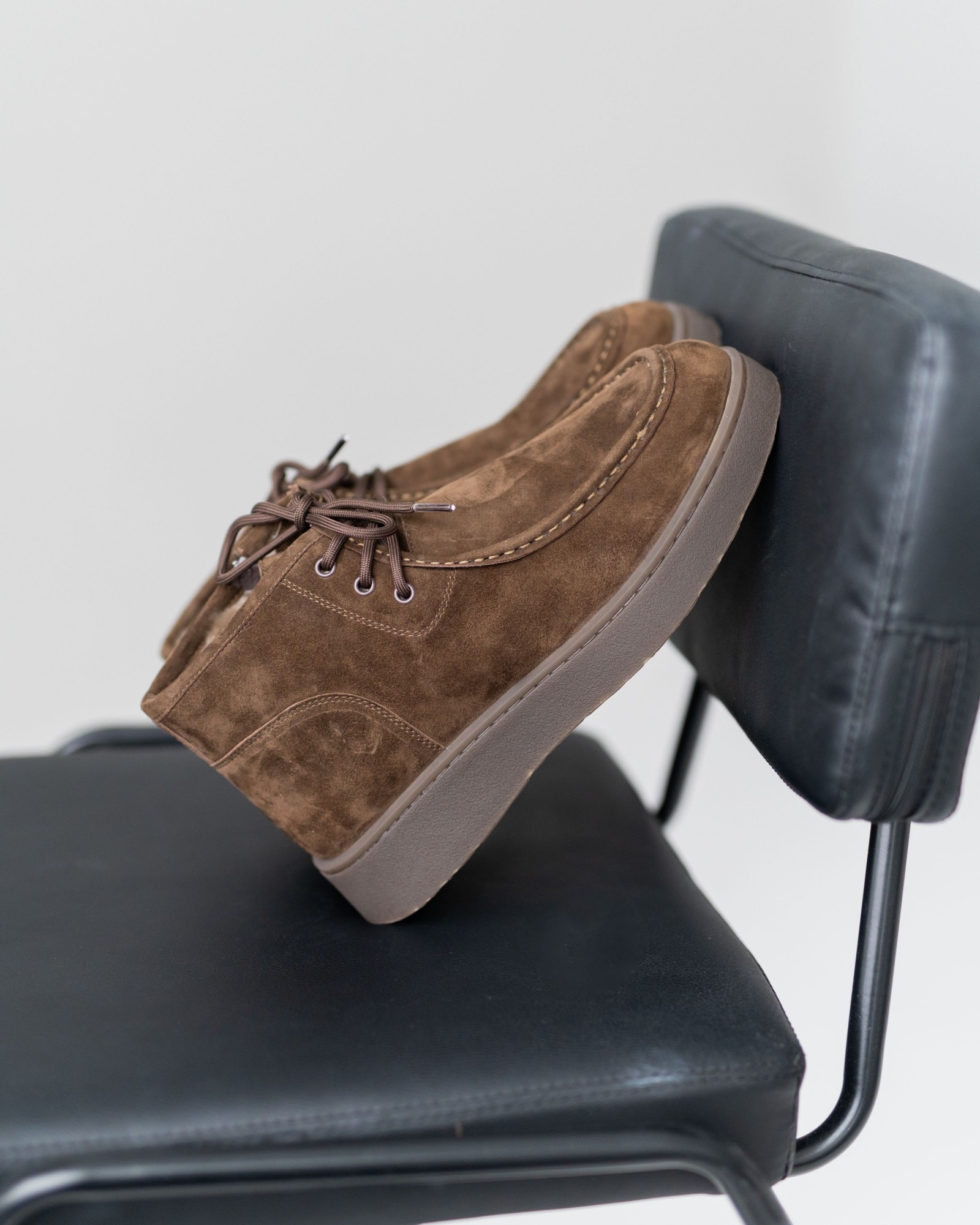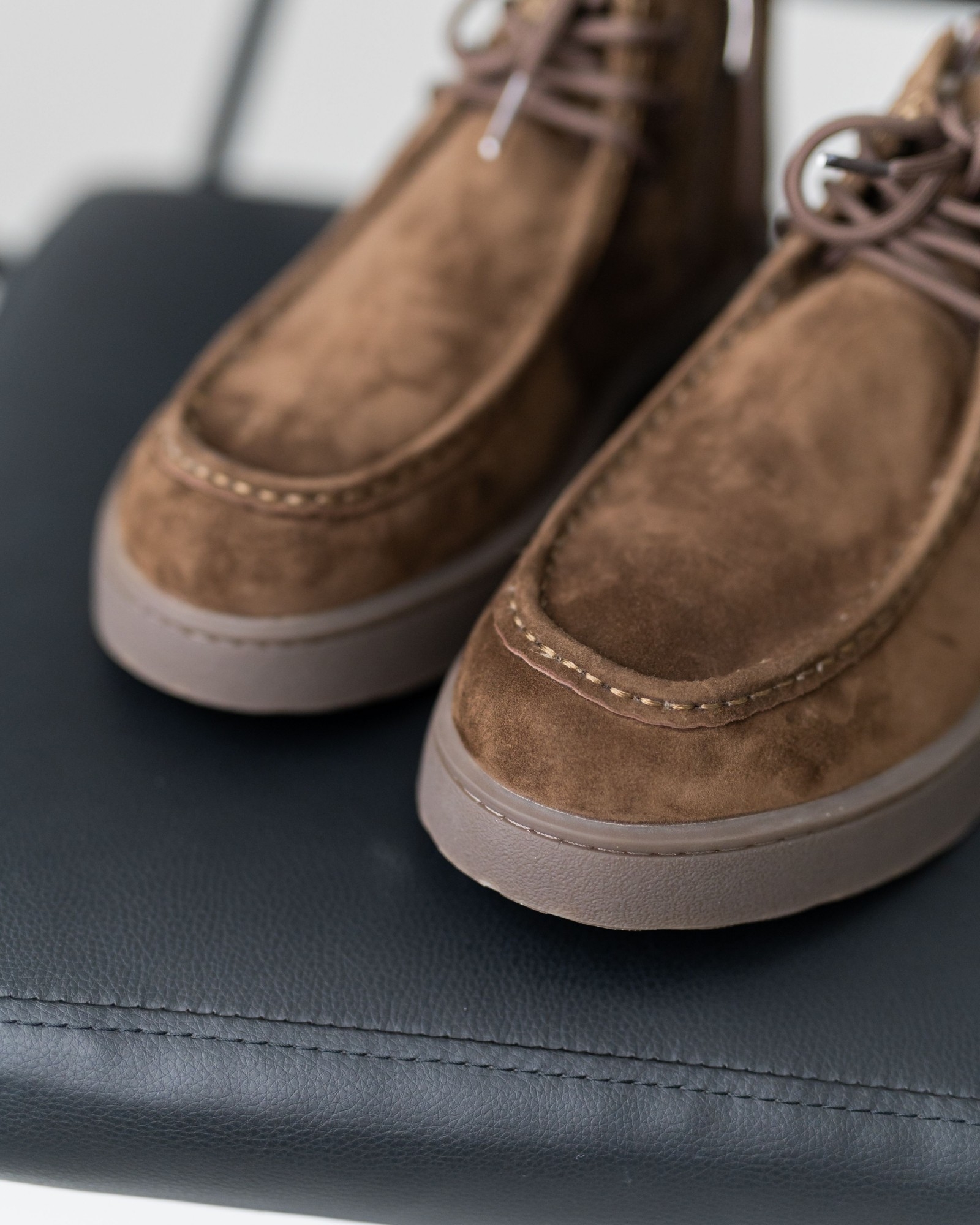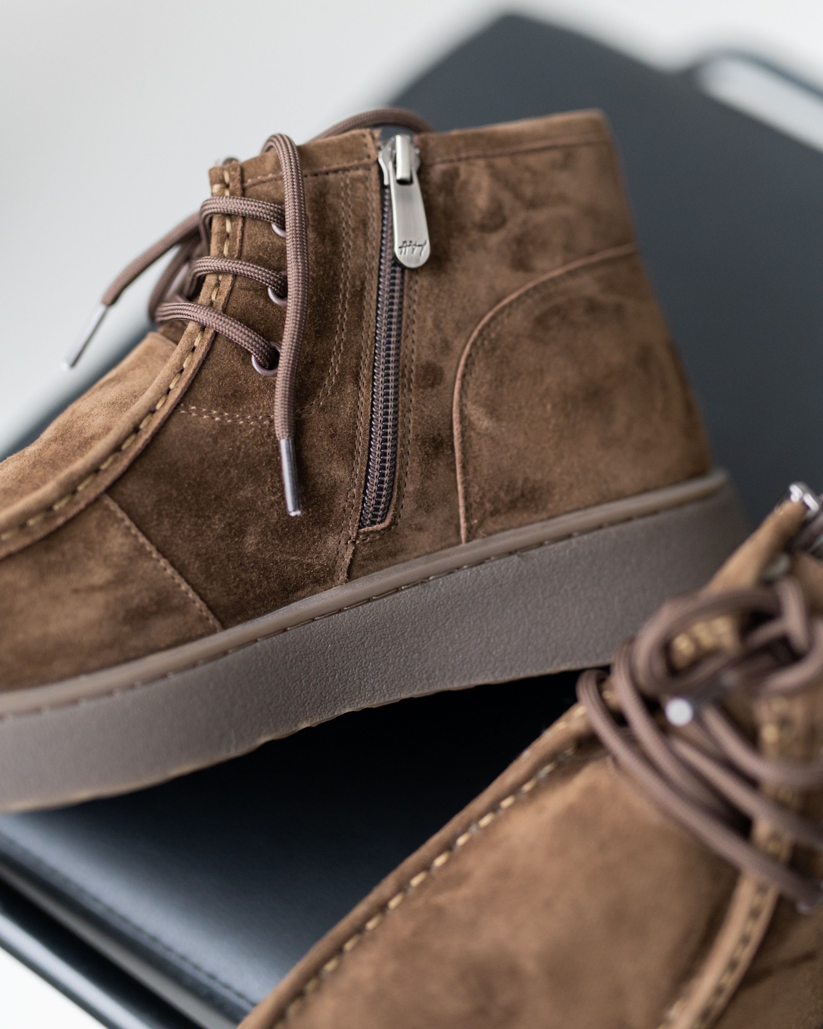 Мягкие зимние полуботинки из коричневой замши с подкладкой из натурального меха — тепло, комфорт и элегантность в одном. Форма слегка напоминает бурочки, а шнуровка вместе с замком на внутренней стороне делает надевание быстрым и удобным. Натуральный мех сохраняет ноги в тепле даже в самые холодные дни, а качественная замша придаёт паре премиальный вид и долговечность. Лёгкая, устойчиво сбалансированная подошва обеспечивает уверенный шаг на любой поверхности. Приходите на примерку — оцените комфорт и стиль вживую и убедитесь, что эта пара создана именно для вас!